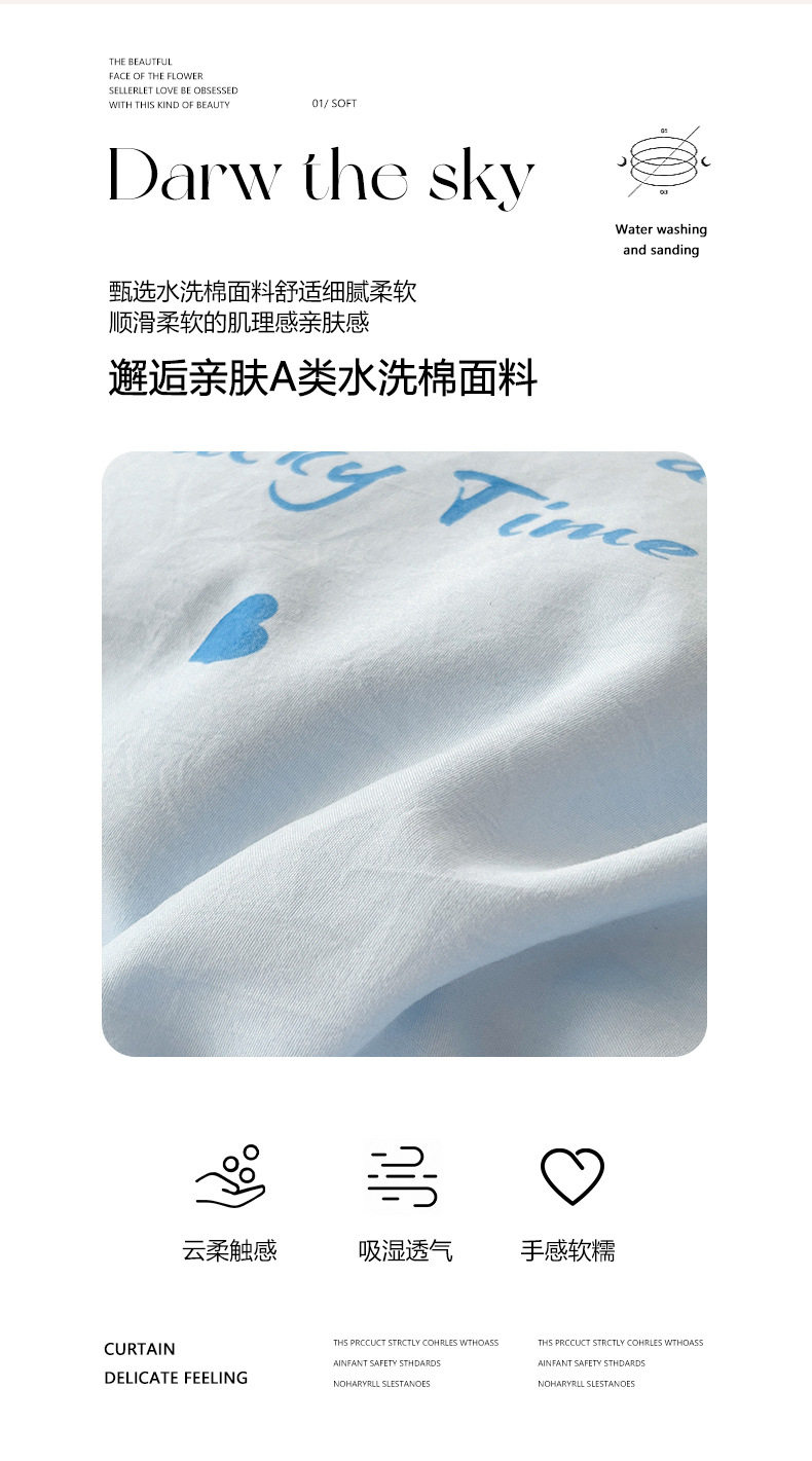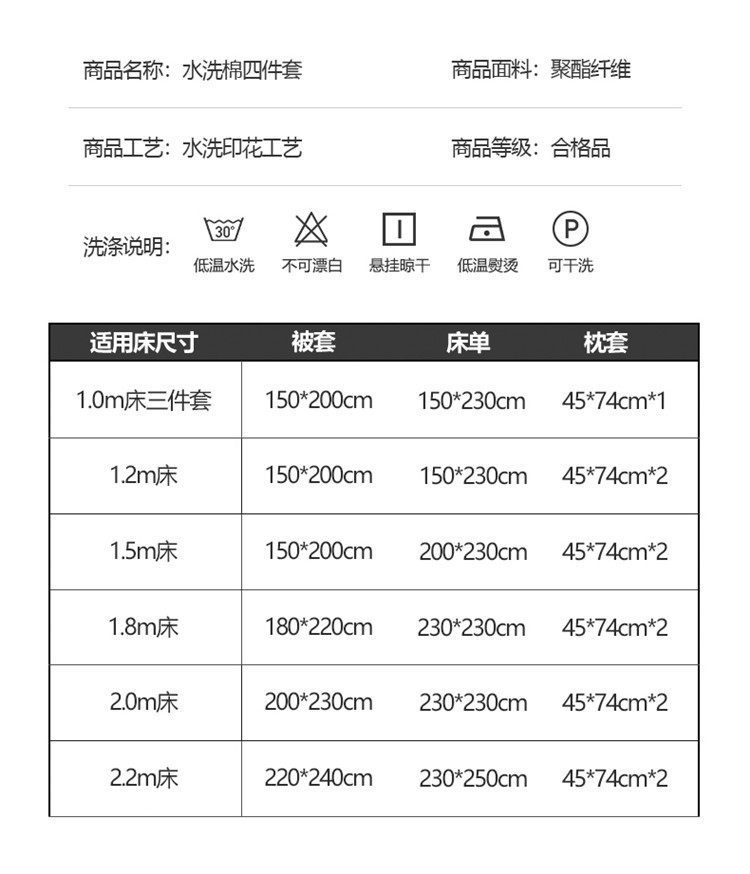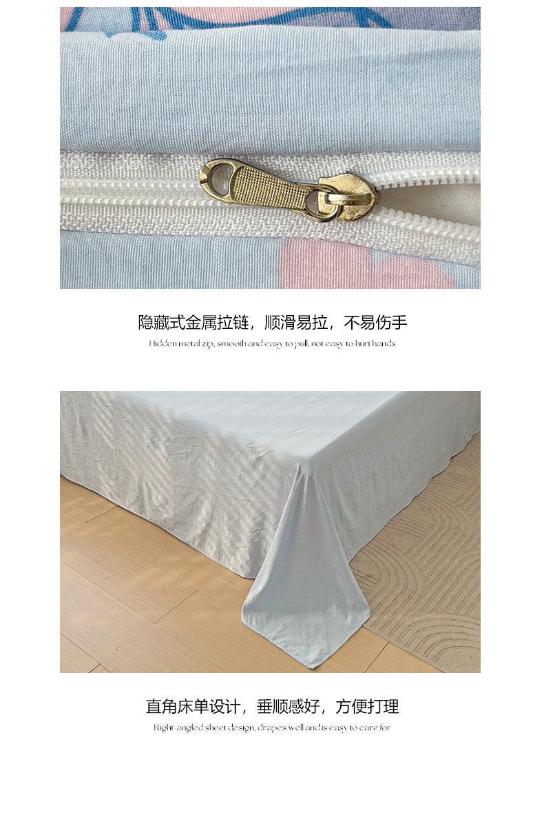 | Dimensions | 1.2m bed sheet three-piece set [quilt cover 150*200cm],1.5m bed sheet four-piece set [quilt cover 150*200cm],1.8m bed sheet four-piece set [180*220cm],2.0m bed sheet four-piece set [quilt cover 200*230cm],2.2m bed sheet four-piece set [quilt cover 220*240cm] |