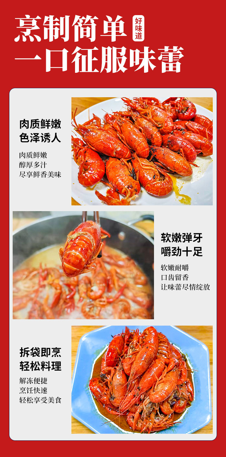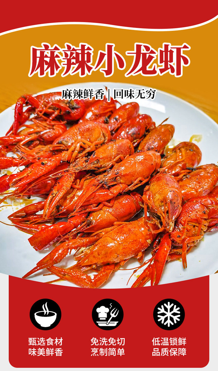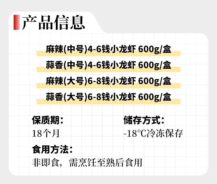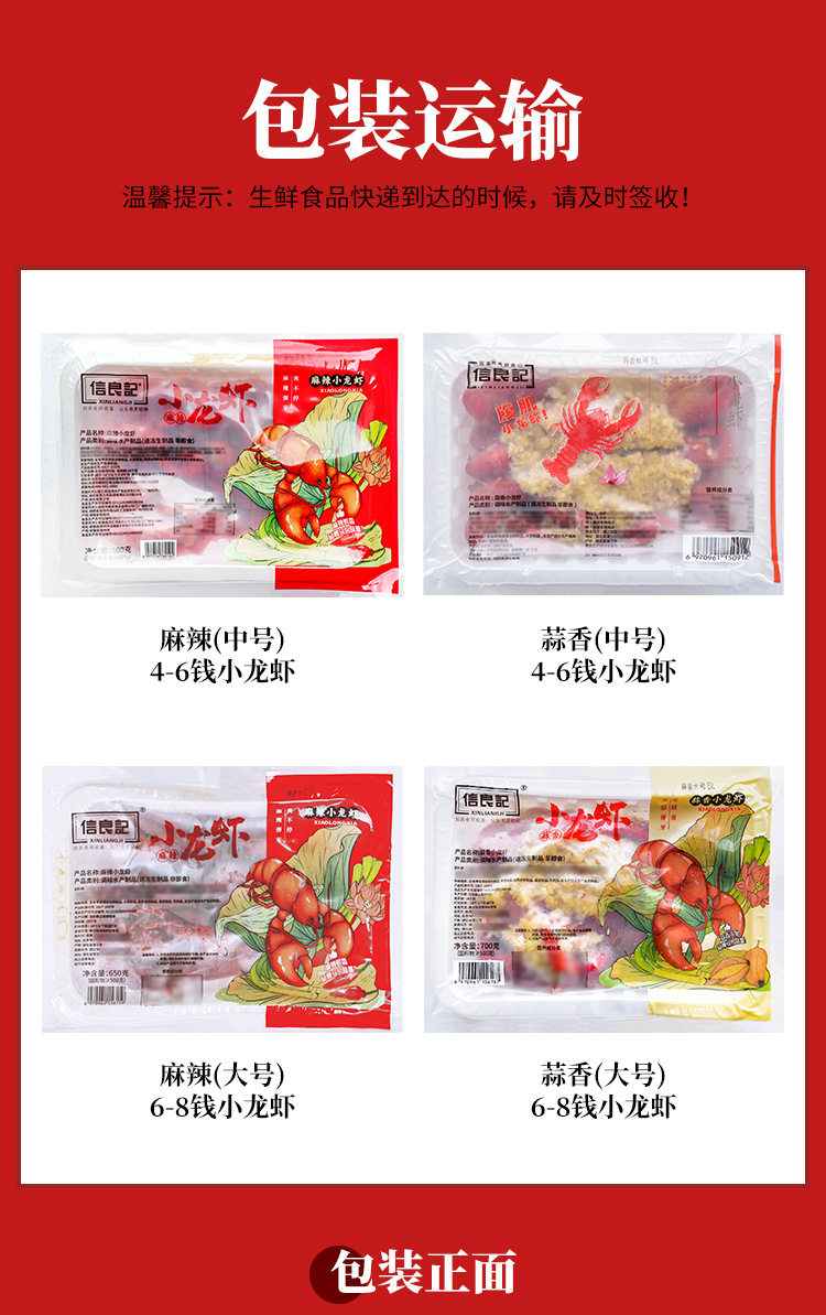 | Packaging specifications | Xinliangji spicy (medium size) 4-6 money crayfish 600g*1 box,Xinliangji garlic (medium size) 4-6 money crayfish 600g*1 box,Xinliangji spicy (large size) 6-8 money crayfish 600g*1 box,Xinliangji garlic (large size) 6-8 money crayfish 600g*1 box,Xia ba spicy (medium size) 4-6 money crayfish 600g*1 box,Xiaaba garlic flavor (medium size) 4-6 yuan crayfish 600g*1 box,Xinliangji label garlic crayfish 600g*1 box,Xinliangji spicy crayfish 600g*1 box |