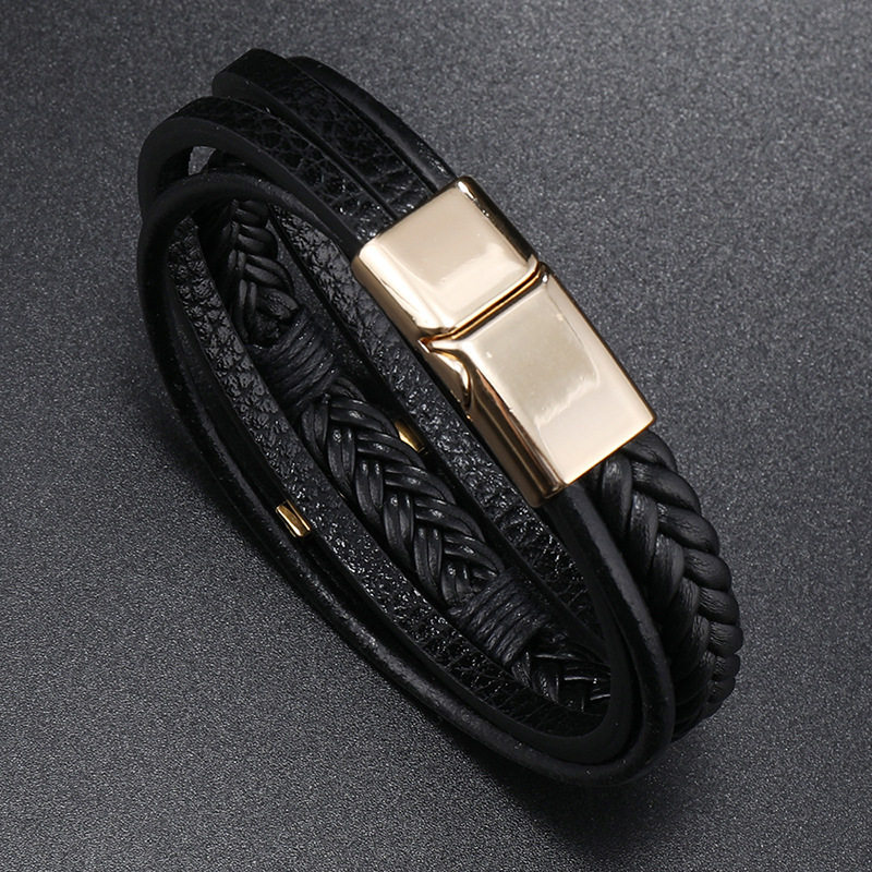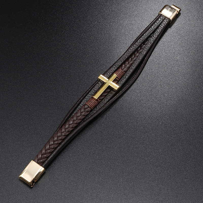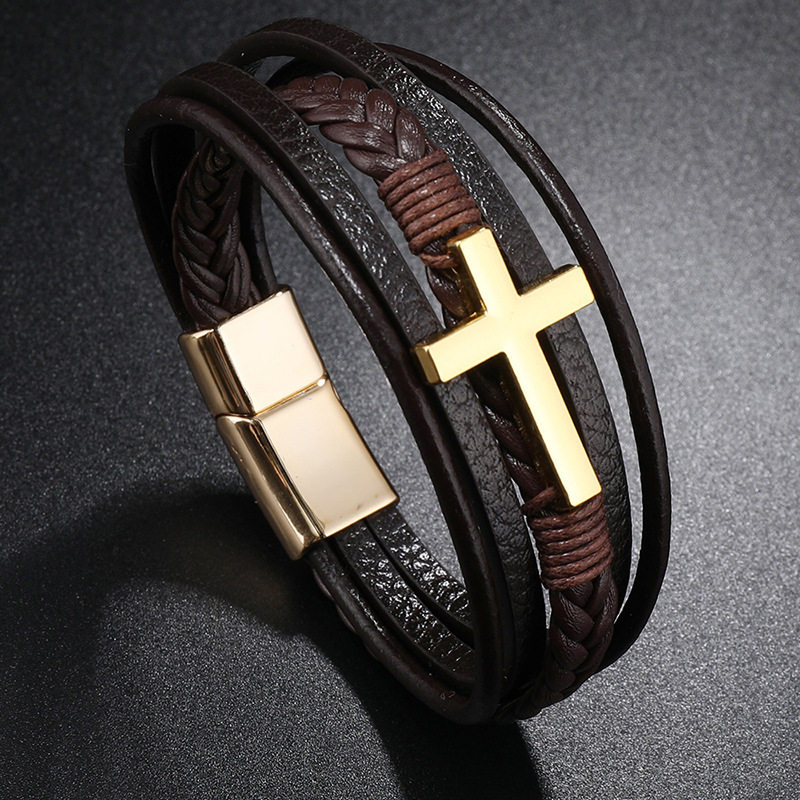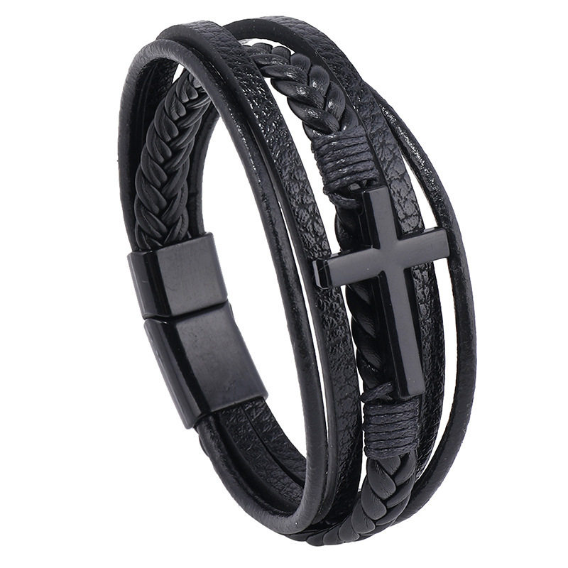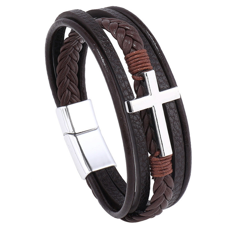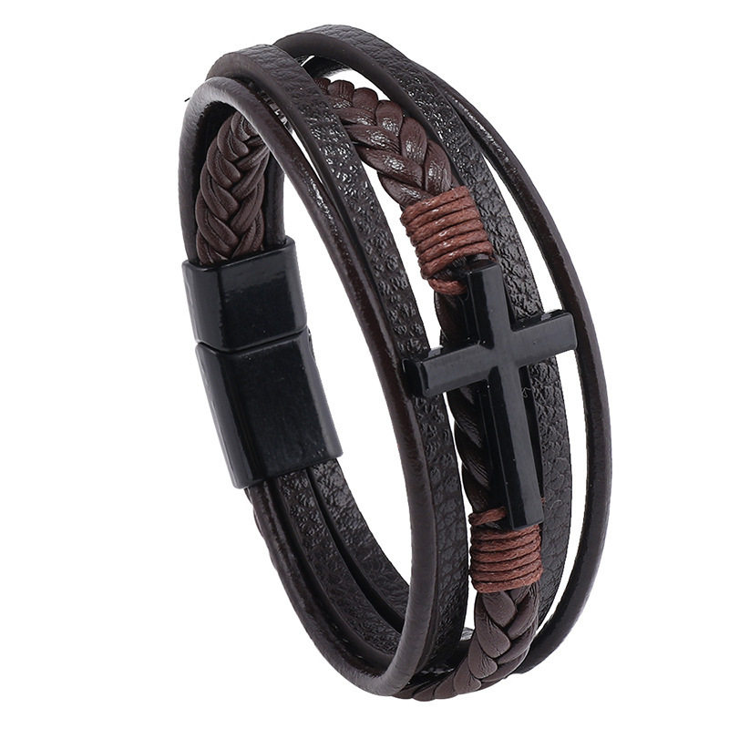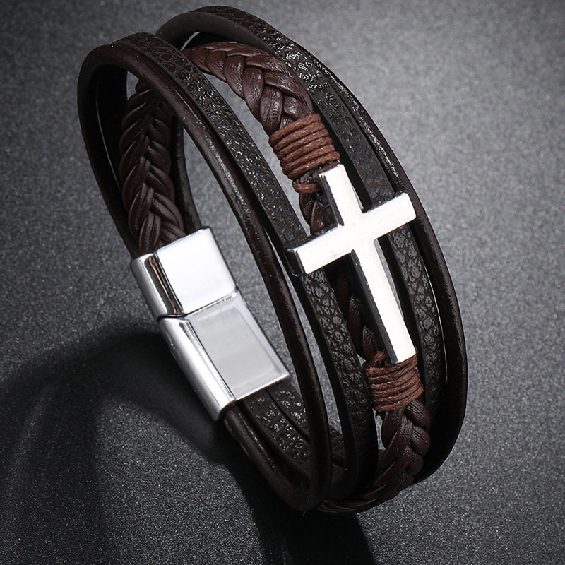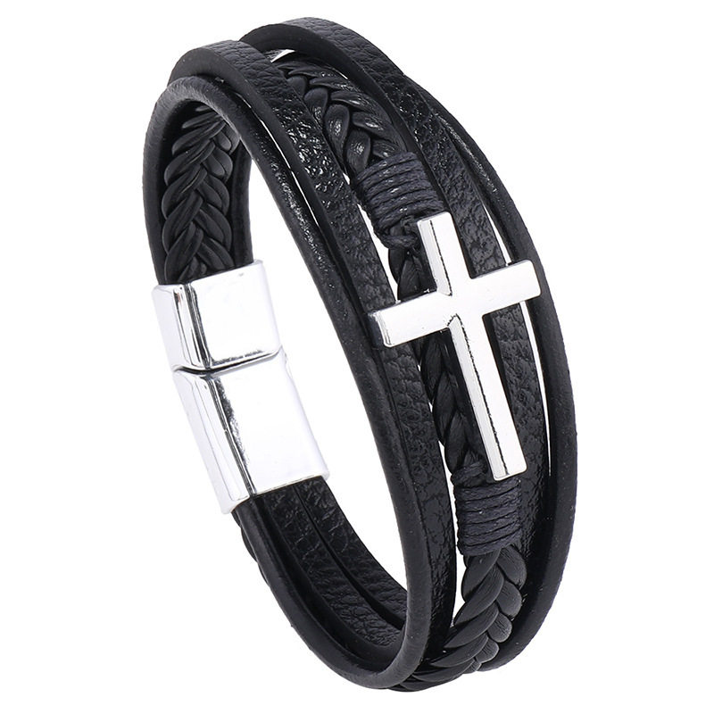 Europe and the United States hot new cross vintage leather bracelet men's multi-layer hand woven rope magnet buckle PU bracelet