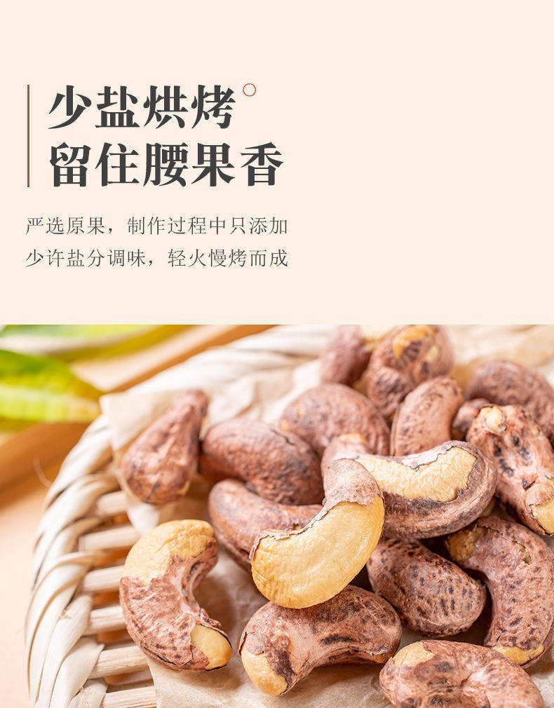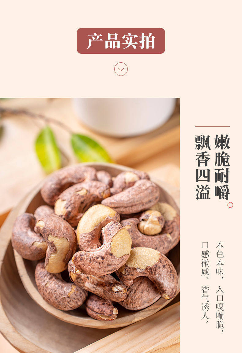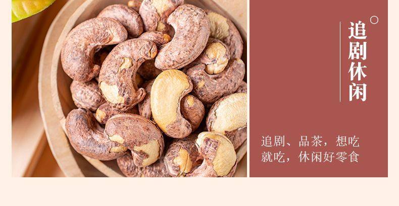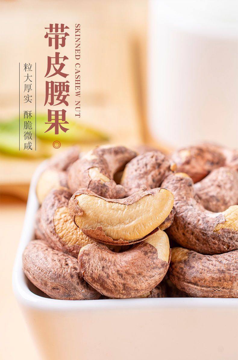 | Packaging specifications | One bag of cashew nuts with skin, net weight 250g,Two bags of cashew nuts with skin, net weight 500g,Four bags of cashew nuts with skin, net weight 1000g,Ten bags of cashew nuts with skin, net weight 2500g,Net weight of a jar of cashew nuts with skin 150g,Two cans of cashew nuts with skin, net weight 300g,Four cans of cashew nuts with skin, net weight 600g,Cashew nut tasting pack with skin, net weight 50g per bag,Cashew nut tasting pack with skin, two bags, net weight 100g |