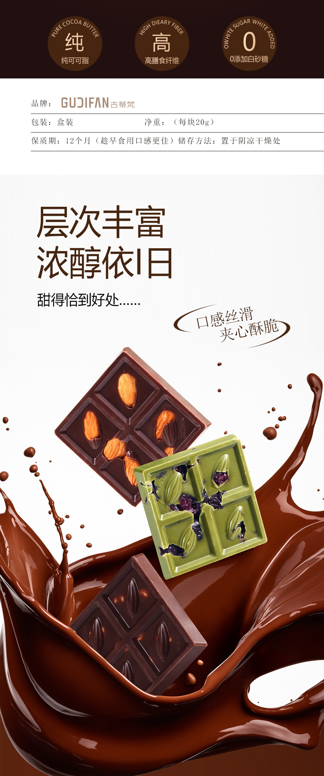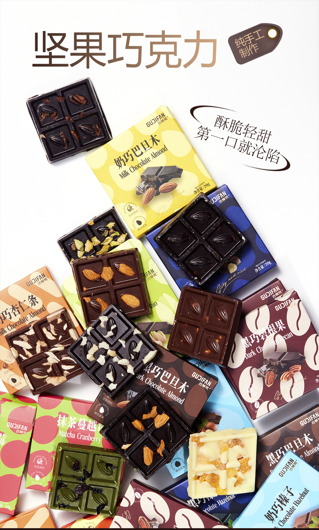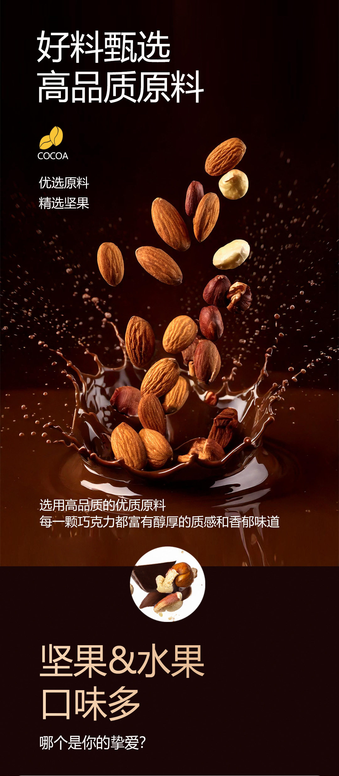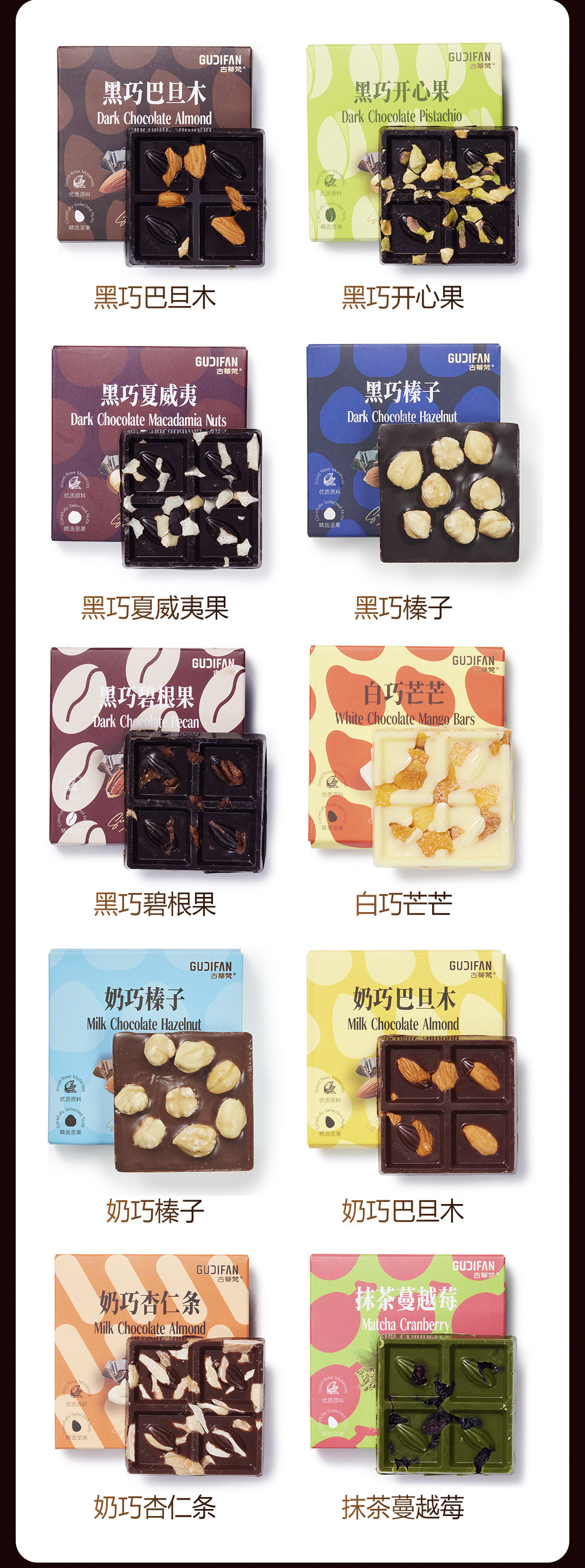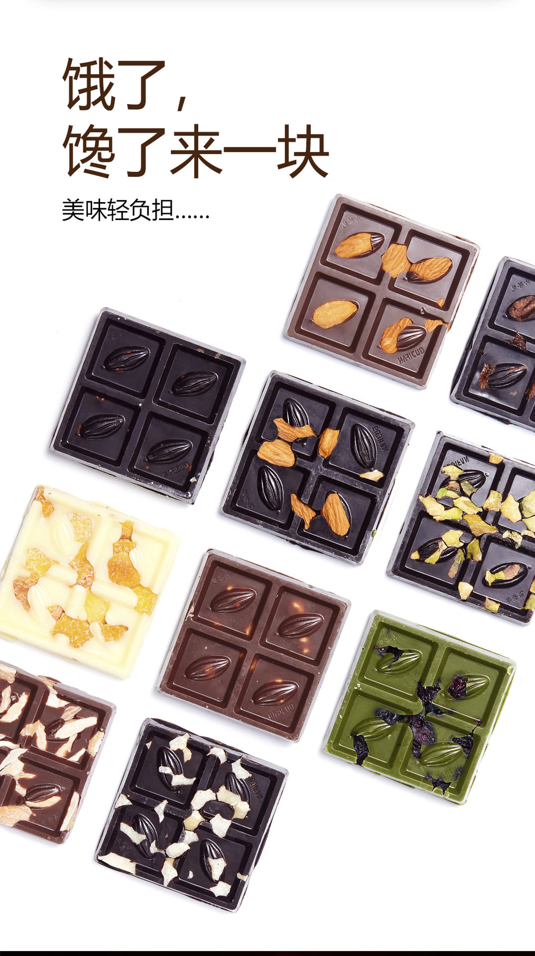 | Packaging specifications | Black hazelnut 20g box,Black chocolate hawaii 20g box,Black pecan 20g box,Black almond 20g box,Black pistachio 20g box,Naiqiao almond wood 20g box,Naiqiao hazelnut 20g box,Naiqiao almond bars 20g box,White qiaomangmang 20g box,Matcha cranberry 20g box,White qiao almond strips 500g in bulk,Naiqiao almond strips 500g in bulk,Black almond strips 500g in bulk,20g box 100% black chocolate,20g box 88% black chocolate,20g box of 75% black chocolate,20g box 58% black chocolate,20g boxed white chocolate,20g boxed matcha chocolate,Bulk 500g pistachio dark chocolate,Bulk 500g hawaiian dark chocolate,Bulk 500g pecan dark chocolate,Bulk 500g hazelnut dark chocolate,Bulk 500g cashew dark chocolate,Douyin’s popular long chocolate bars need to be customized by contacting customer service,4 square grid pvc gift box,9 square grid pvc gift box,12-square pvc gift box (comes with handbag),18-square pvc gift box (comes with handbag),85%20g boxed chocolate,35%20g boxed chocolate,For customization, please contact customer service |