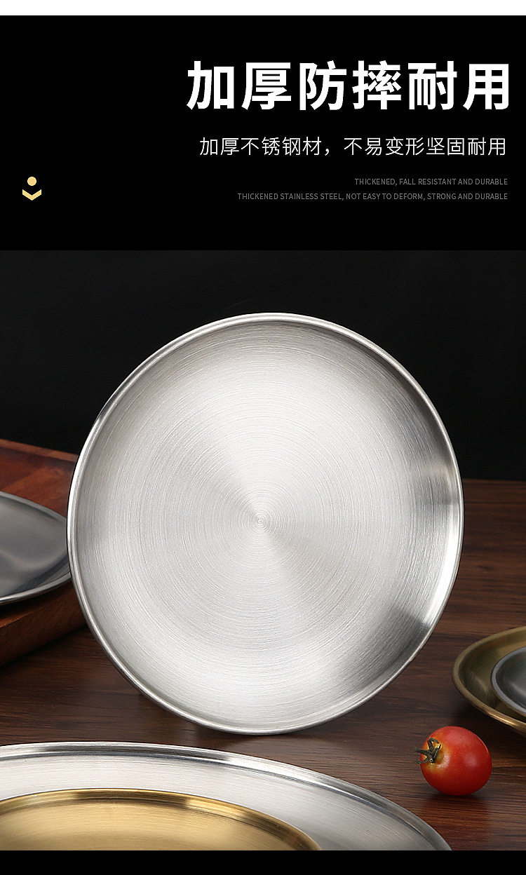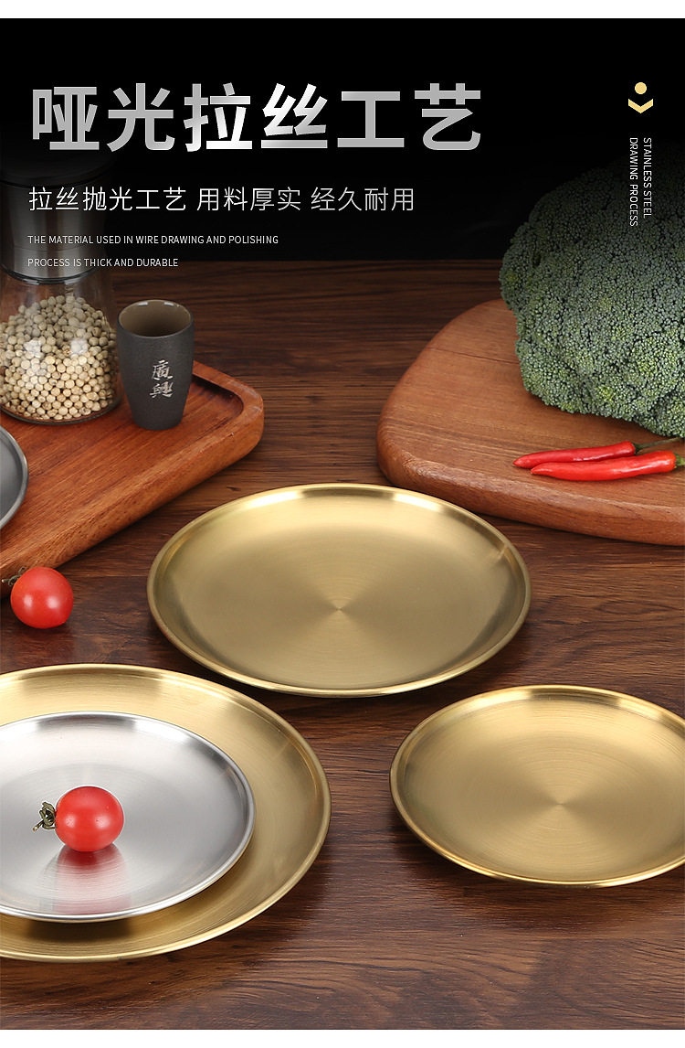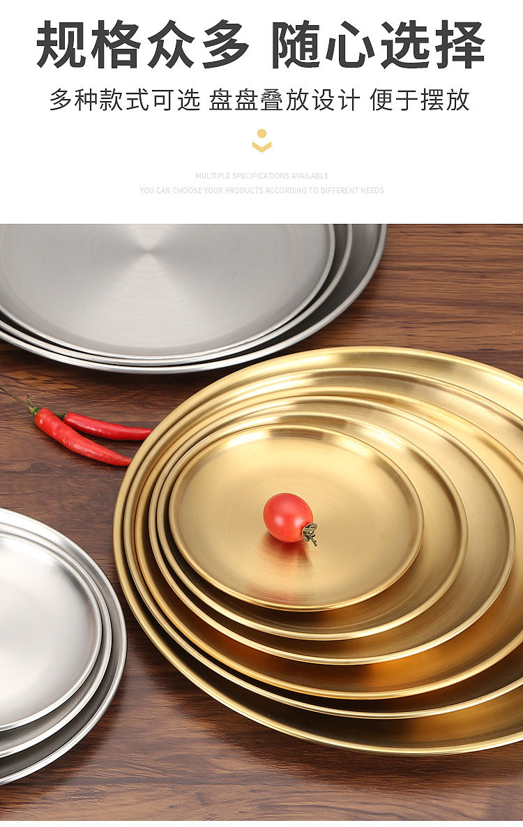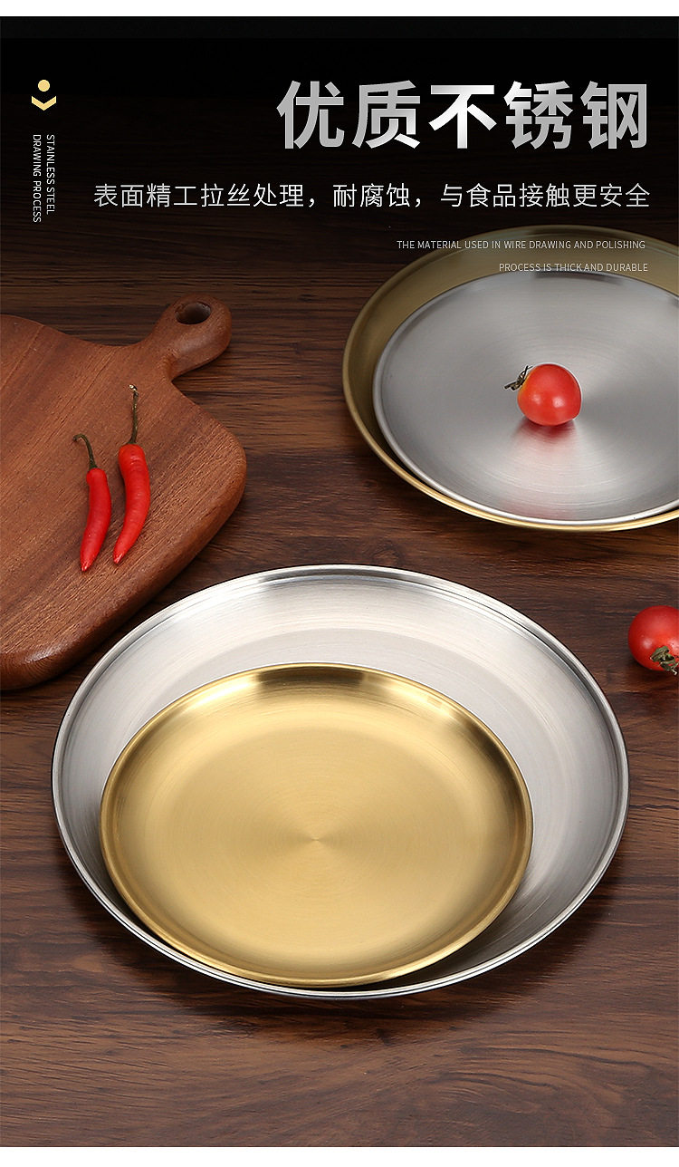 Korean Tableware 304 Stainless Steel Round Plate Thickeneded Barbecue Plate Spit Bone Plate Golden Tray Fruit Cake Plate