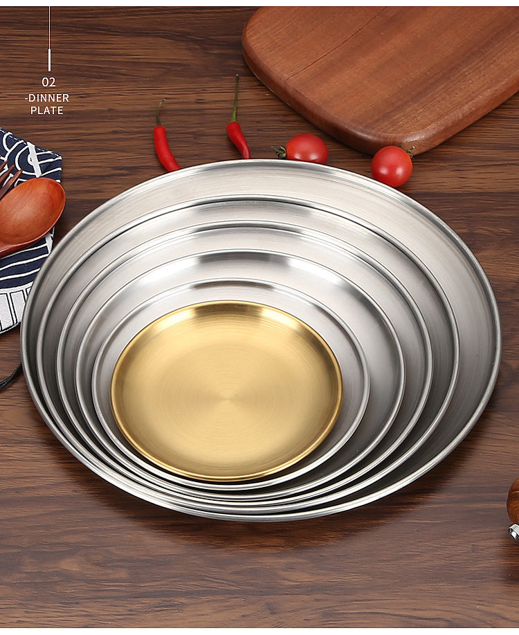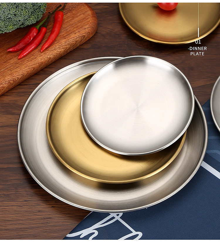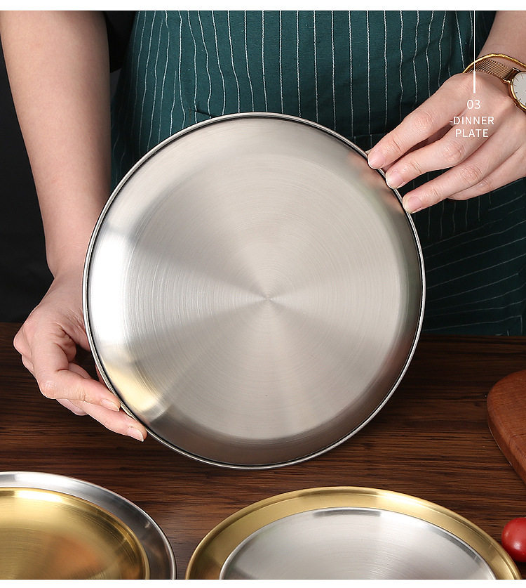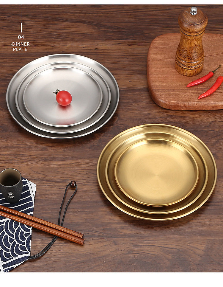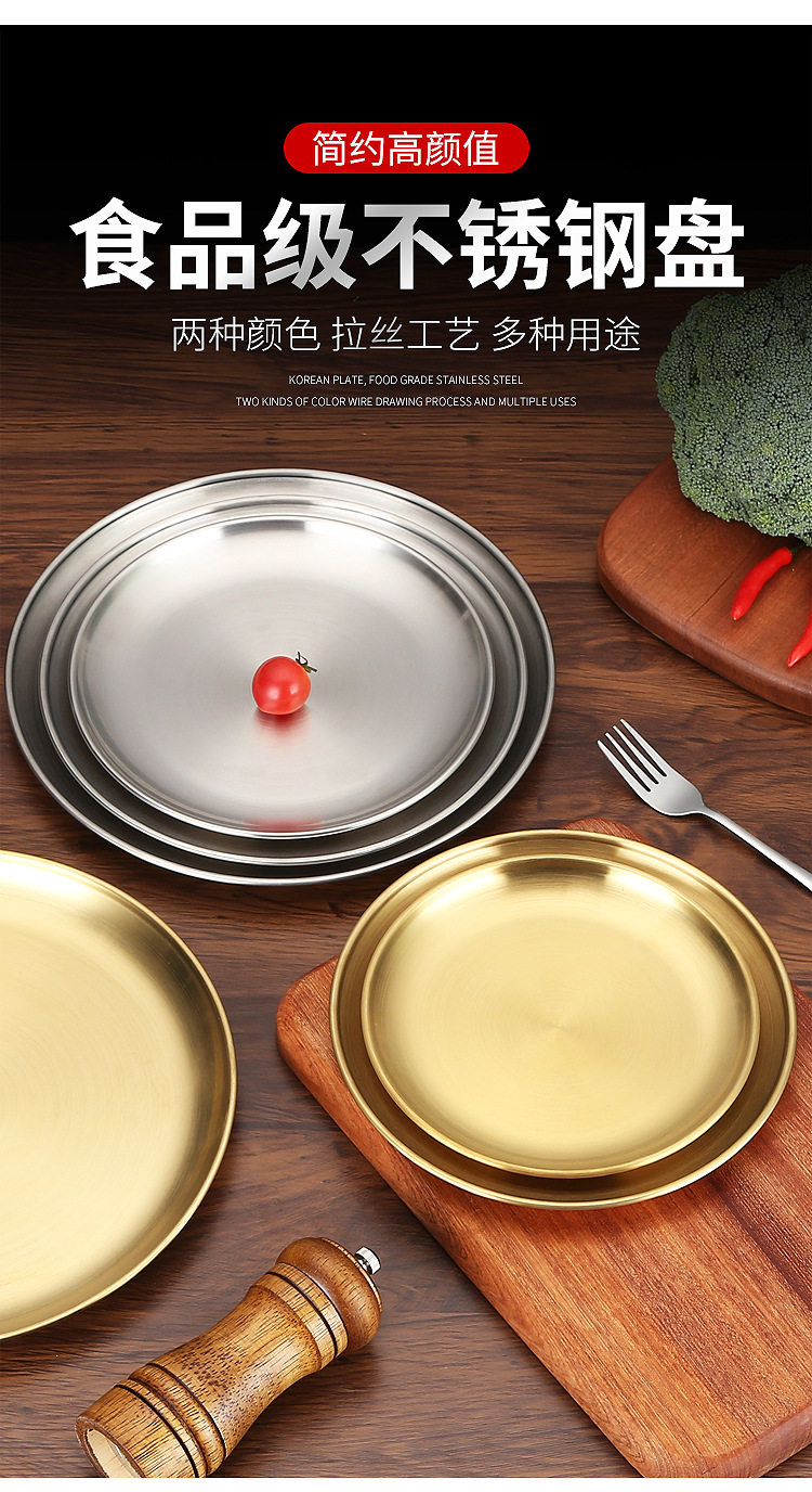 Korean Tableware 304 Stainless Steel Round Plate Thickeneded Barbecue Plate Spit Bone Plate Golden Tray Fruit Cake Plate