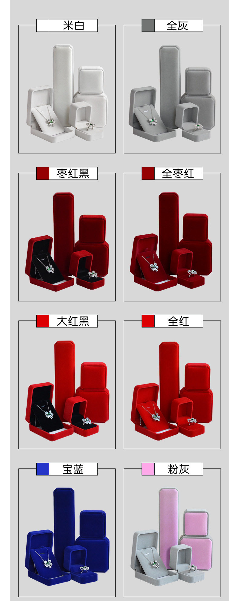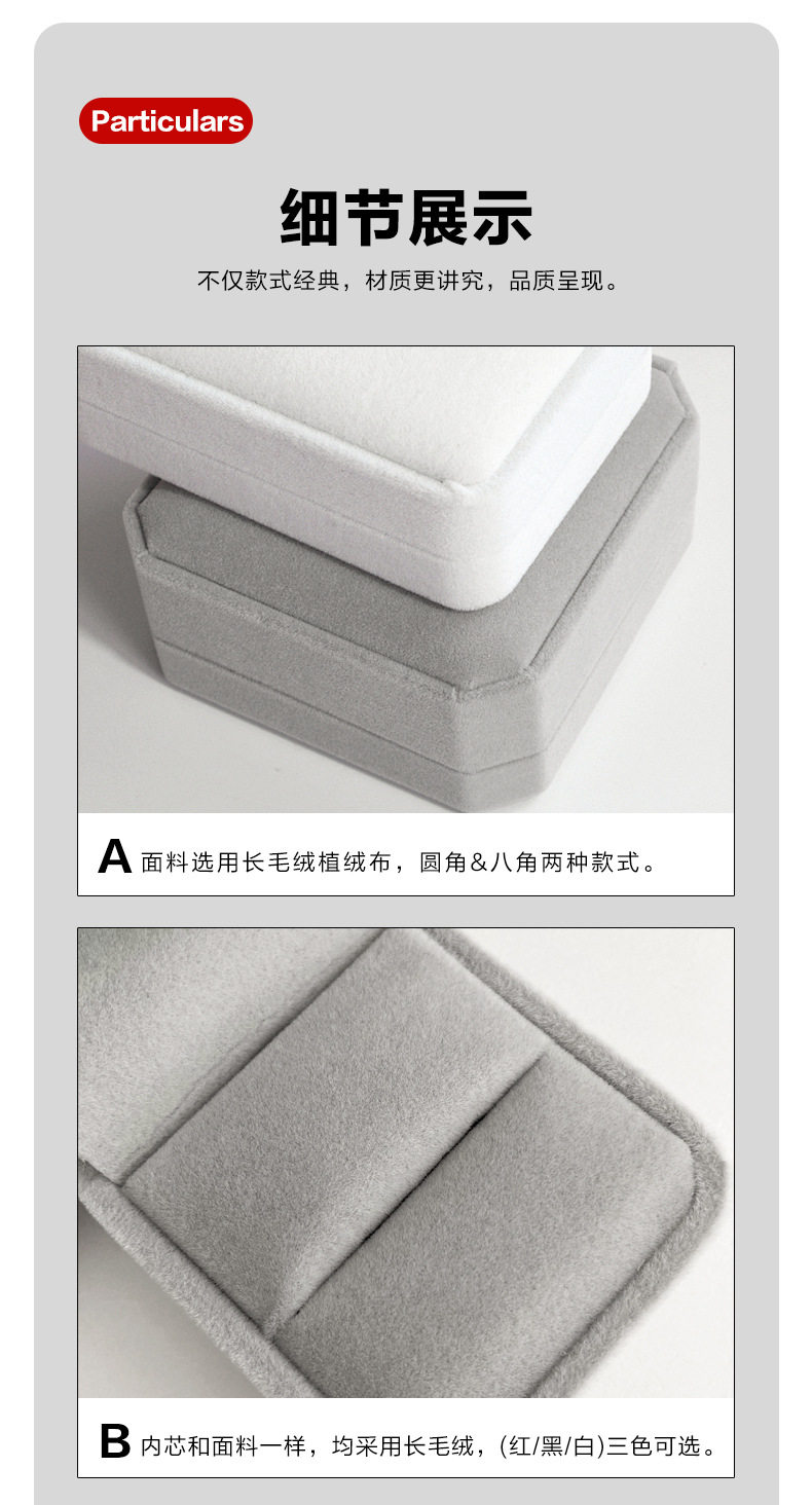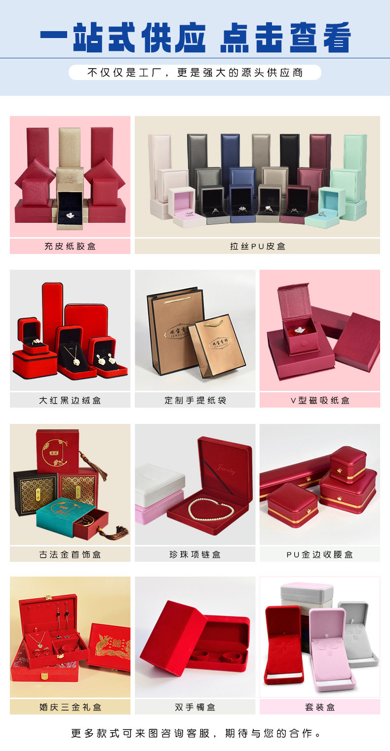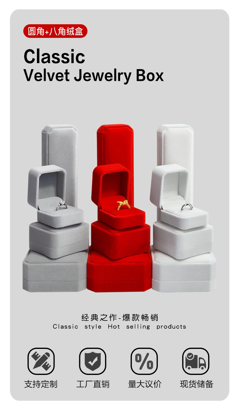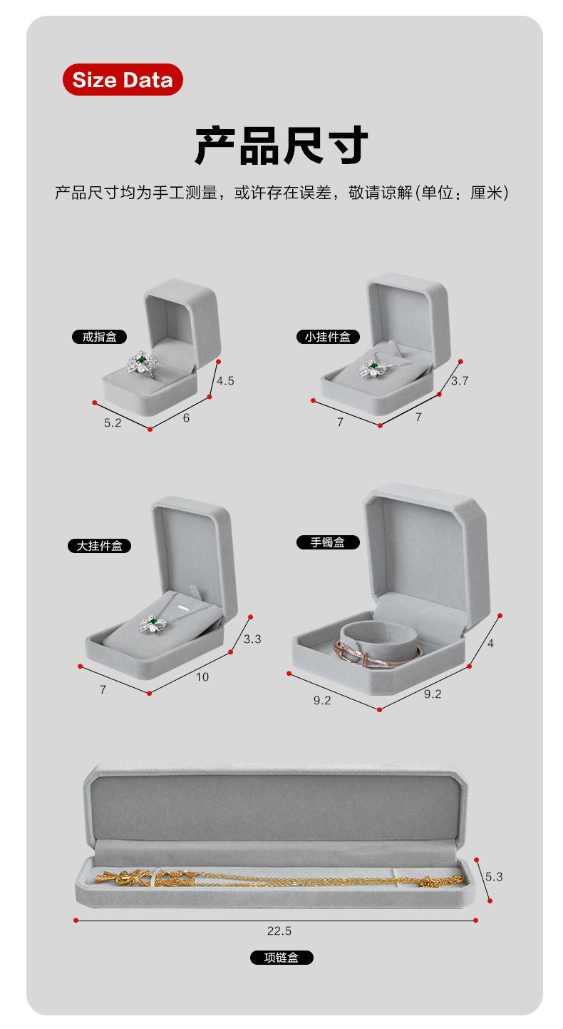 | Specifications and models | Red; Rounded ring box 5.2*6*4.5cm,Red; Rounded small pendant box 7*7*3.7cm,Red; Rounded large pendant box 7*10*3.3cm,Red; Octagonal ring core bracelet box 9.2*9.2*4cm,Red; Octagonal buckle bracelet box 9.2*9.2*4cm,Red octagonal necklace box 22.5*5.3*2.8cm,Wine red; Rounded ring box 5.2*6*4.5cm,Wine red; Rounded small pendant box 7*7*3.7cm,Wine red; Rounded large pendant box 7*10*3.3cm,Wine red; Octagonal ring core bracelet box 9.2*9.2*4cm,Wine red; Octagonal buckle bracelet box 9.2*9.2*4cm,Wine red; Octagonal necklace box 22.5*5.3*2.8cm,Gray; Rounded ring box 5.2*6*4.5cm,Gray; Rounded small pendant box 7*7*3.7cm,Gray; Rounded large pendant box 7*10*3.3cm,Grey; Octagonal ring core bracelet box 9.2*9.2*4cm,Gray; Octagonal buckle bracelet box 9.2*9.2*4cm,Gray; octagonal necklace box 22.5*5.3*2.8cm,Rice white; Rounded ring box 5.2*6*4.5cm,Rice white; Round corner small pendant box 7*7*3.7cm,Rice white; Rounded large pendant box 7*10*3.3cm,Rice white; Octagonal ring core bracelet box 9.2*9.2*4cm,Rice white; Octagonal buckle bracelet box 9.2*9.2*4cm,Rice white; Octagonal necklace box 22.5*5.3*2.8cm,Red black core; Rounded ring box 5.2*6*4.5cm,Red black core; Rounded small pendant box 7*7*3.7cm,Red black core; Rounded large pendant box 7*10*3.3cm,Red black core; Octagonal ring core bracelet box 9.2*9.2*4cm,Red black core; Octagonal buckle bracelet box 9.2*9.2*4cm,Red black core; octagonal necklace box 22.5*5.3*2.8cm,Wine red black core; Rounded ring box 5.2*6*4.5cm,Wine red black core; Round corner small pendant box 7*7*3.7cm,Wine red black core; Rounded large pendant box 7*10*3.3cm,Wine red black core; Octagonal ring core bracelet box 9.2*9.2*4cm,Wine red black core; Octagonal buckle bracelet box 9.2*9.2*4cm,Wine red black core; Octagonal necklace box 22.5*5.3*2.8cm,Blue; Rounded ring box 5.2*6*4.5cm,Blue; Rounded small pendant box 7*7*3.7cm,Blue; Rounded large pendant box 7*10*3.3cm,Blue; Octagonal ring core bracelet box 9.2*9.2*4cm,Blue; Octagonal buckle bracelet box 9.2*9.2*4cm,Blue octagonal necklace box 22.5*5.3*2.8cm,Powder ash; Rounded ring box 5.2*6*4.5cm,Powder ash; Round corner small pendant box 7*7*3.7cm,Powder ash; Rounded large pendant box 7*10*3.3cm,Powder ash; Octagonal ring core bracelet box 9.2*9.2*4cm,Powder ash; Octagonal buckle bracelet box 9.2*9.2*4cm,Powder ash; Octagonal necklace box 22.5*5.3*2.8cm,Black; Rounded ring box 5.2*6*4.5cm,Black; Rounded small pendant box 7*7*3.7cm,Black; Rounded large pendant box 7*10*3.3cm,Black; Octagonal ring core bracelet box 9.2*9.2*4cm,Black; Octagonal buckle bracelet box 9.2*9.2*4cm,Black octagonal necklace box 22.5*5.3*2.8cm |