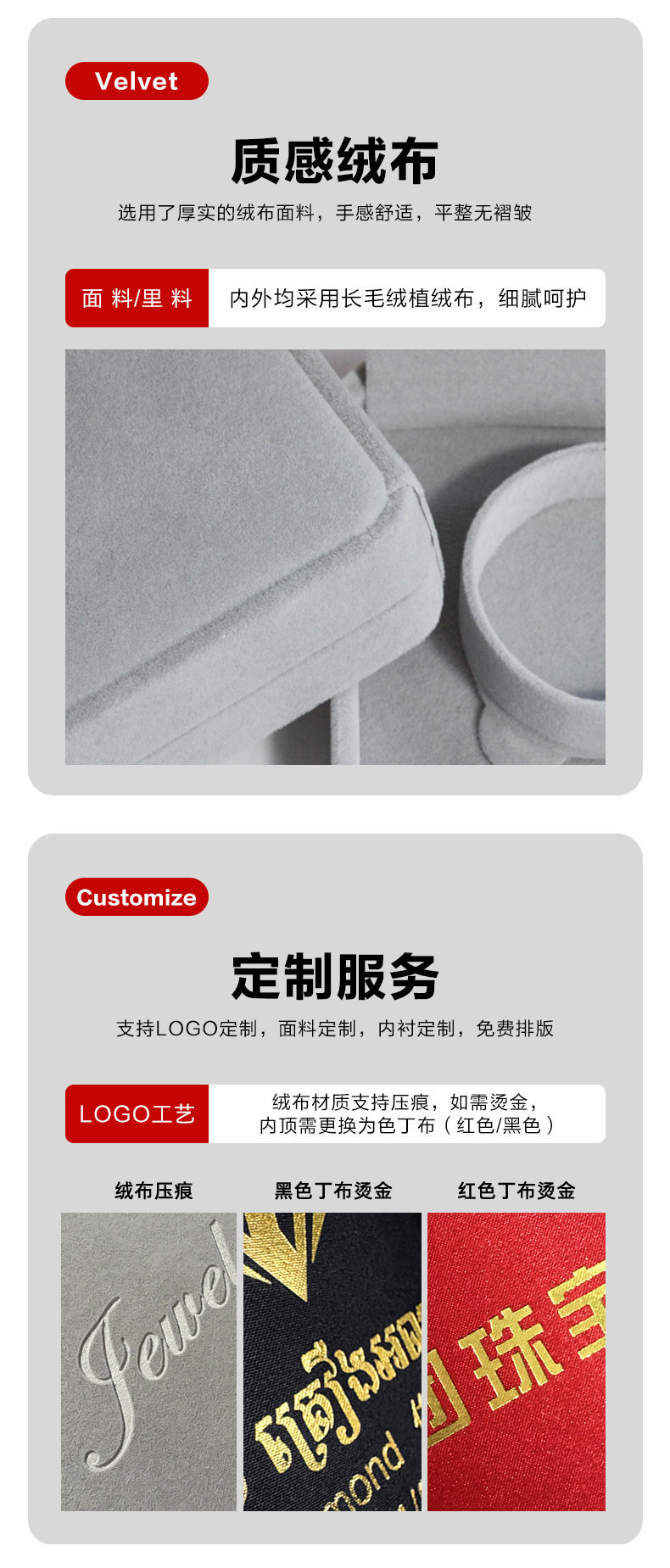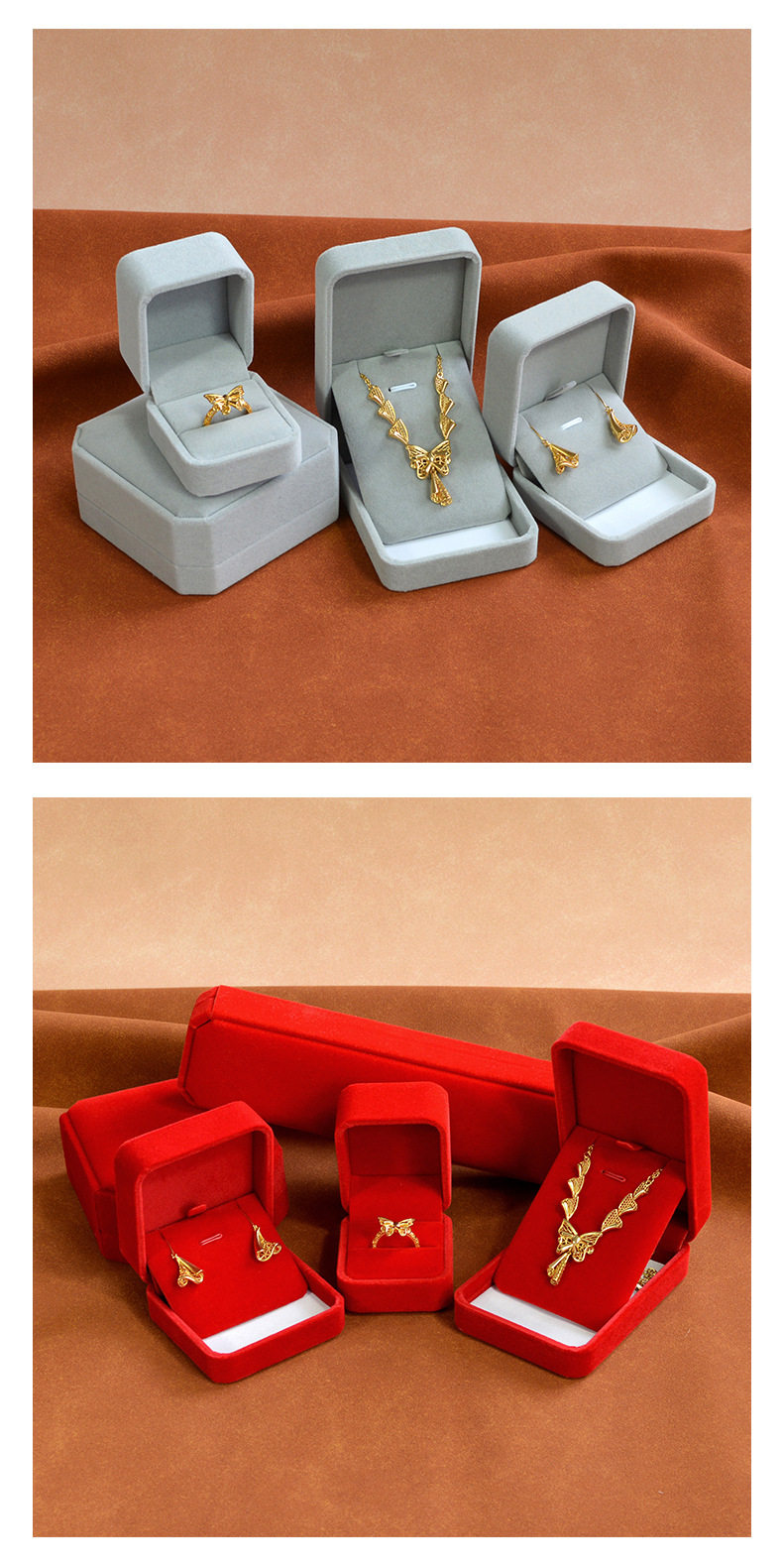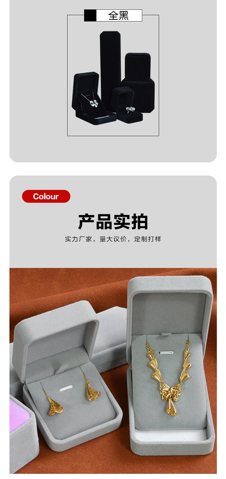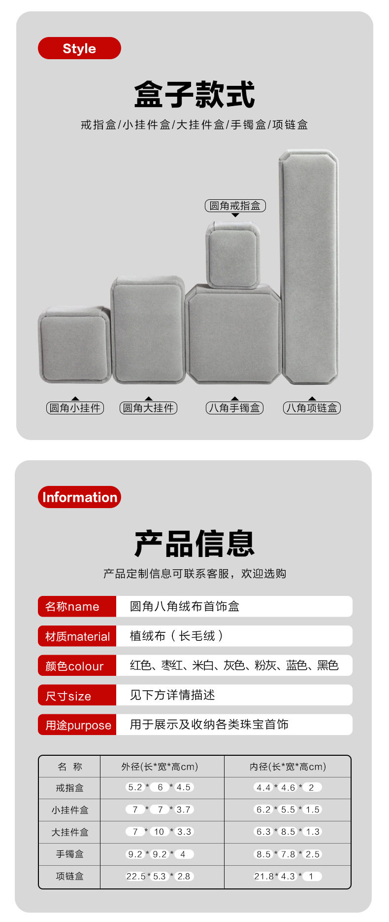 | Specifications and models | Red; Rounded ring box 5.2*6*4.5cm,Red; Rounded small pendant box 7*7*3.7cm,Red; Rounded large pendant box 7*10*3.3cm,Red; Octagonal ring core bracelet box 9.2*9.2*4cm,Red; Octagonal buckle bracelet box 9.2*9.2*4cm,Red octagonal necklace box 22.5*5.3*2.8cm,Wine red; Rounded ring box 5.2*6*4.5cm,Wine red; Rounded small pendant box 7*7*3.7cm,Wine red; Rounded large pendant box 7*10*3.3cm,Wine red; Octagonal ring core bracelet box 9.2*9.2*4cm,Wine red; Octagonal buckle bracelet box 9.2*9.2*4cm,Wine red; Octagonal necklace box 22.5*5.3*2.8cm,Gray; Rounded ring box 5.2*6*4.5cm,Gray; Rounded small pendant box 7*7*3.7cm,Gray; Rounded large pendant box 7*10*3.3cm,Grey; Octagonal ring core bracelet box 9.2*9.2*4cm,Gray; Octagonal buckle bracelet box 9.2*9.2*4cm,Gray; octagonal necklace box 22.5*5.3*2.8cm,Rice white; Rounded ring box 5.2*6*4.5cm,Rice white; Round corner small pendant box 7*7*3.7cm,Rice white; Rounded large pendant box 7*10*3.3cm,Rice white; Octagonal ring core bracelet box 9.2*9.2*4cm,Rice white; Octagonal buckle bracelet box 9.2*9.2*4cm,Rice white; Octagonal necklace box 22.5*5.3*2.8cm,Red black core; Rounded ring box 5.2*6*4.5cm,Red black core; Rounded small pendant box 7*7*3.7cm,Red black core; Rounded large pendant box 7*10*3.3cm,Red black core; Octagonal ring core bracelet box 9.2*9.2*4cm,Red black core; Octagonal buckle bracelet box 9.2*9.2*4cm,Red black core; octagonal necklace box 22.5*5.3*2.8cm,Wine red black core; Rounded ring box 5.2*6*4.5cm,Wine red black core; Round corner small pendant box 7*7*3.7cm,Wine red black core; Rounded large pendant box 7*10*3.3cm,Wine red black core; Octagonal ring core bracelet box 9.2*9.2*4cm,Wine red black core; Octagonal buckle bracelet box 9.2*9.2*4cm,Wine red black core; Octagonal necklace box 22.5*5.3*2.8cm,Blue; Rounded ring box 5.2*6*4.5cm,Blue; Rounded small pendant box 7*7*3.7cm,Blue; Rounded large pendant box 7*10*3.3cm,Blue; Octagonal ring core bracelet box 9.2*9.2*4cm,Blue; Octagonal buckle bracelet box 9.2*9.2*4cm,Blue octagonal necklace box 22.5*5.3*2.8cm,Powder ash; Rounded ring box 5.2*6*4.5cm,Powder ash; Round corner small pendant box 7*7*3.7cm,Powder ash; Rounded large pendant box 7*10*3.3cm,Powder ash; Octagonal ring core bracelet box 9.2*9.2*4cm,Powder ash; Octagonal buckle bracelet box 9.2*9.2*4cm,Powder ash; Octagonal necklace box 22.5*5.3*2.8cm,Black; Rounded ring box 5.2*6*4.5cm,Black; Rounded small pendant box 7*7*3.7cm,Black; Rounded large pendant box 7*10*3.3cm,Black; Octagonal ring core bracelet box 9.2*9.2*4cm,Black; Octagonal buckle bracelet box 9.2*9.2*4cm,Black octagonal necklace box 22.5*5.3*2.8cm |