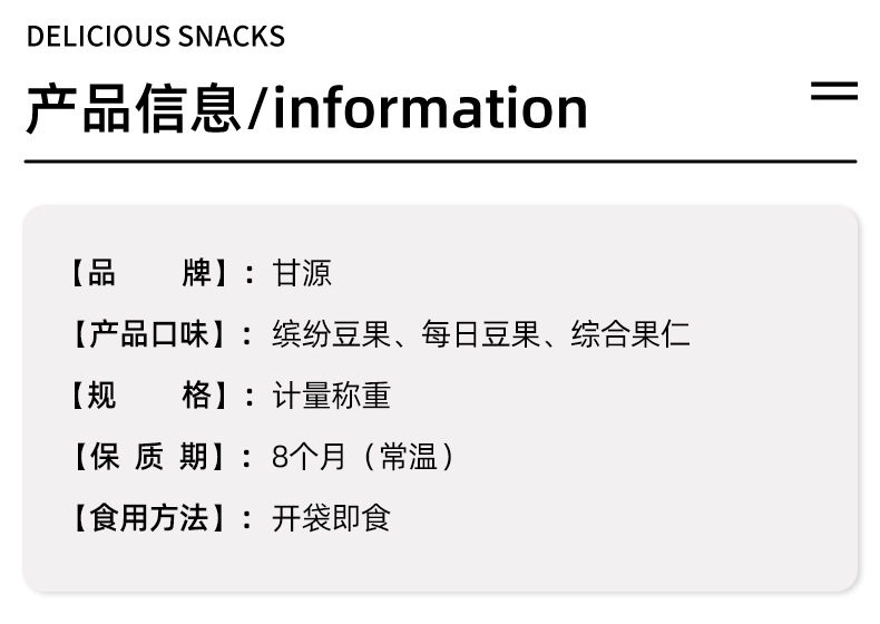 | Packaging specifications | 【10 packs】mixed flavors,【10 packs】comprehensive nuts,【10 packs】daily beans and fruits,【10 packs】colorful nuts,【20 packs】mixed flavors,【20 packs】comprehensive nuts,【20 packs】daily beans and fruits,【20 packs】colorful nuts,【30 packs】mixed flavors,【30 packs】comprehensive nuts,【30 packs】daily beans and fruits,【30 packs】colorful nuts,【50 packs】mixed flavors,【50 packs】comprehensive nuts,【50 packs】daily beans and fruits,【50 packs】colorful nuts,【5 packs】mixed flavors |