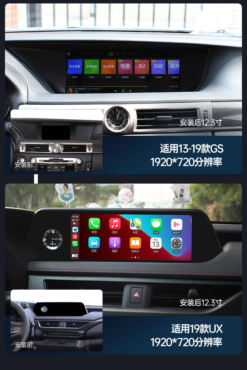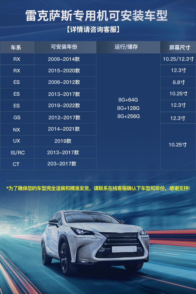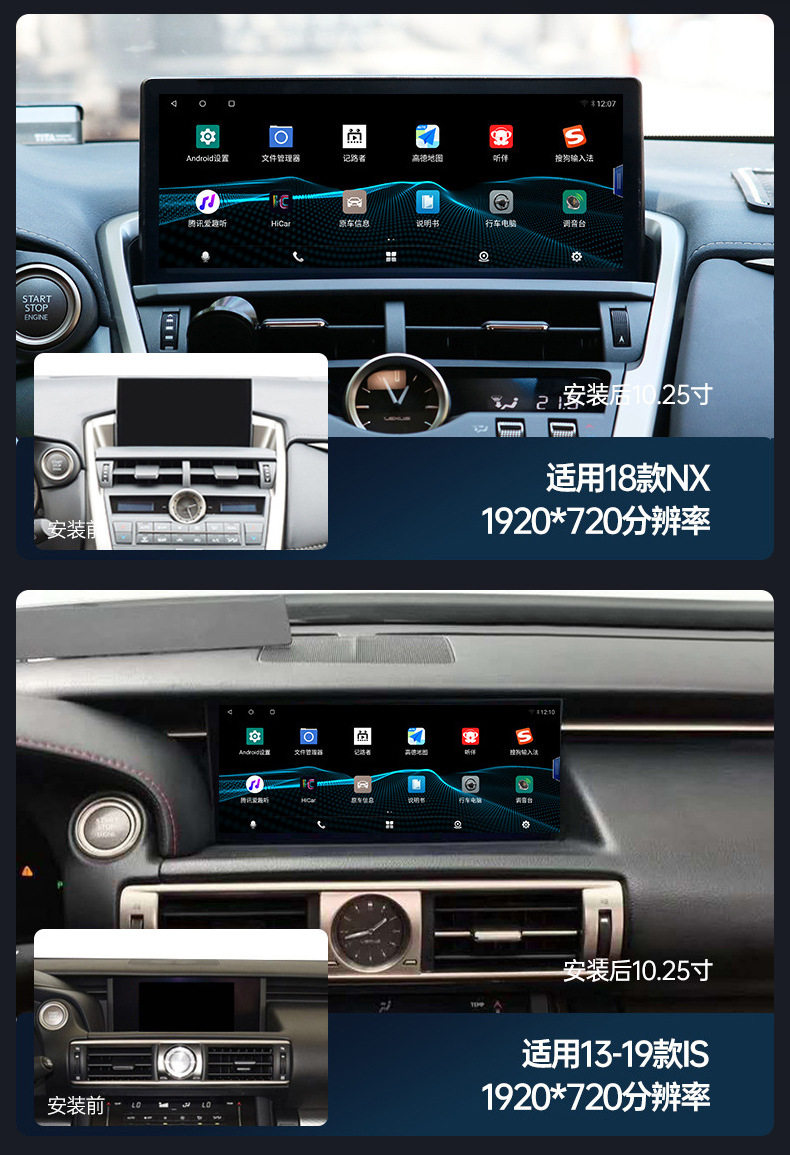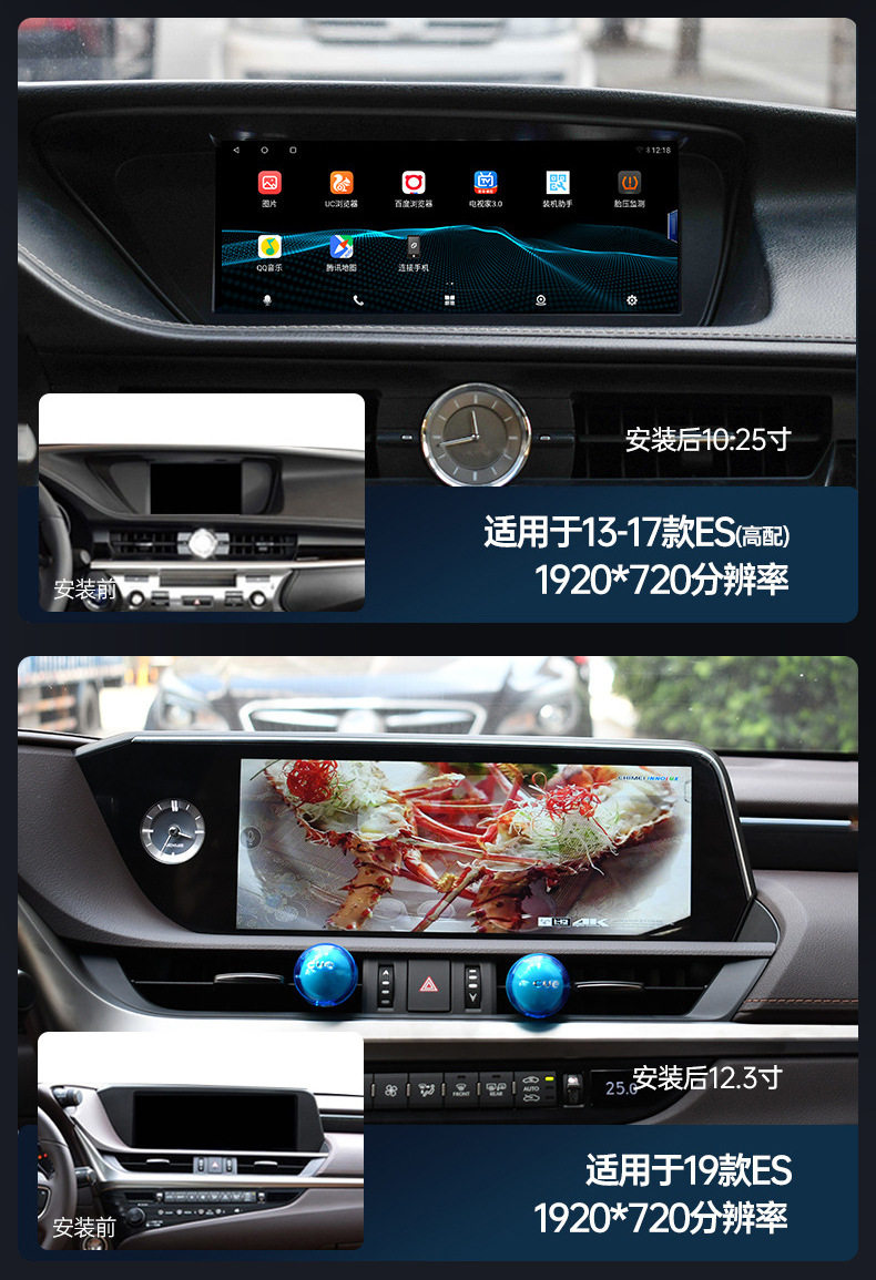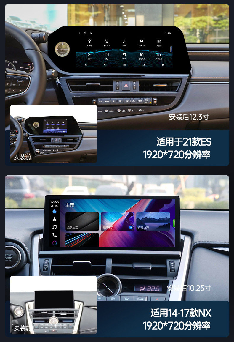 | Specifications | ES [22 years]],ES low configuration [13-17 years] (original car digital tube display),ES high with [13-17 years] (original car LCD),ES [19-21 years]],RX low with [09-14] (original car digital tube display),RX high match [09-14] (original car LCD display),RX [20-22] (original car LCD display),GS [12-17 years]],NX [15-17 years] (original car with digital tube display),NX [18-21] (original car LCD display),CT [13-17 years] (original car without screen),CT [13-17 years] (original car with screen),IS/RC [13-17 years] (original car LCD display),UX [19 years]],Universal 360 panoramic camera |