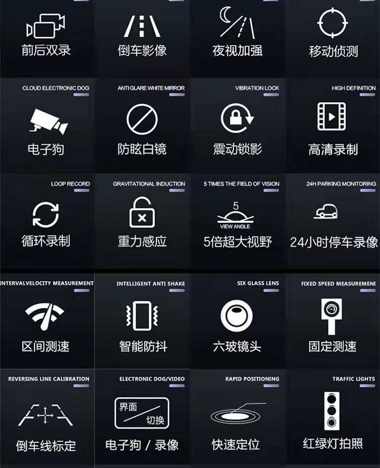 | Function | Motion detection,Loop recording,Fixed speed measurement,Parking monitoring,Night vision fill light,Collision sensor,Night vision enhancement,Characteristic correction on the picture,Front and rear video recording |