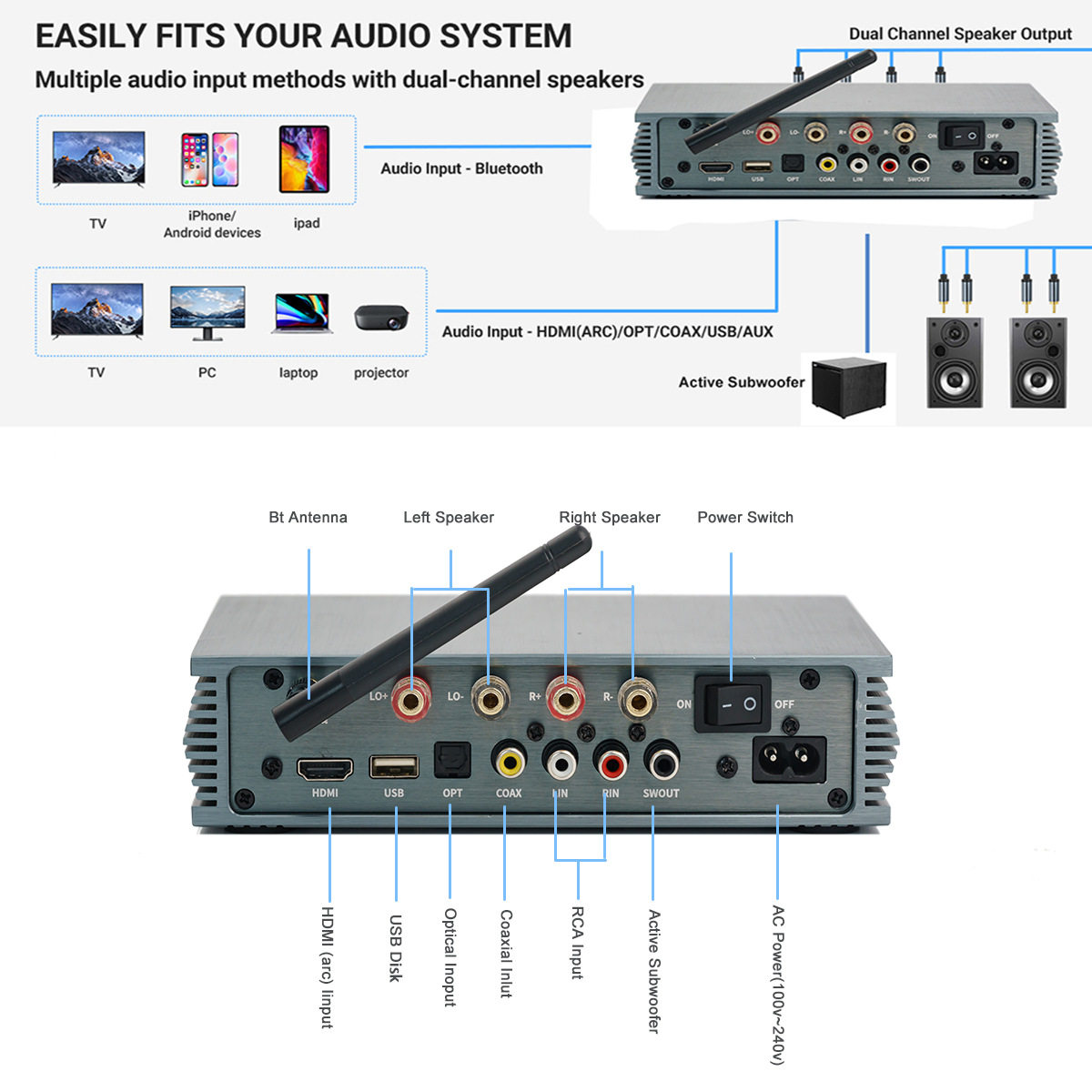 | Interface Type | RCA, Fiber Optic, Coaxial, HDMI ARC,USB |