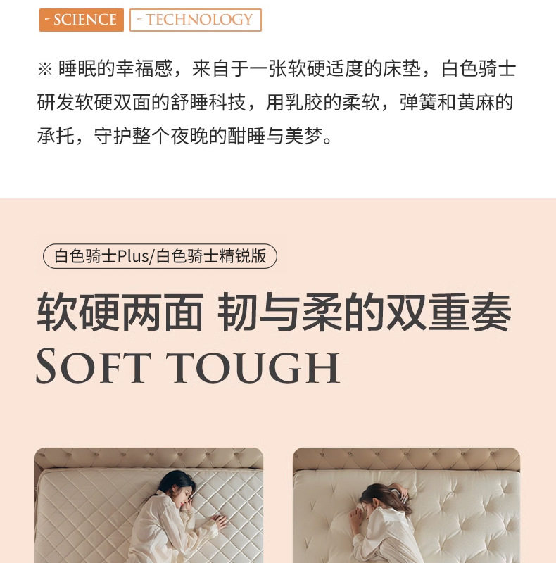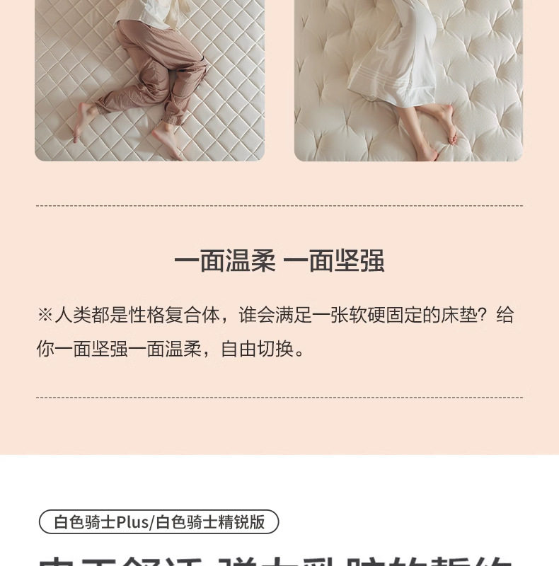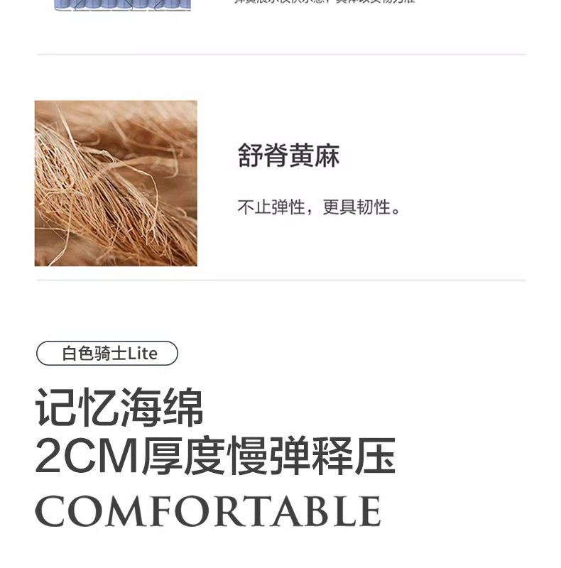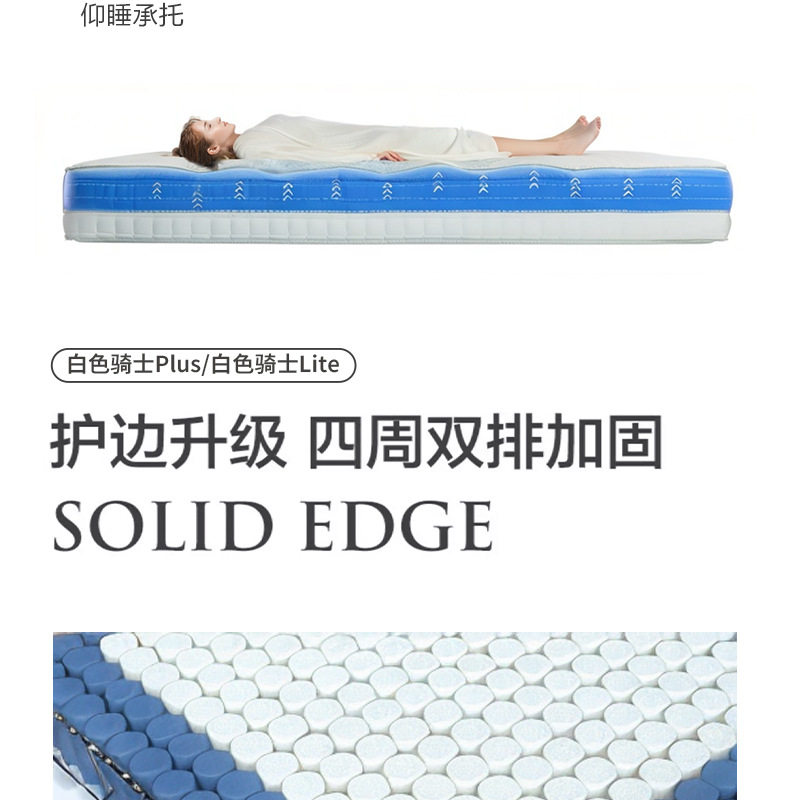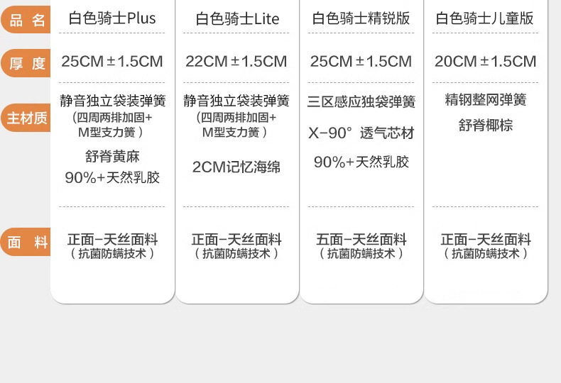 Color White knight plus: front + natural latex, back + spine protection jute,White knight wedding gift: front + 3cm natural latex, back + spine-supporting jute,White knight lite: front + memory foam,White knight elite edition: front + natural latex, back + 2cm3d,White knight kids edition: front + 3e environmental protection coconut brown,White knight pro: front natural latex + 3d material,White knight kids: front + 3d material,[white knight 0 glue] detachable: front + memory foam + high elastic cotton