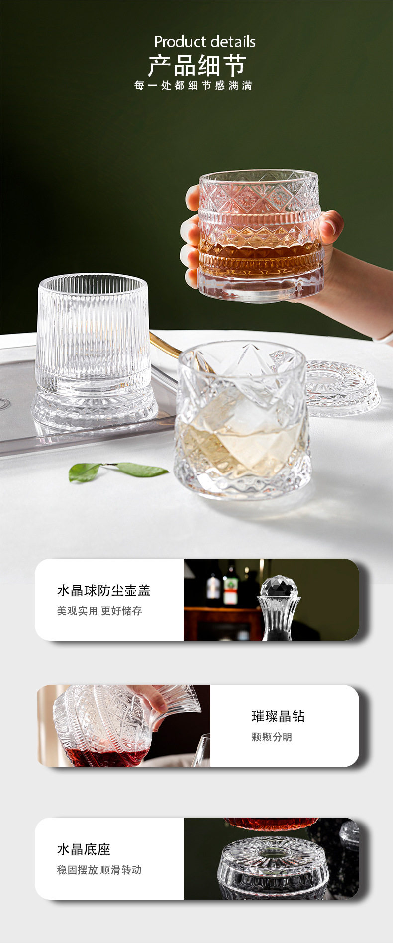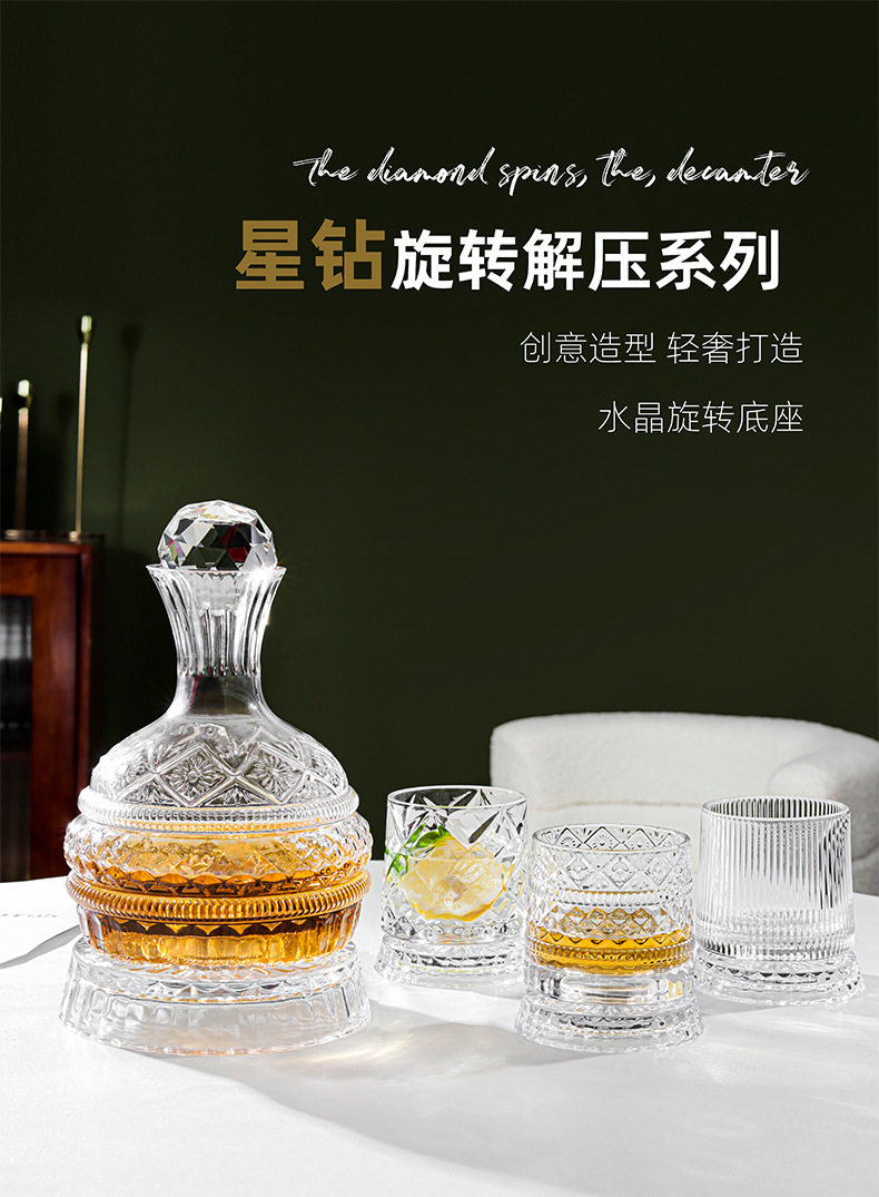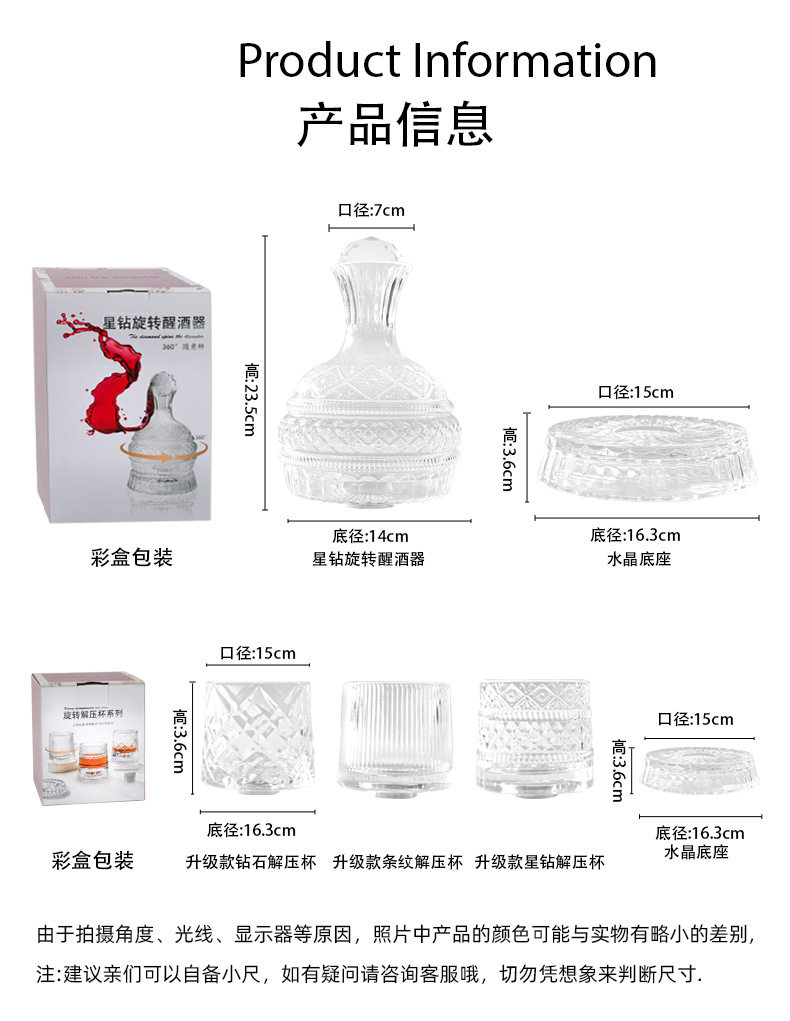 | Specifications and dimensions | Star diamond rotating decanter foam (without ball),Star diamond rotating decanter in color box (without ball),Star diamond rotating decanter foam pack (with ball),Star diamond rotating decanter in color box (with ball),Diamond decompression cup glass bottom color box,Striped decompression cup glass bottom color box,Star diamond decompression cup glass bottom color box,Decompression cup (glass base) 2 pieces + gift box,Decompression cup (glass base) 4 pieces + gift box |