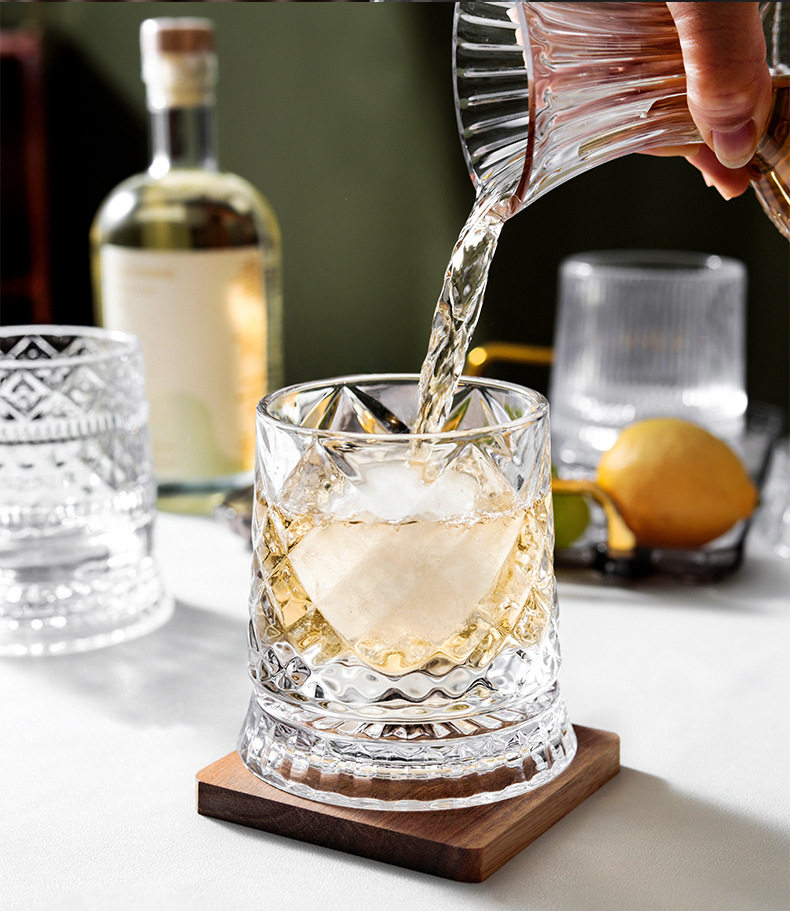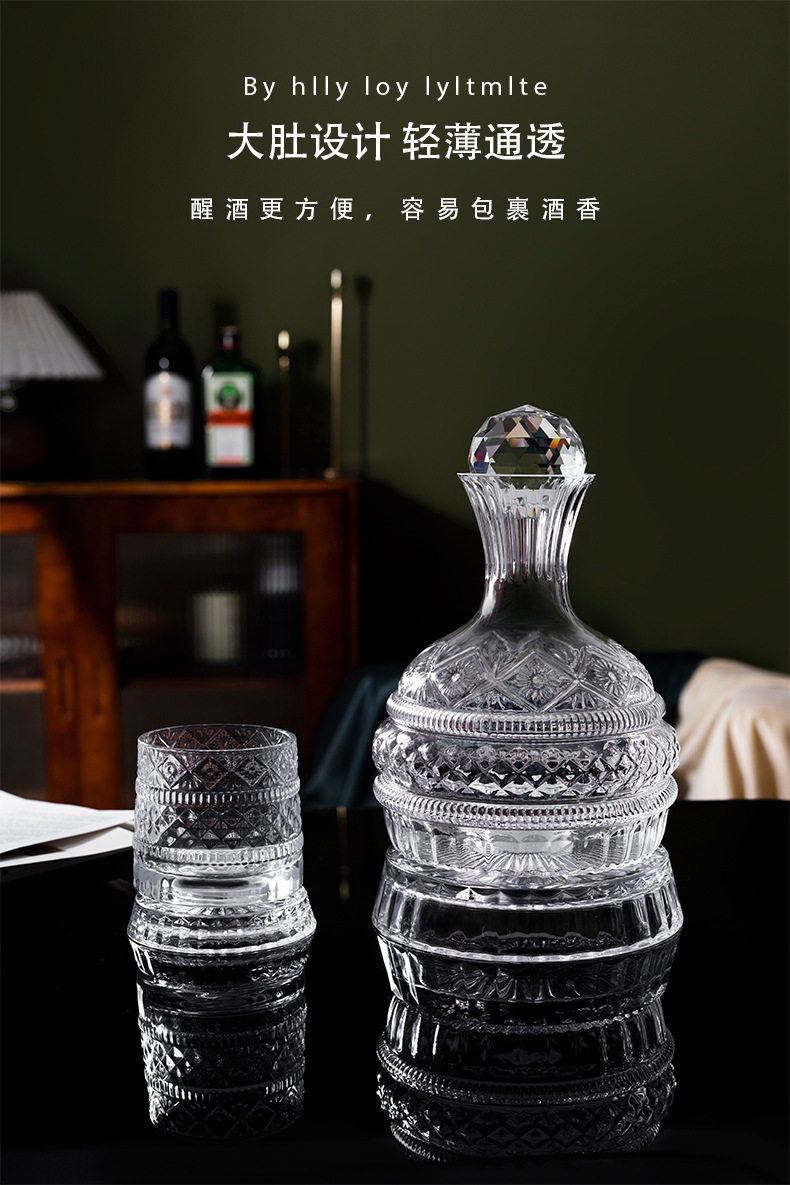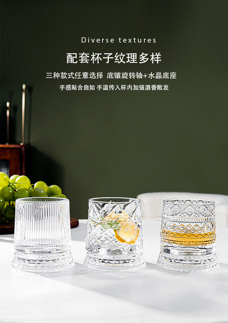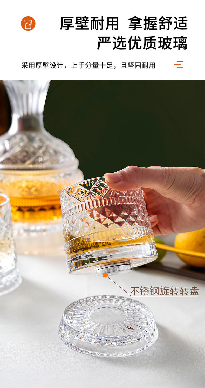 | Specifications and dimensions | Star diamond rotating decanter foam (without ball),Star diamond rotating decanter in color box (without ball),Star diamond rotating decanter foam pack (with ball),Star diamond rotating decanter in color box (with ball),Diamond decompression cup glass bottom color box,Striped decompression cup glass bottom color box,Star diamond decompression cup glass bottom color box,Decompression cup (glass base) 2 pieces + gift box,Decompression cup (glass base) 4 pieces + gift box |