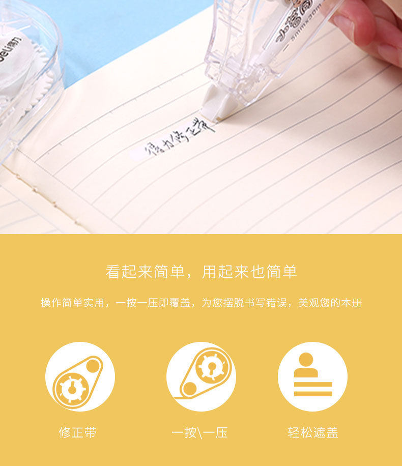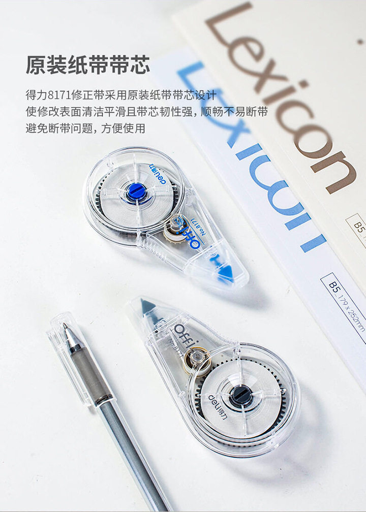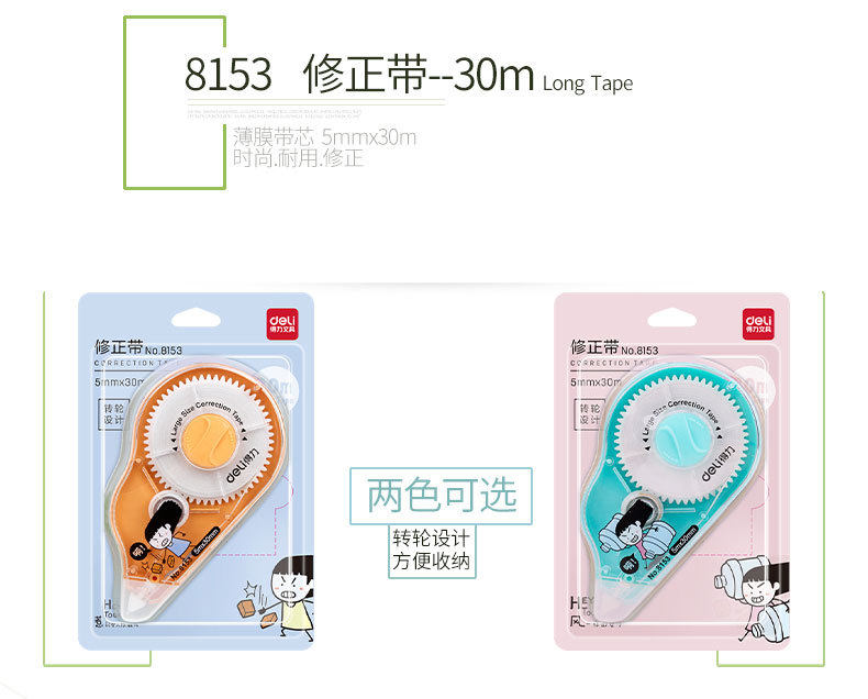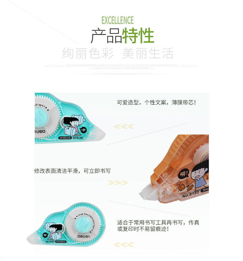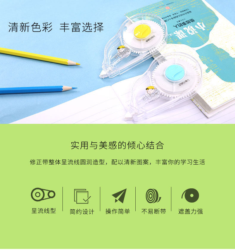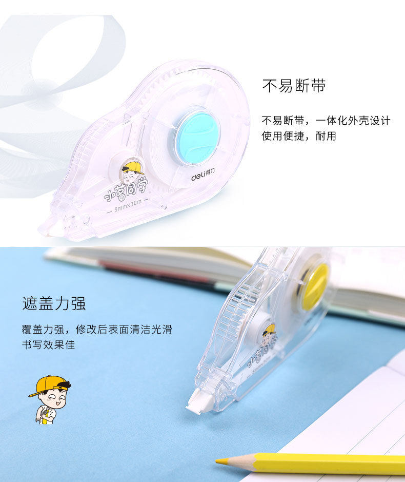 | Specifications | Deli 8180 Correction Tape (Xiao Ming)-30m,Deli 8153 correction tape -30m,Deli 8171 correction tape -20m,Deli 8145 correction tape -30m |