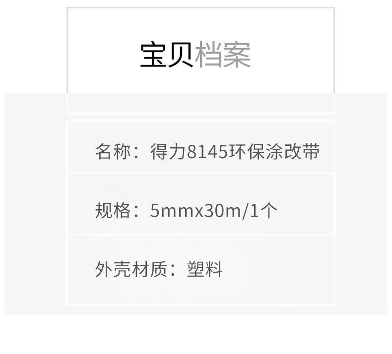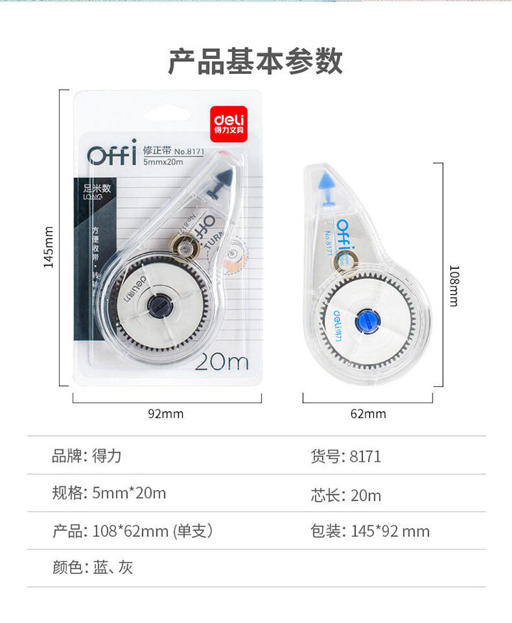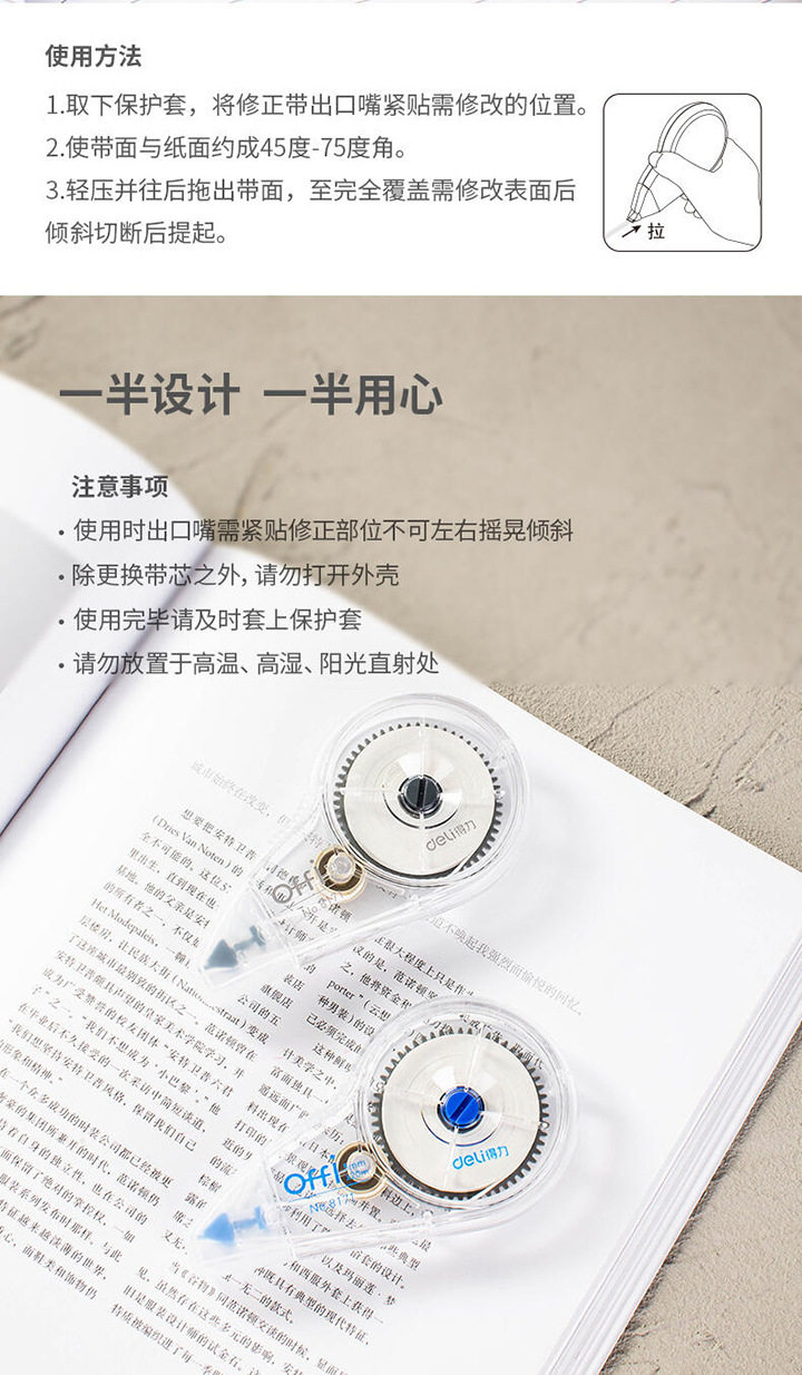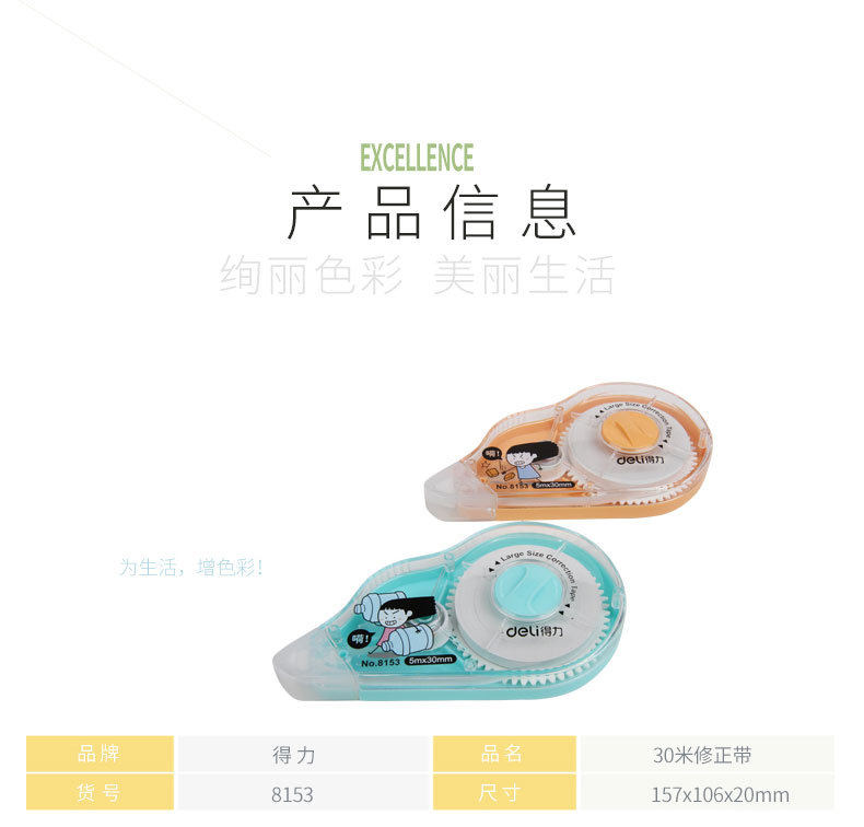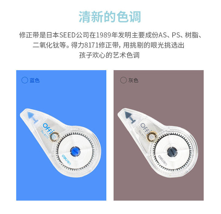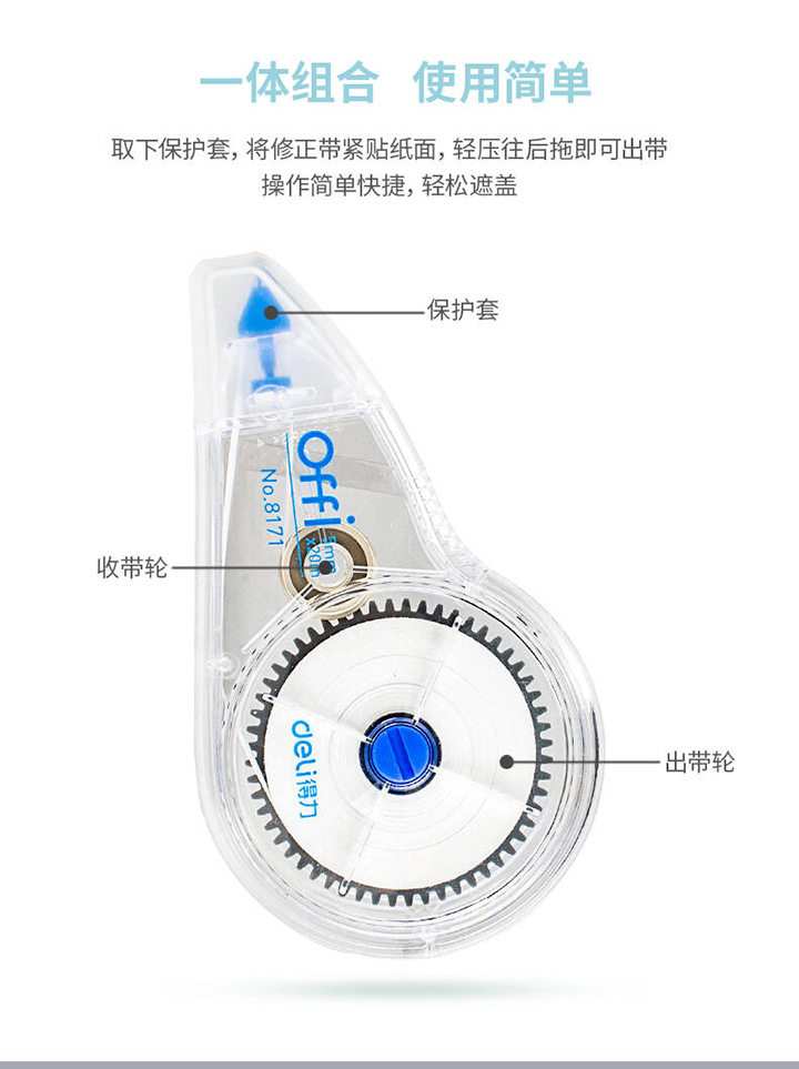 | Specifications | Deli 8180 Correction Tape (Xiao Ming)-30m,Deli 8153 correction tape -30m,Deli 8171 correction tape -20m,Deli 8145 correction tape -30m |