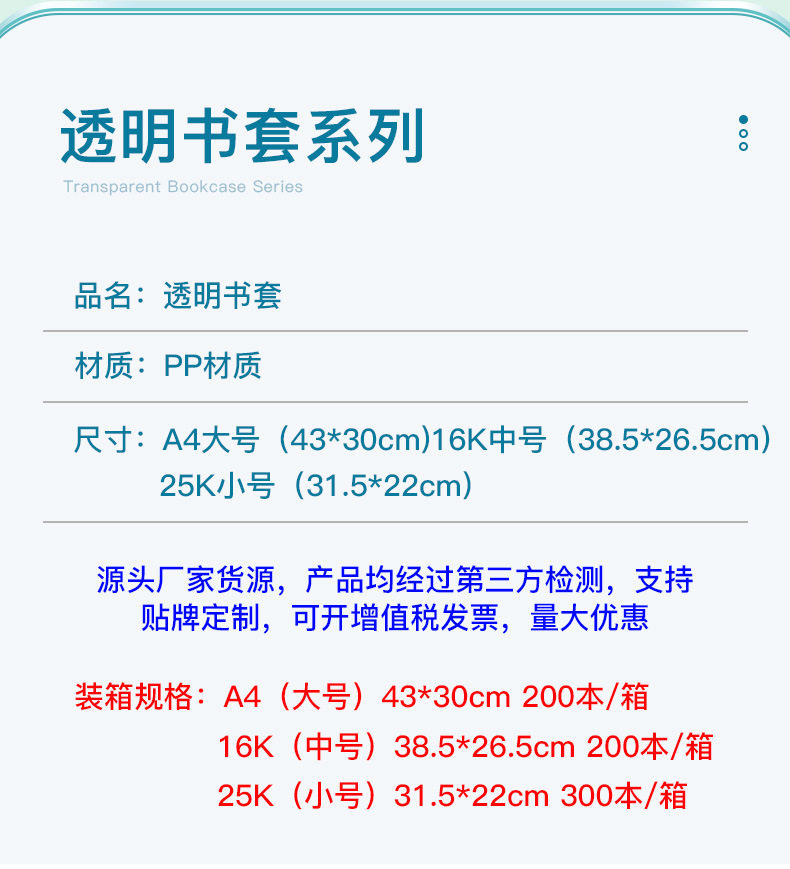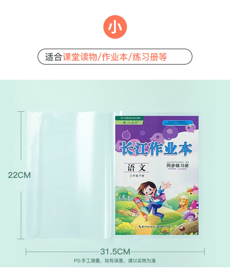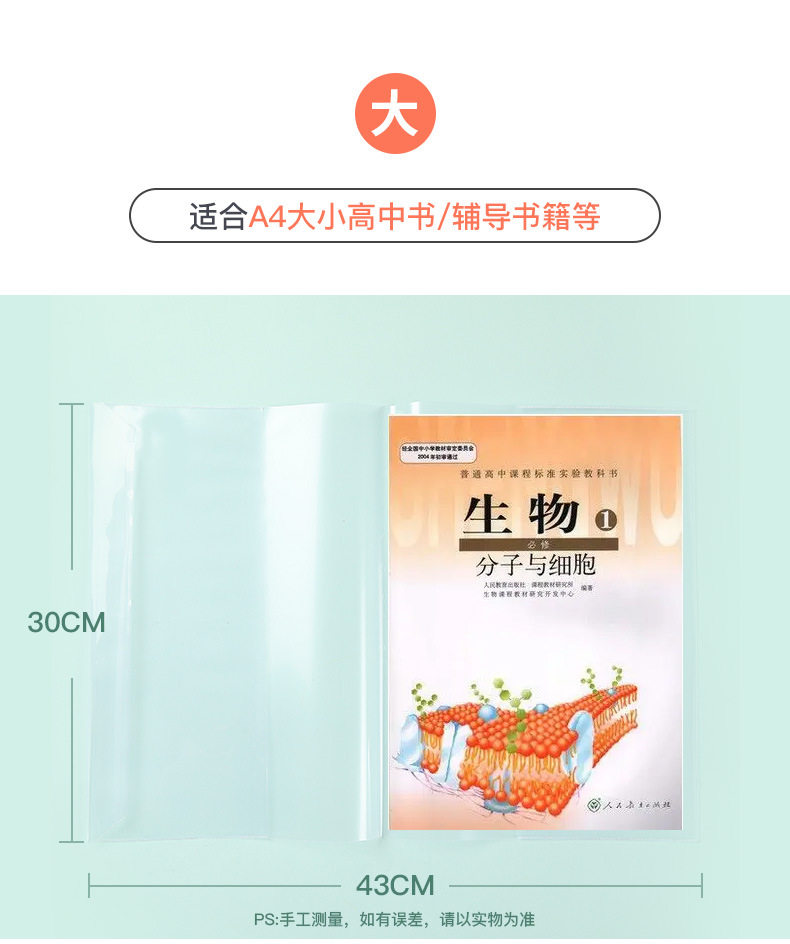 | Specifications | Transparent book cover large A4(10),Transparent book cover medium 16k(10),Transparent book cover small size 25k(10),Transparent book cover suit 30 (large 10 medium 10 small size 10) |