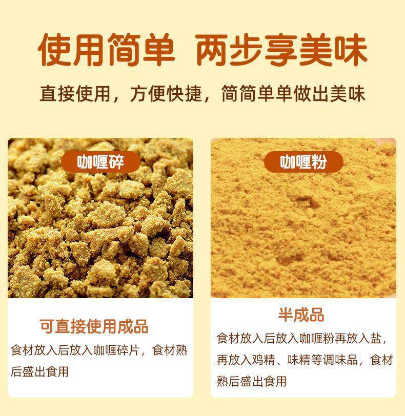 | Packaging specifications | Fu leike curry crushed medium spicy 1kg,Pawwa curry crushed medium spicy 1kg,Pepmengdo curry blocks original flavor 1kg,Bai mengdo curry cubes slightly spicy 1kg,Java curry block original flavor 970g,Java curry cubes spicy 970g,Tomato red rice seasoning block 1kg |
