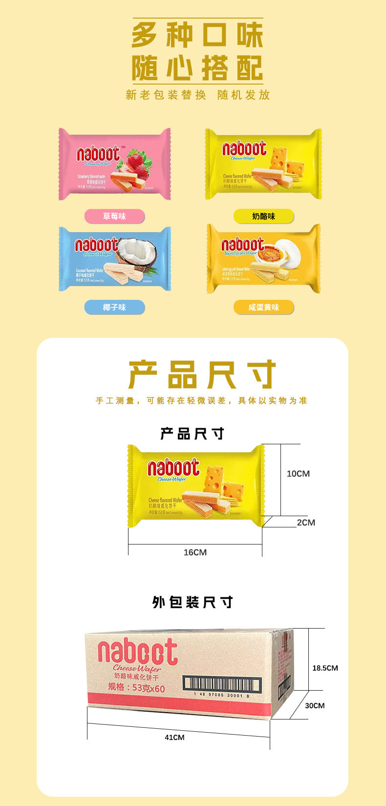 | Item no | Wei hua biscuits naboot53g (cheese flavor, strawberry flavor, coconut flavor, salted egg yolk flavor) |