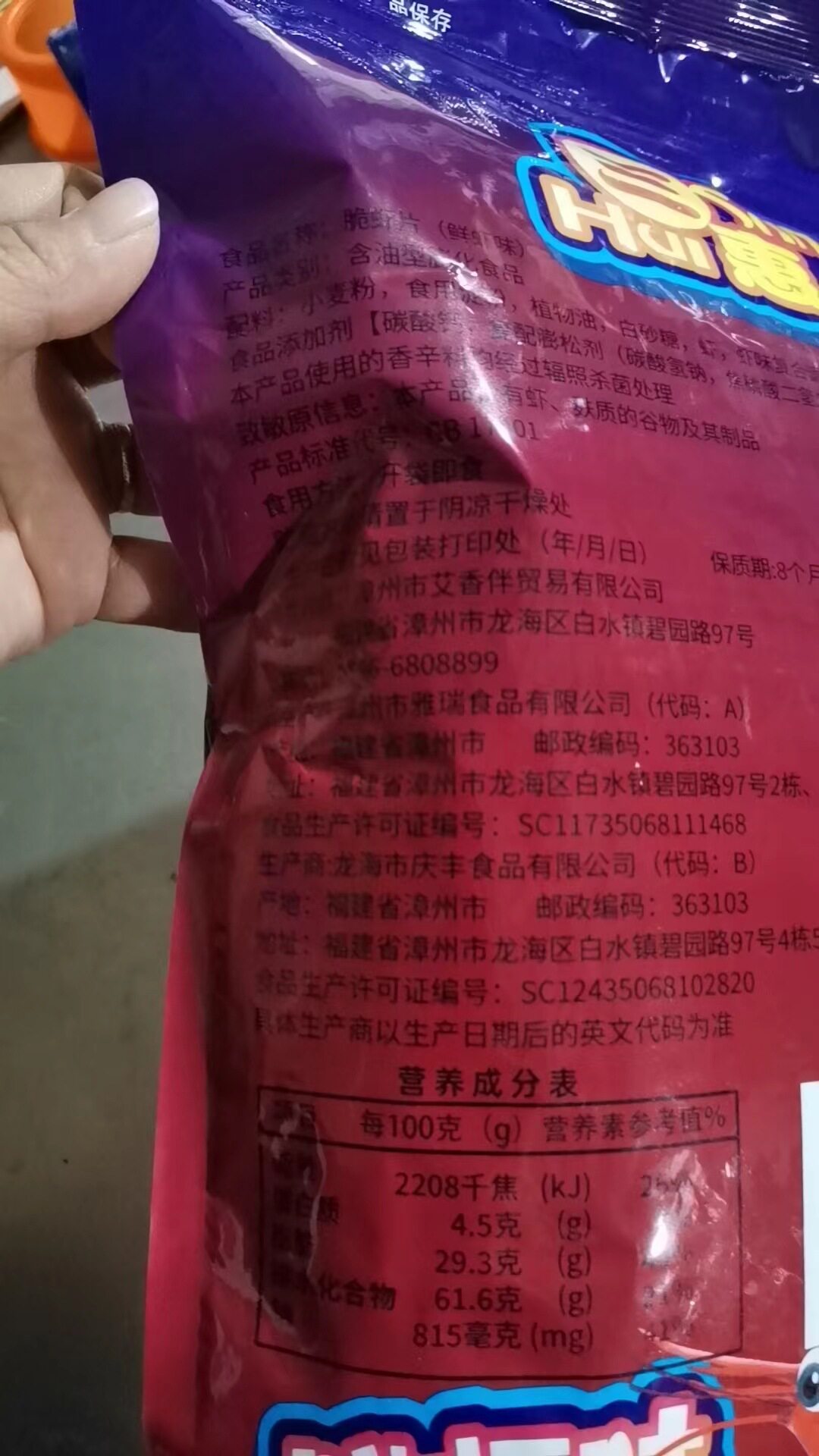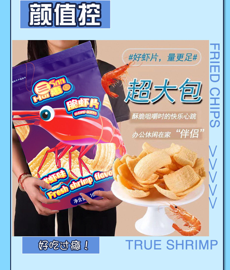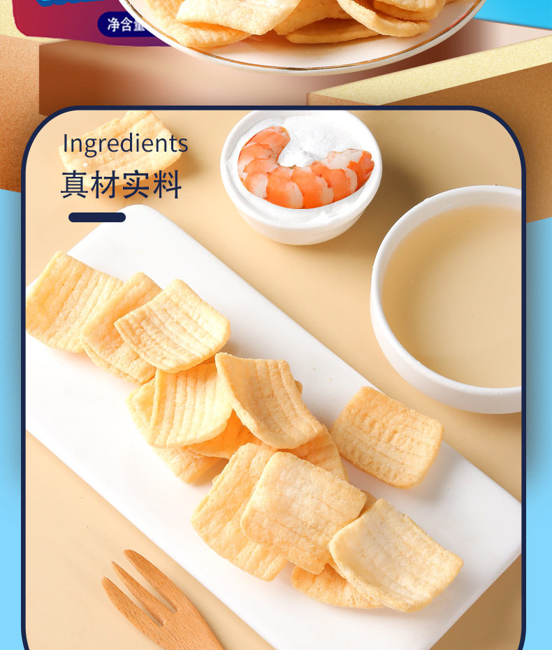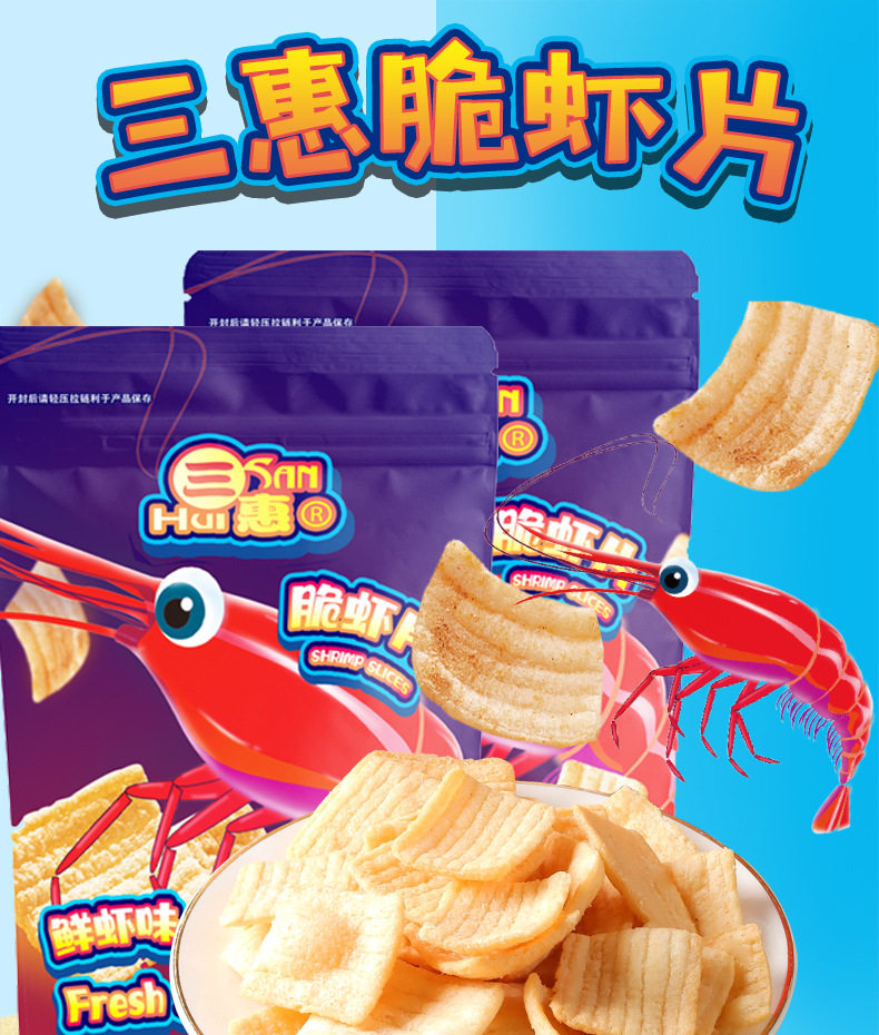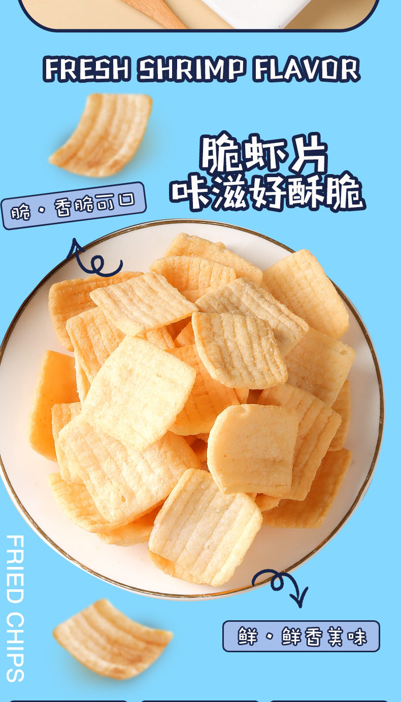 | Raw materials and ingredients | Wheat flour, vegetable oil, shrimp, shrimp flavor compound seasoning, etc |