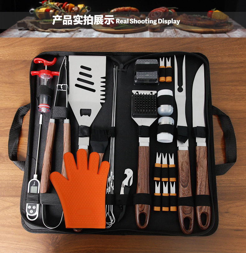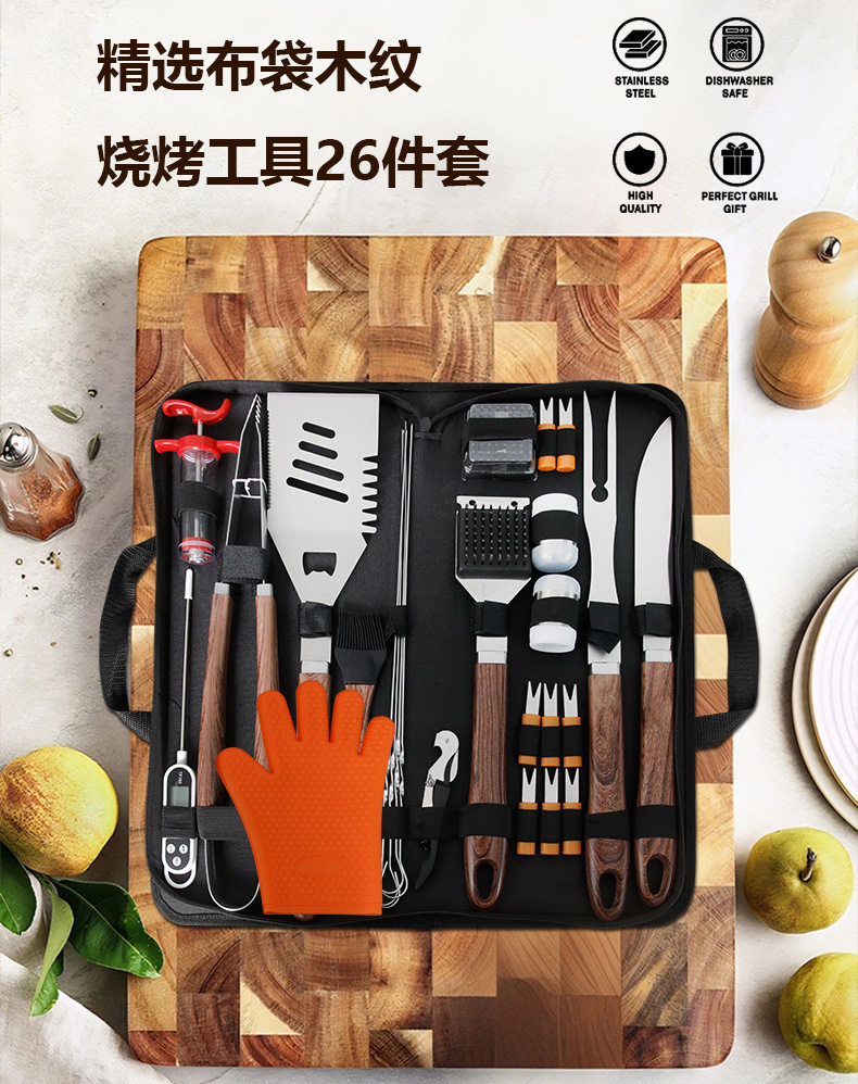 Cross-Border Hot-Selling Barbecue Set 26-Piece Bbq Outdoor Barbecue Tool Set Imitation Colored Wood Pp Handle Grill Set in Stock