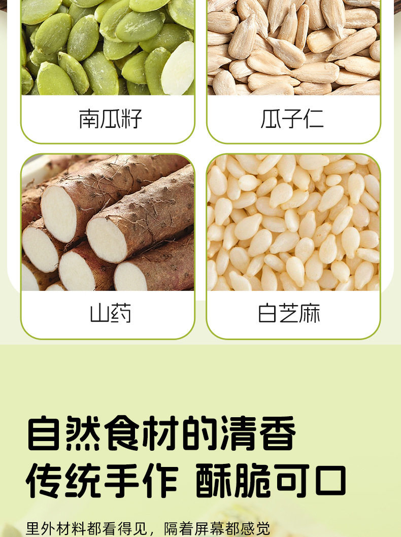 | Raw materials and ingredients | Melon seeds, pumpkin seeds, sesame seeds, yam powder, etc |
