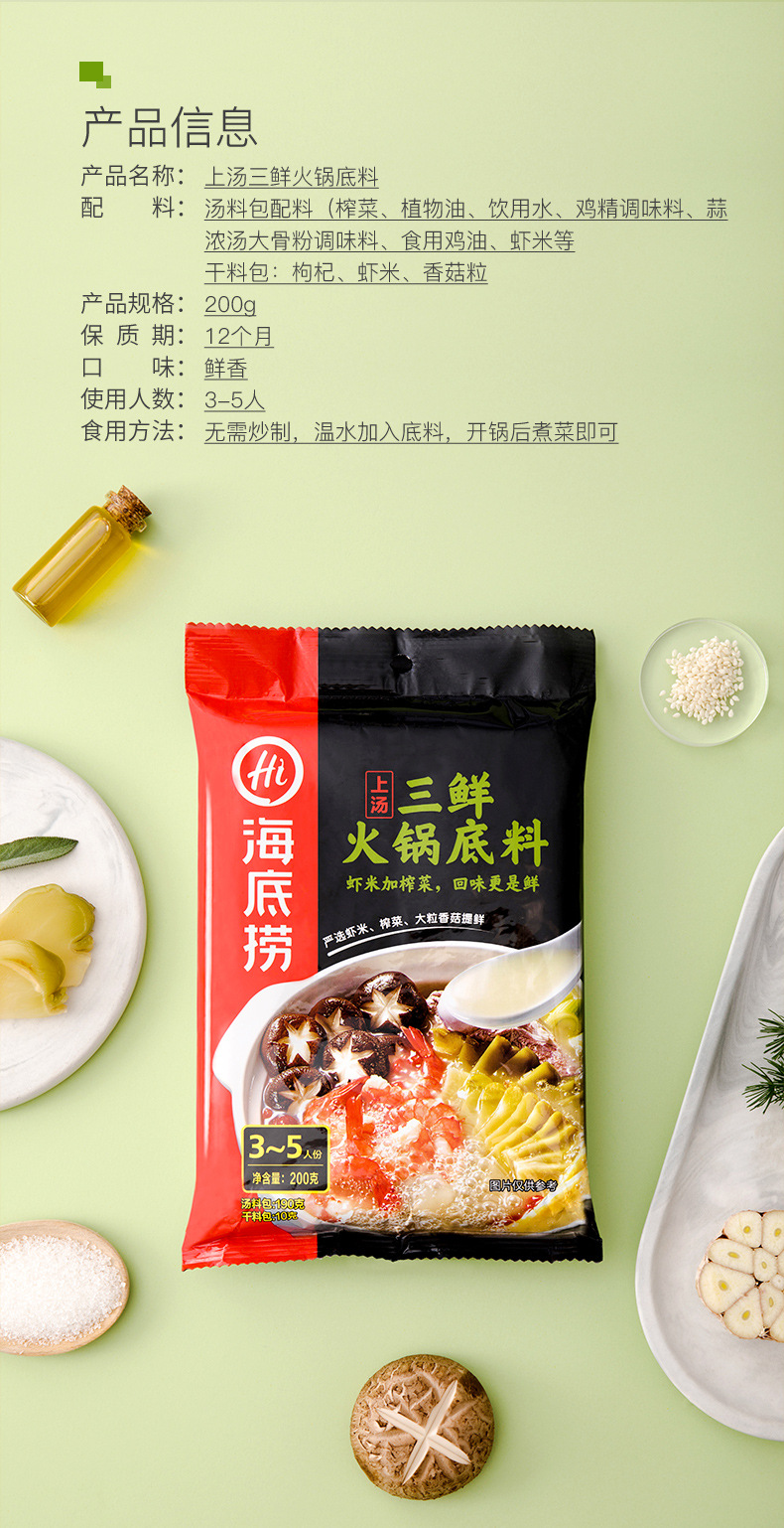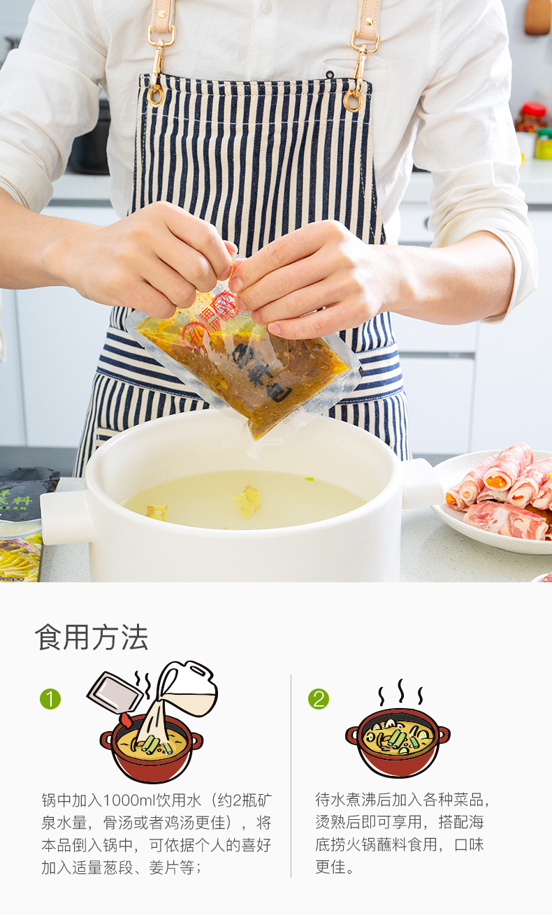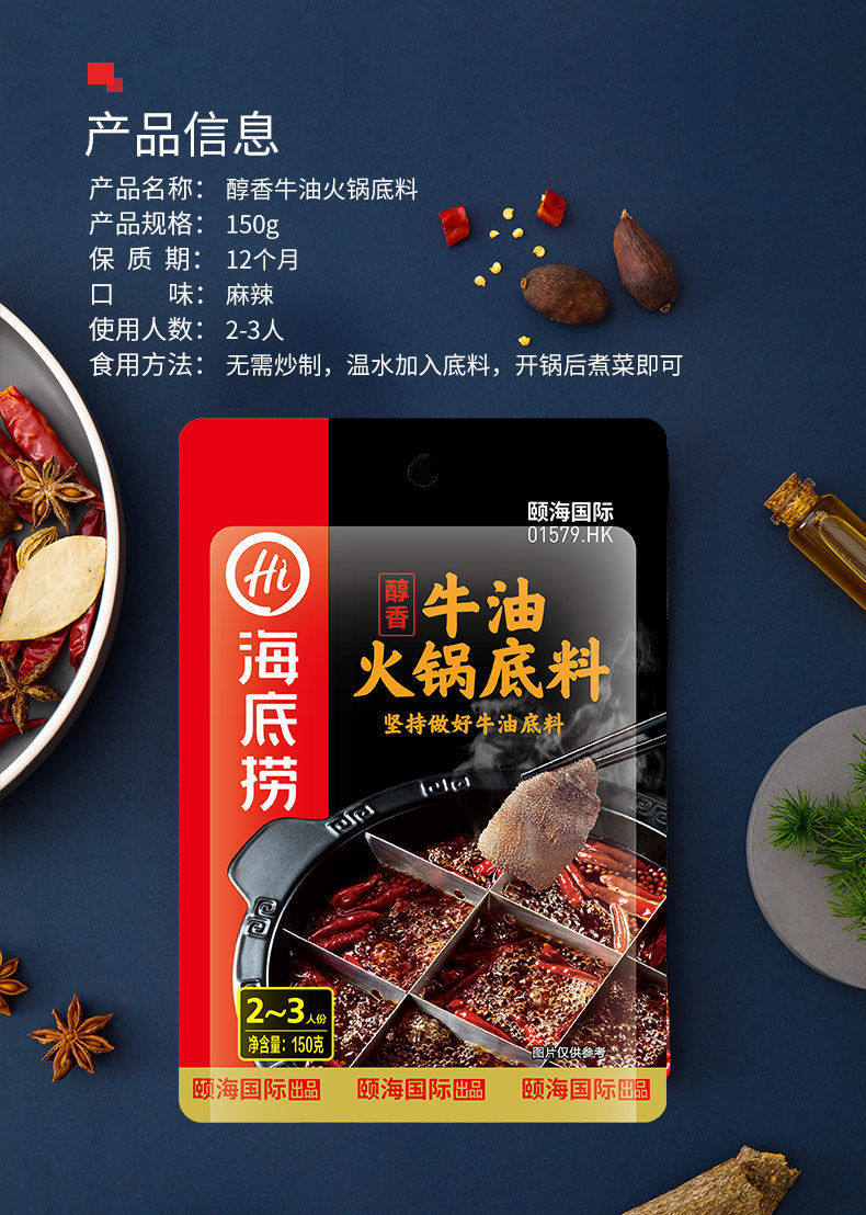 | Packaging specifications | Spicy crayfish 200g*18 bags,Thirteen kinds of fragrant crayfish 220g*18 bags,Japanese sukiyaki 160g*30 bags,Oden 50g*120 bags,Sour soup and fat beef 60g*120 bags,Rich butter 150g*40 bags,Mellow butter 150g*40 bags,Green pepper butter 150g*40 bags,Spicy butter 400g*40 bags,Butter 500g*16 bags,New product butter 90g*60 bags,New butter 200g*32 bags,New butter 360g*20 bags,New butter 500g*16 bags,Butter 360g*20 bags,Cube butter 90g*60 bags,Devil's spicy butter 90g*60 bags,Cantonese pepper pork belly chicken 190g*34 bags,Spicy clear oil 220g*34 bags,Sour tomatoes 200g*34 bags,Fresh and fragrant soup 110g*34 bags,Three delicacies in soup 200g*34 bags,Tom yum 210g*34 bags,Fresh mushroom soup 110g*34 bags,Fat tomato 220g*34 bags,Mild spicy bone soup 210g*34 bags,Beef bone flavor clear soup 200g*34 bags,Guizhou style red sour soup 240g*34 bags,Large particle mushroom soup 180g*18 bags,Delicious clear soup 160g*32 bags,Clear oil spicy 160g*32 bags,Wild mountain delicacy mushroom soup 143g*34 bags,Really thick tomatoes 300g*24 bags,Tomato 125g*40 bags,Spicy clear oil 120g*40 bags,Agaricus blazei mushroom soup 100g*40 bags,Three delicacies in soup 100g*40 bags,Guizhou red sour soup 120g*40 bags,Tom yum 120g*40 bags,Tomato 90g*60 bags,Spicy hotpot 220g*34 bags,Spicy hot pot 220g*34 bags,Sauce-flavored hotpot 220g*34 bags,Mapo tofu 80g*40 bags,Fish flavored shredded pork 100g*40 bags,Boiled meat slices 100g*40 bags,Stewed yellow sauce 180g*18 bags,Sour soup and fat beef 200g*18 bags,Braised sauce 200g*18 bags,Golden soup pickled fish 230g*24 bags,Laotan pickled fish 230g*24 bags,Laotan pickled fish 370g*24 bags,Sauerkraut fish with soup 360g*24 bags,Pickled pepper fish soup 210g*24 bags,Premium boiled fish 210g*24 bags,Golden soup pickled fish 300g*24 bags,Sour pickled fish with vine pepper 210g*24 bags,Pickled radish and duck soup 350g*30 bags,Spicy marinade 120g*50 bags,Five-spice marinade 120g*50 bags,Spiced sausage 220g*30 bags,Spicy sausage 220g*30 bags,Cantonese sausage 220g*30 bags,Original dipping sauce 120g*40 bags,Spicy dipping sauce 120g*40 bags,Spicy dipping sauce 120g*40 bags,Peanut sesame paste 100g*40 bags,Spicy dry dish 30g*40 bags,Leek flower sauce dipping sauce 100g*40 bags,Beef sauce dipping sauce 80g*40 bags,Scallop and mushroom sauce 80g*40 bags,Garlic dipping sauce 90g*40 bags,Seafood dipping sauce 120g*40 bags,Shacha sauce dipping 80g*40 bags,Thin salt original dipping sauce 150g*50 bags,Thin salt spicy dipping sauce 150g*50 bags |