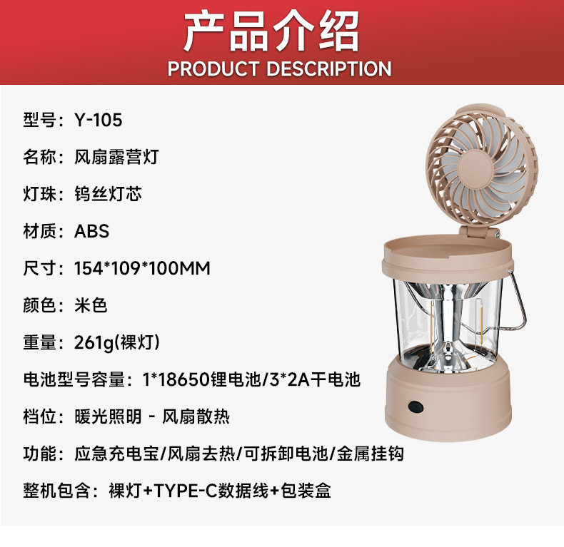 | Colors | Y-105 fan camping light (color box + data cable + dry battery) |