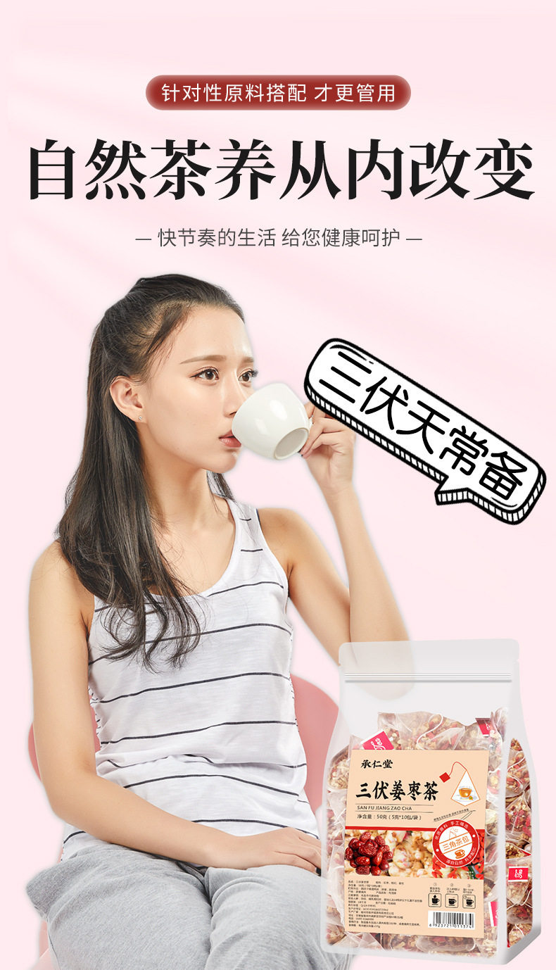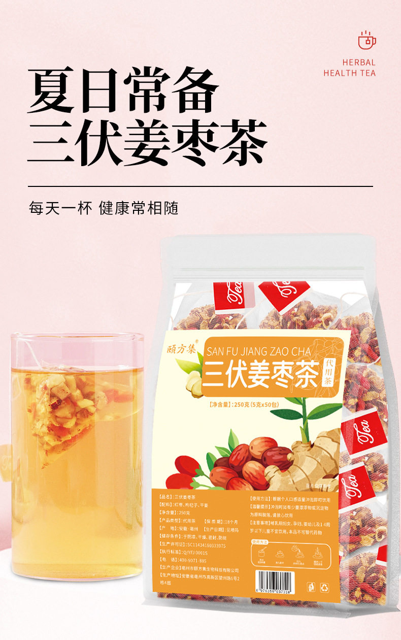 | Packaging specifications | Sanfu ginger and jujube tea (5g x 20 bags)/bag,Sanfu ginger and jujube tea (5g x 30 bags)/bag |