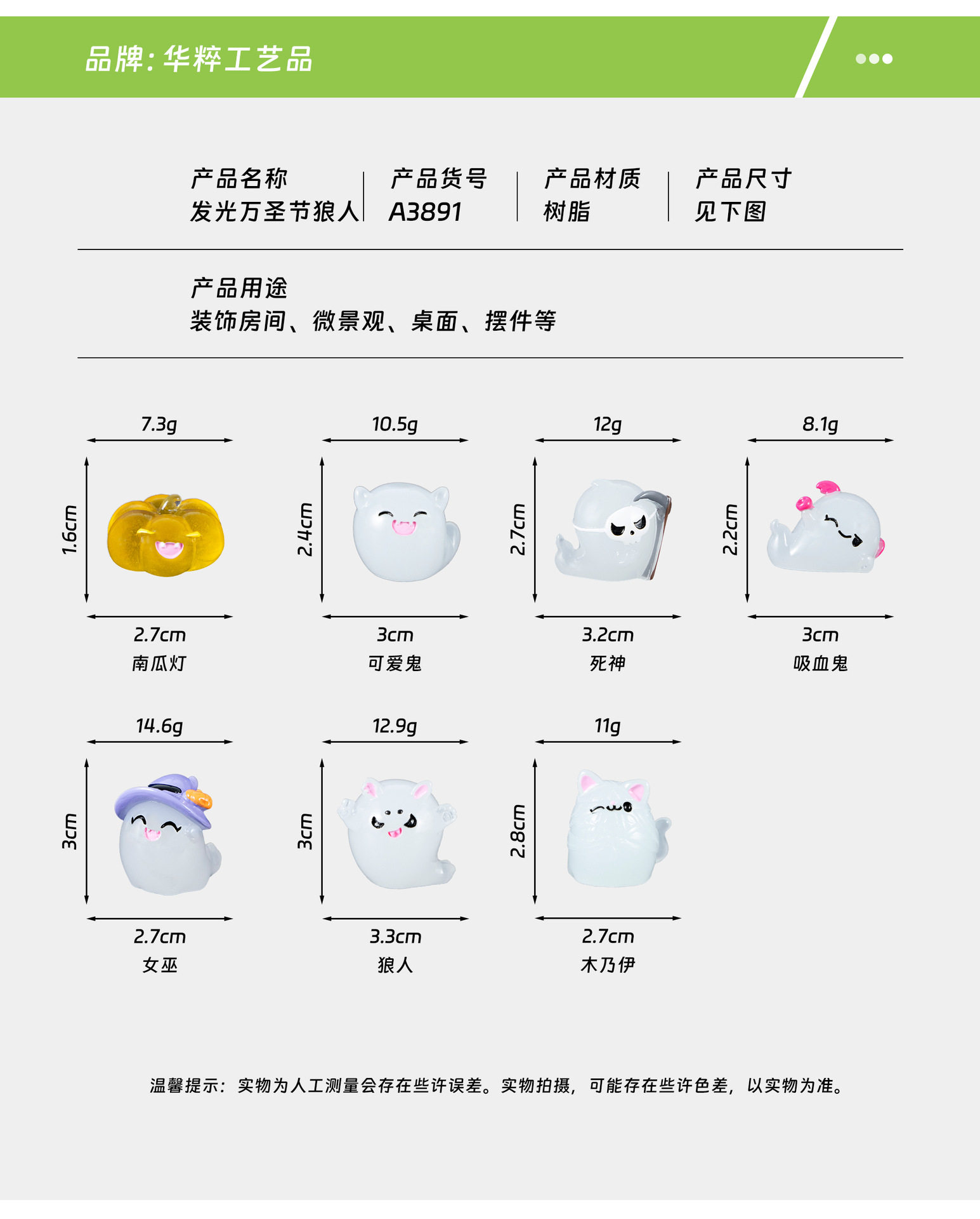 | Color | Witch,Werewolf,Cute ghost,Pumpkin lamp,Mummy,Vampire,Death |