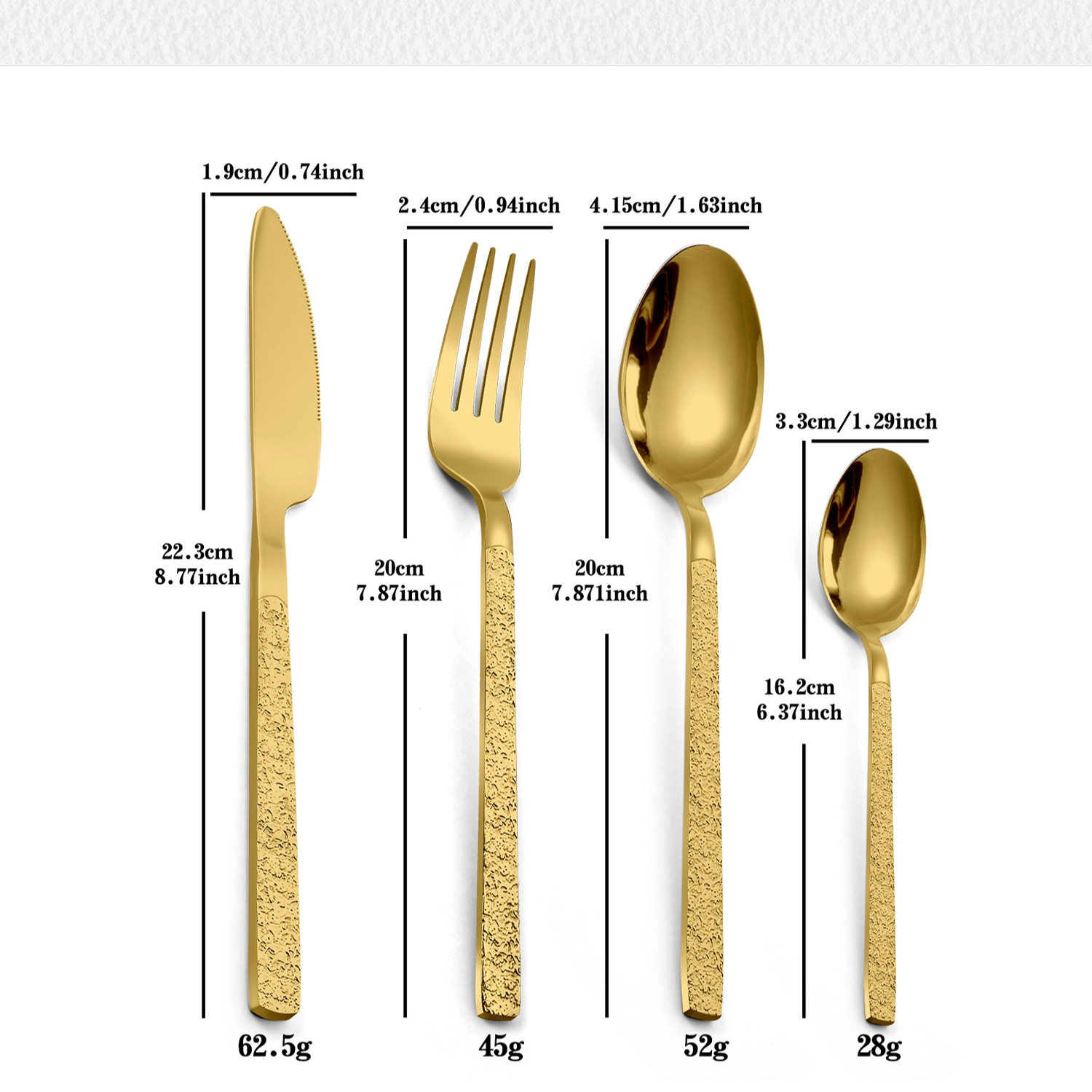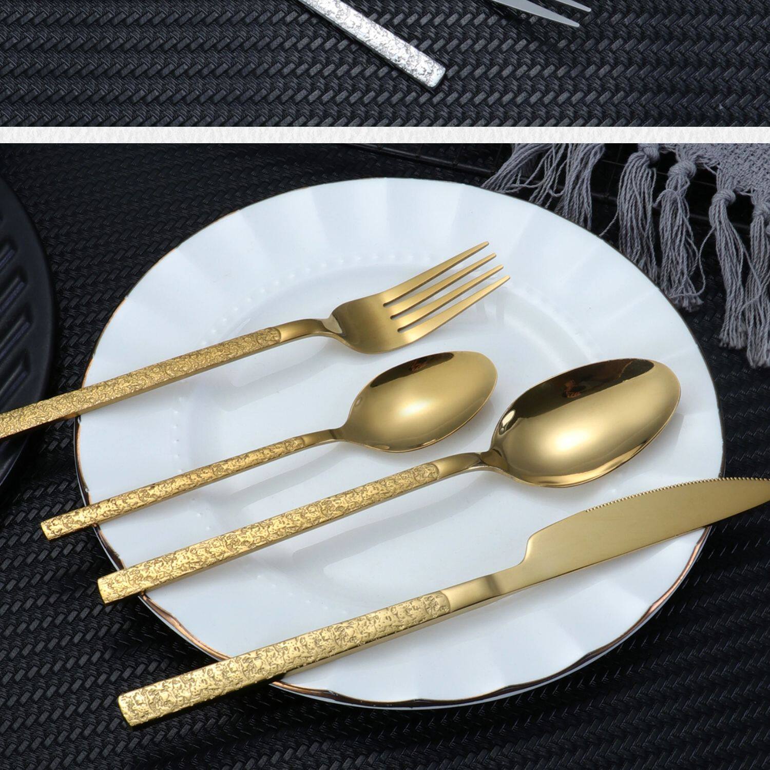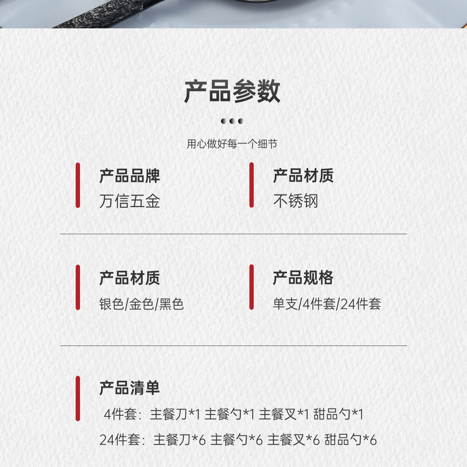 | Color | Silver main table knife,Silver serving spoon,Silver main fork,Silver dessert spoon,Silver 4-piece set,Silver 24-piece set,Golden main table knife,Golden serving spoon,Golden main fork,Golden dessert spoon,Gold 4-piece set,Gold 24-piece set,Black main table knife,Black serving spoon,Black main fork,Black dessert spoon,Black 4-piece set,Black 24-piece set |