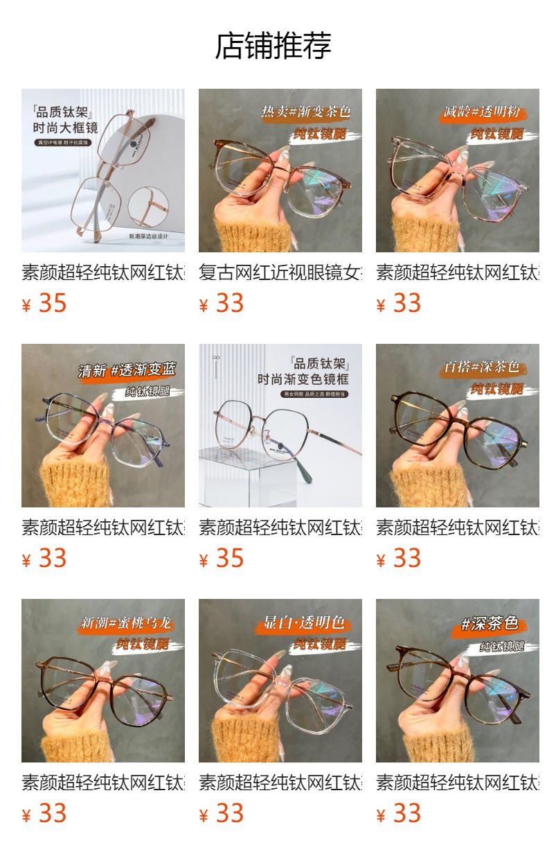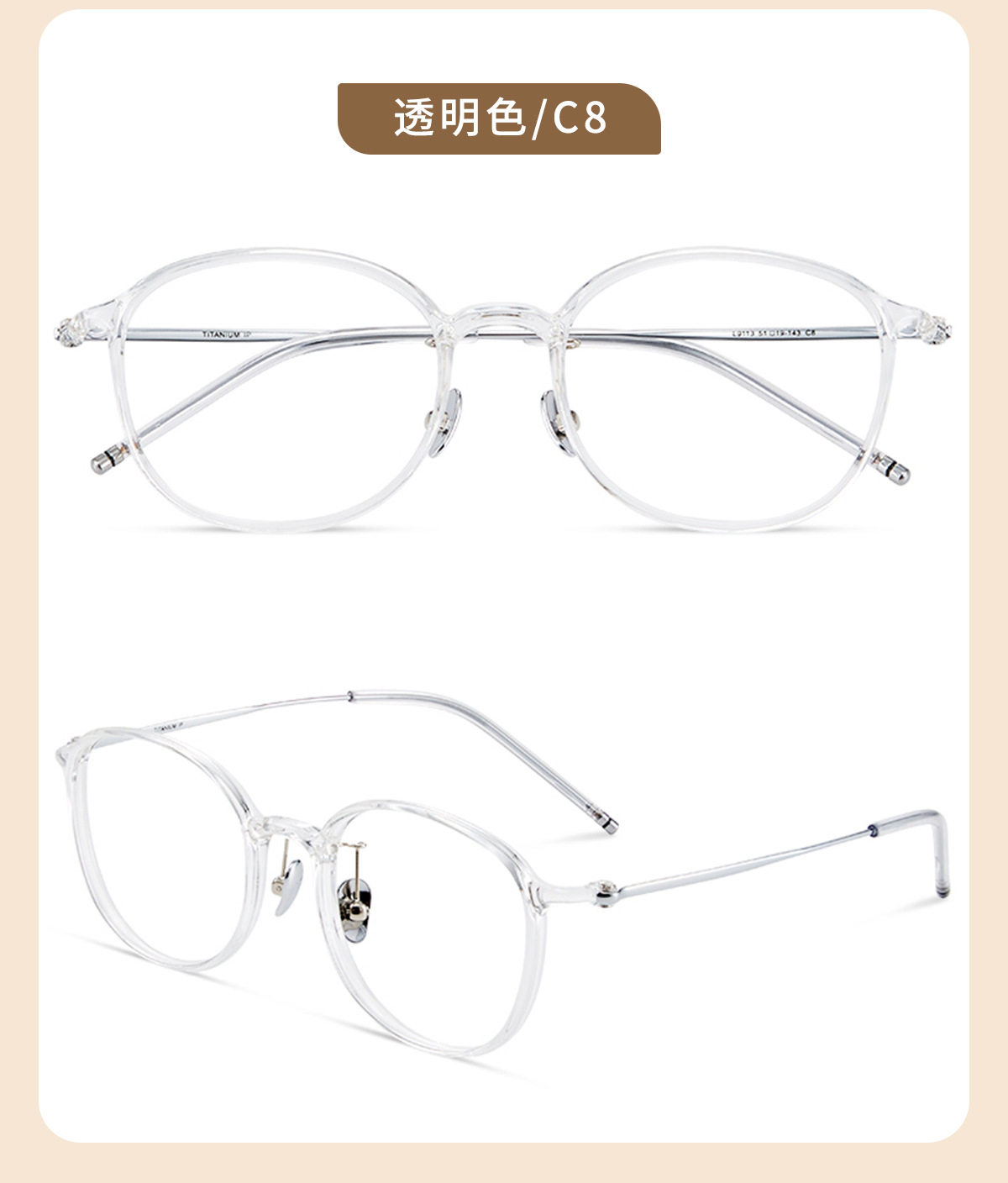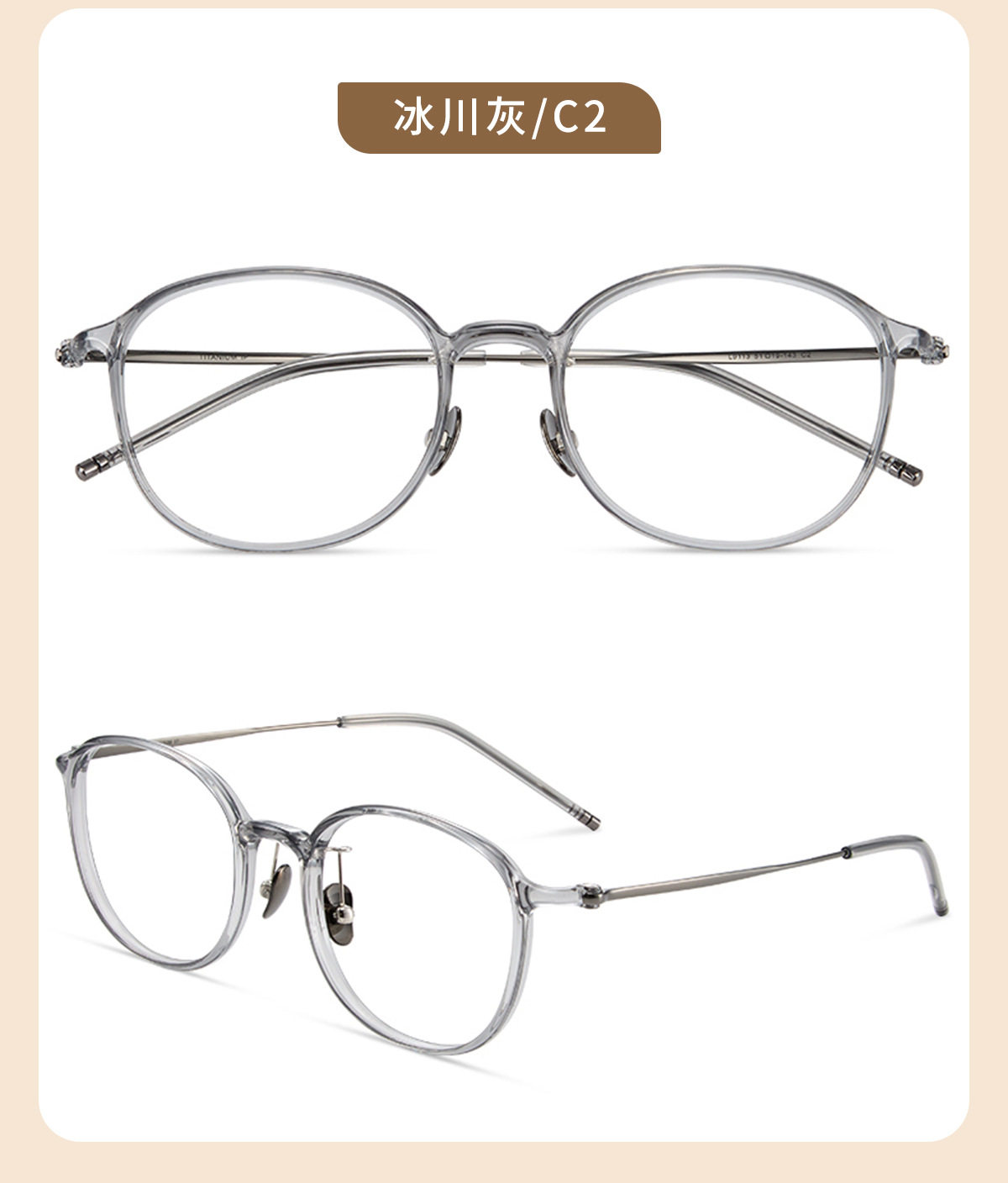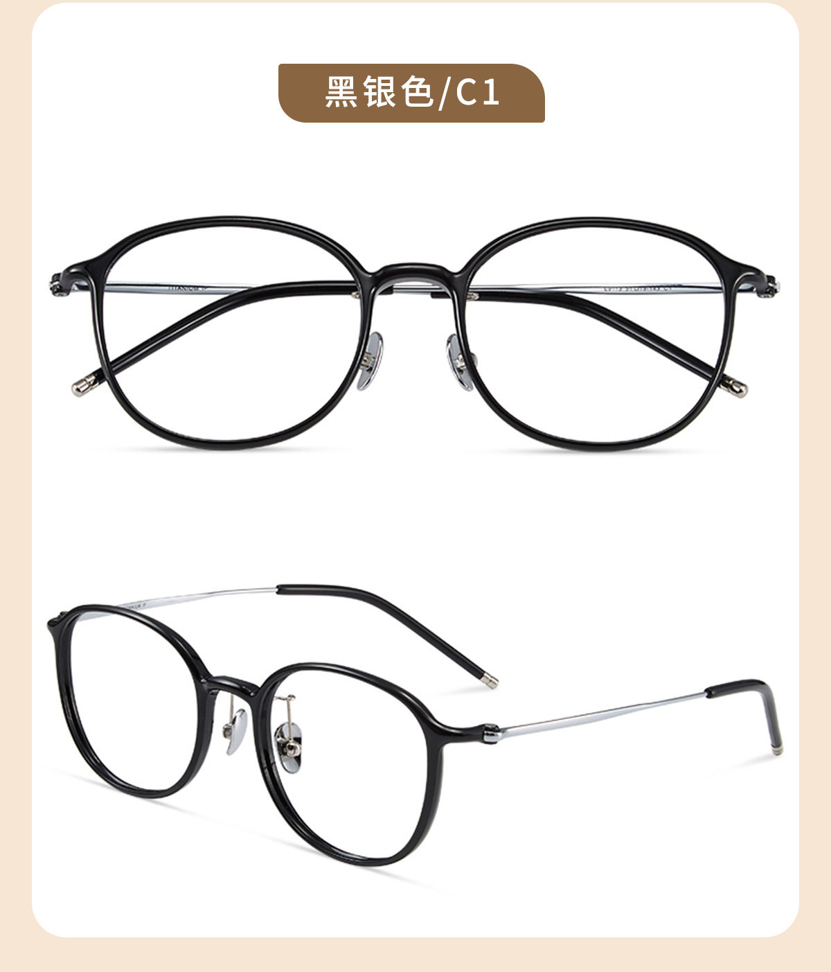 | Frame color | Black silver c1,Glacier gray c2,Cold brown c5,Transparent light pink c7,Transparent color c8,Amber brown c15 (80% customer choice) |