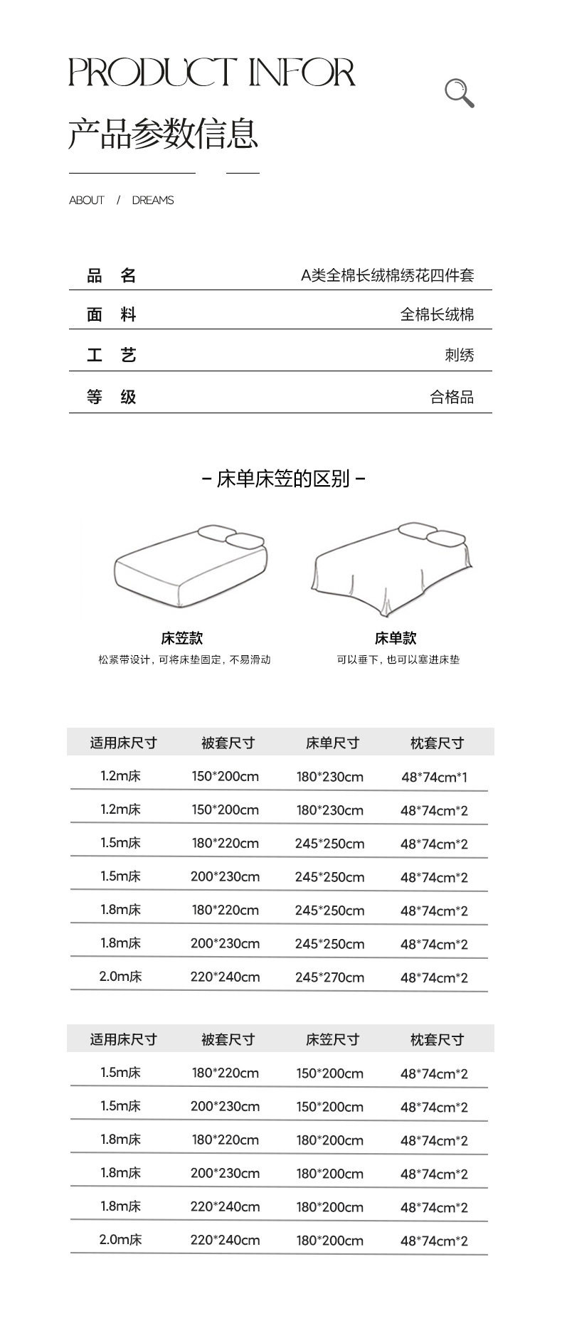 | Dimensions | Single quilt cover (suitable for 150*200 quilt core),Single quilt cover (suitable for 180*220 quilt core),Single quilt cover (suitable for 200*230 quilt core),Single quilt cover (suitable for enlarging 220*240 quilt core),1.2m bed sheet three-piece set (suitable for 150*200 quilt core),1.5m bed sheet four-piece set (suitable for 180*220 quilt core),1.5m bed sheet four-piece set (suitable for 200*230 quilt core),1.8m bed sheet four-piece set (suitable for 180*220 quilt core),1.8m bed sheet four-piece set (suitable for 200*230 quilt core),2.0m bed sheet four-piece set (suitable for enlarging 220*240 quilt core),1.5m fitted sheet set of four (suitable for 180*220 quilt core),1.5m fitted sheet set of four (suitable for 200*230 quilt core),1.8m fitted sheet set of four (suitable for 180*220 quilt core),1.8m fitted sheet set of four (suitable for 200*230 quilt core),1.8m fitted sheet set of four (suitable for enlarging 220*240 quilt core) |