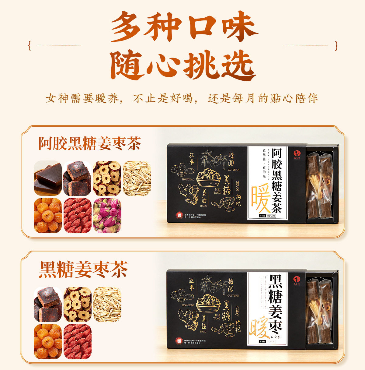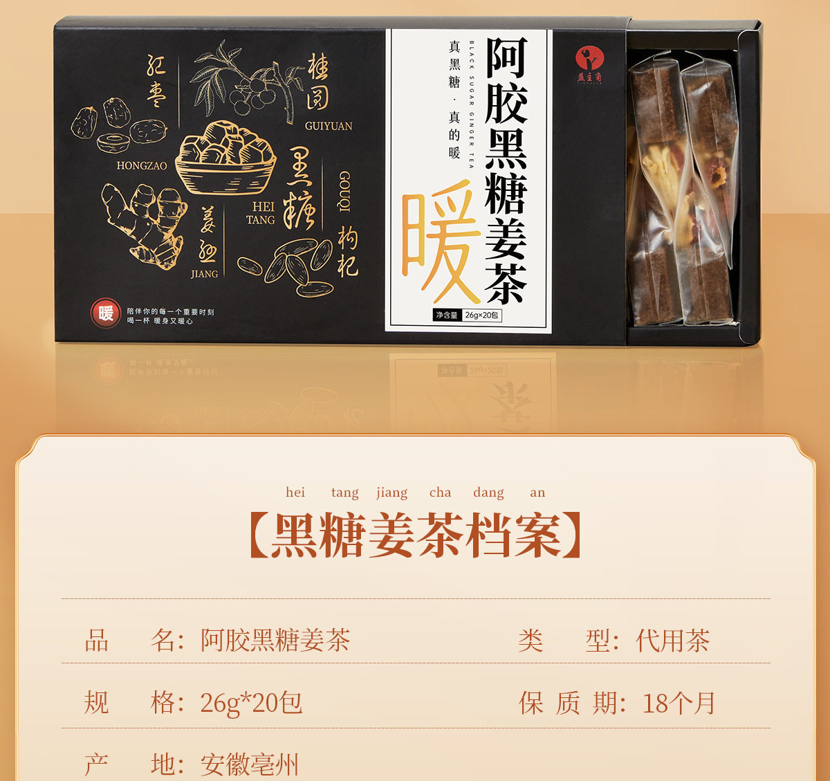 | Packaging specifications | Upgraded donkey hide gelatin brown sugar ginger and jujube tea [520g, 20 packs in total],Brown sugar ginger and jujube tea [520g, 20 packs in total],Brown sugar ginger and jujube tea [520g, 20 packs in total],Brown sugar ginger jujube tea + brown sugar ginger jujube tea [discount 3 yuan, two boxes, 40 packs in total],Brown sugar ginger and jujube tea [discount 3 yuan, two boxes, 40 packs in total],Brown sugar ginger and jujube tea [discount 6 yuan, three boxes, 60 bags in total],Upgraded donkey hide gelatin brown sugar ginger and jujube tea [discount 5 yuan, two boxes, 40 packs in total] |