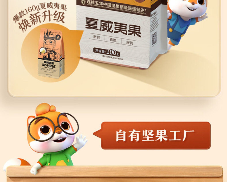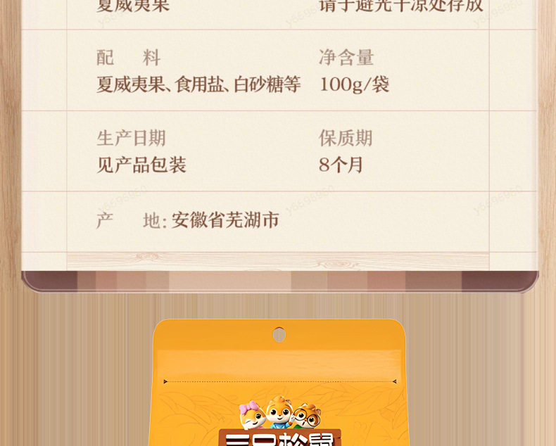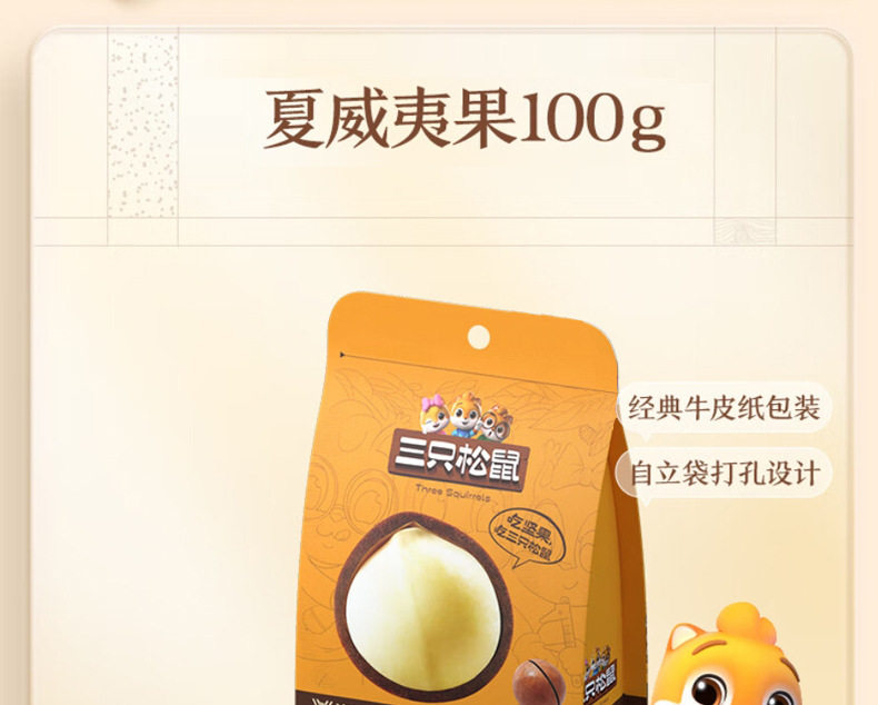 | Packaging specifications | Three squirrels_macadamia nuts 100g*1 bag,Three squirrels_macadamia nuts 100g*2 bags,Three squirrels_macadamia nuts 100g*3 bags,Three squirrels_macadamia nuts 100g*5 bags,Three squirrels_macadamia nuts 100g*10 bags |