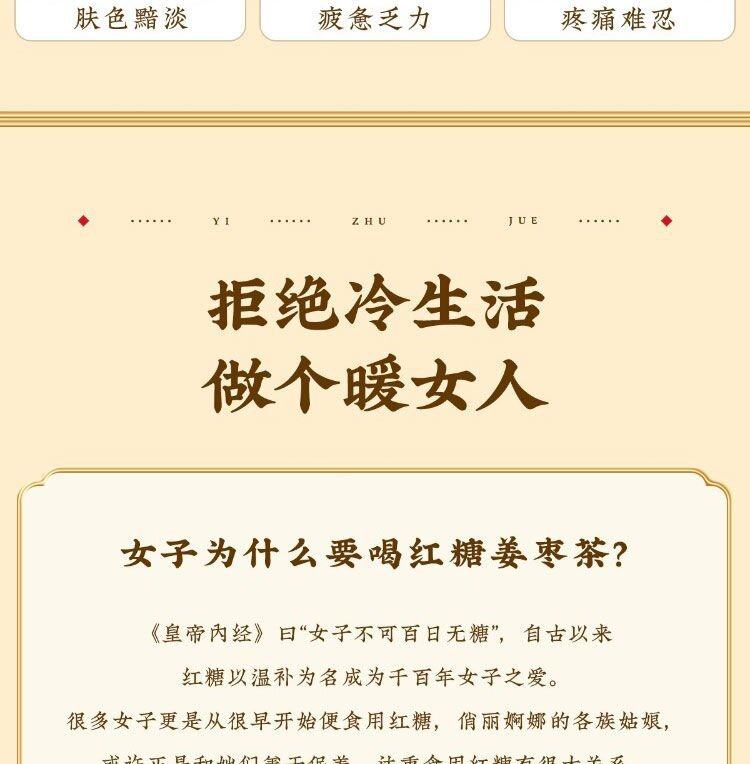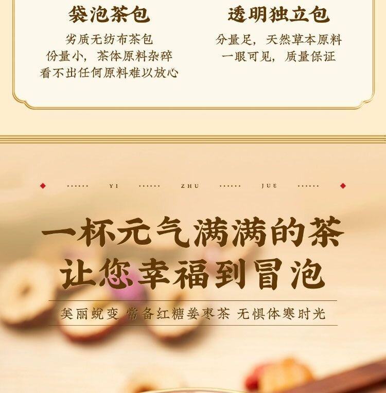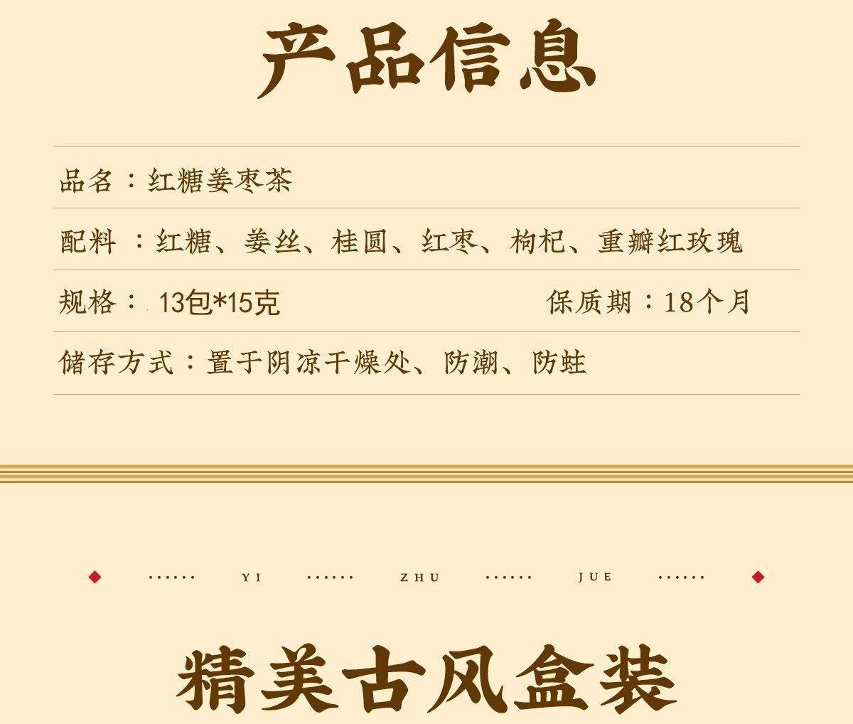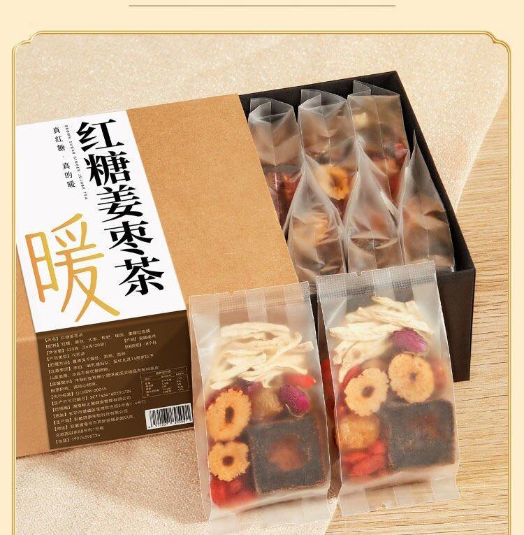| Packaging specifications | Brown sugar ginger jujube tea in a box [15g*13 bags] |