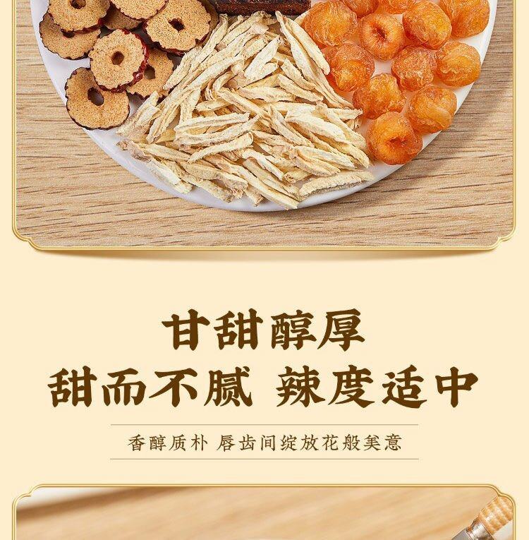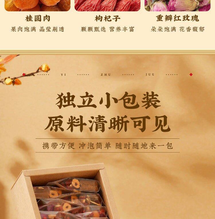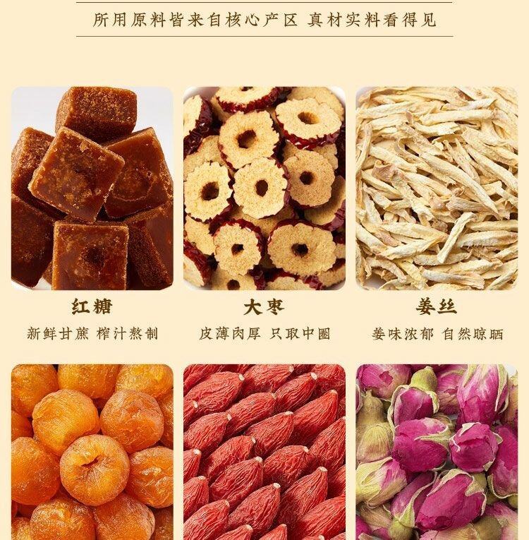 | Raw materials and ingredients | Brown sugar cubes, longan, wolfberry, red dates, shredded ginger, rose |