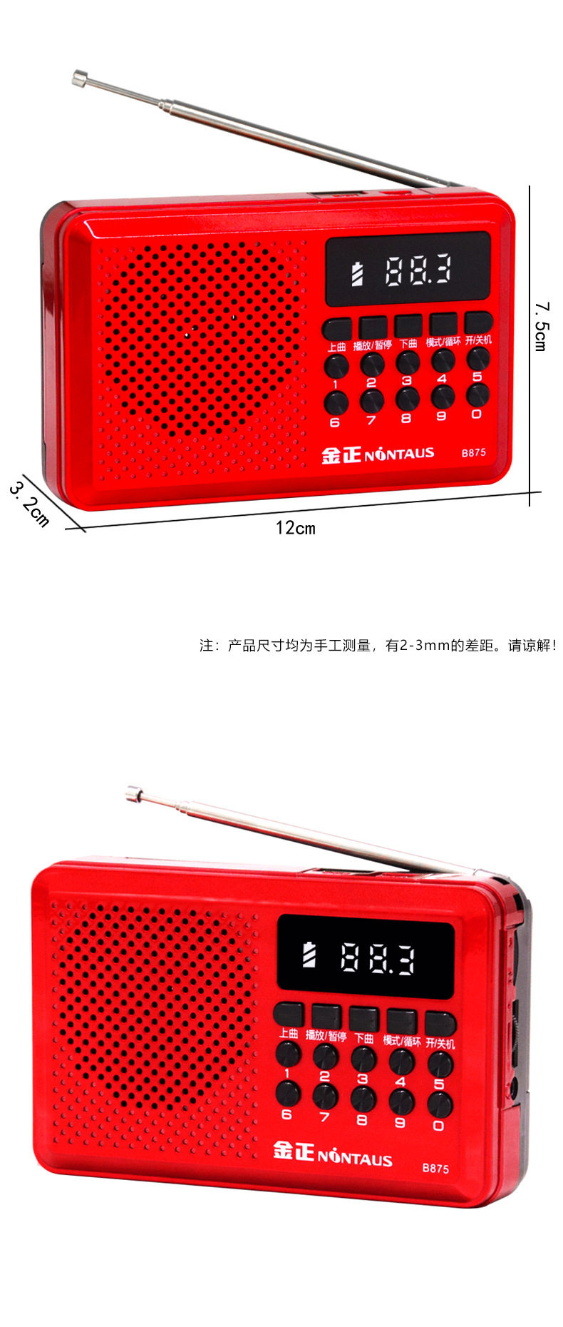 | Color | Jinzheng b875 (supports: bluetooth + usb flash drive + tf card + headphones),Jinzheng kk69bt (supports: bluetooth + usb flash drive + tf card + headphones),Jinzheng s61 (supports: tf card + headphones),Modern h853sbt (supports: recording + bluetooth + usb flash drive + tf card + headphones),Hyundai h866a (supports: tf card + headphones),Modern h832 (supports: recording + bluetooth + usb flash drive + tf card + headphones + folder) random color,Modern h837 (supports: recording + bluetooth + usb flash drive + tf card + headphones + scheduled shutdown) color random,Modern t98bt (supports: bluetooth + usb flash drive + tf card + headphones),Xiaobawang s62 (supports: tws interconnection + bluetooth + usb flash drive + tf card + headphones + scheduled shutdown) random color,Xiaobawang s52 (supports: bluetooth + usb flash drive + tf card + headphones) random color |