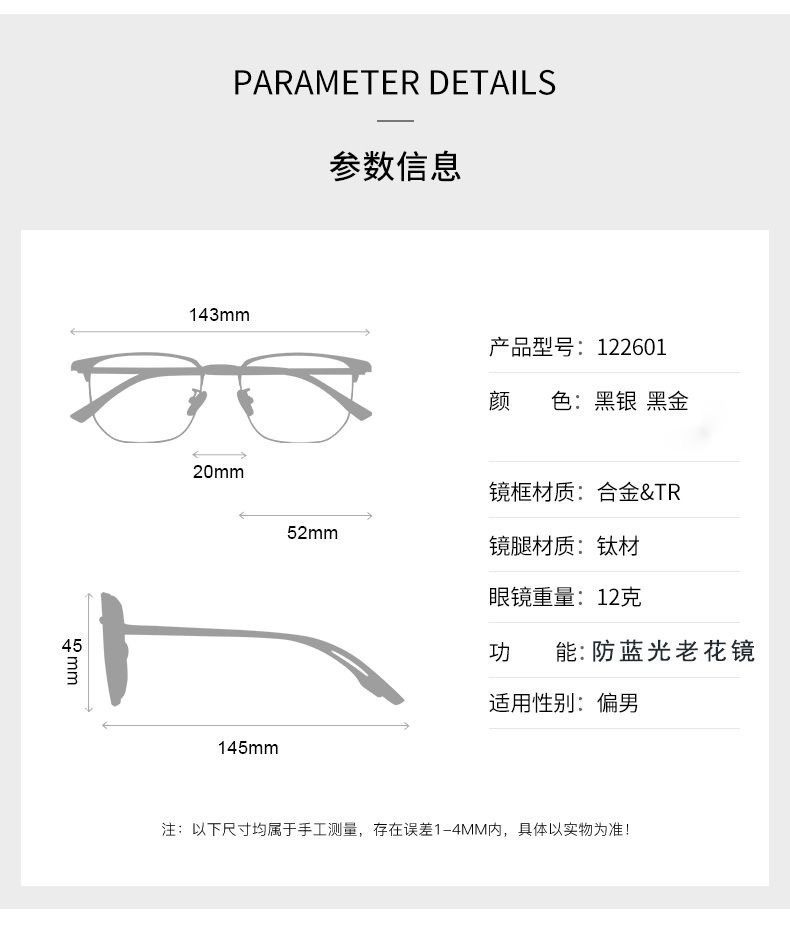 | Frame color | 601 black gold frame,601 black silver model,602 black gold,602 black silver frame,602 transparent gray frame,603 gold,603 silver,605 black gold frame,605 black silver model,619 black silver model,619 black gold frame,619 transparent gray frame,603 gold frame discoloration gray,603 silver frame discoloration gray,602 black gold turns gray,602 black gold tea,602 black silver turns gray,602 black silver tea |