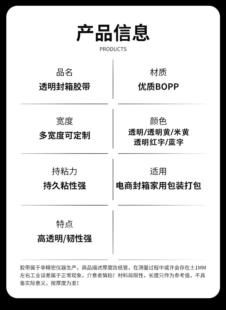 | Scope of application | In terms of packaging, sealing, general sealing repair, bundling and fixing, it can be used on light packaging objects according to the thickness of the substrate. |