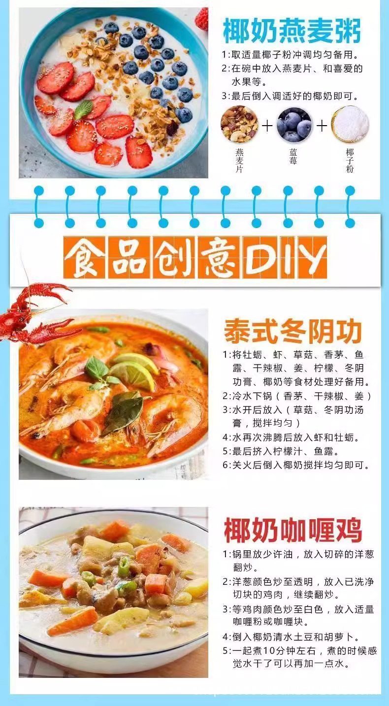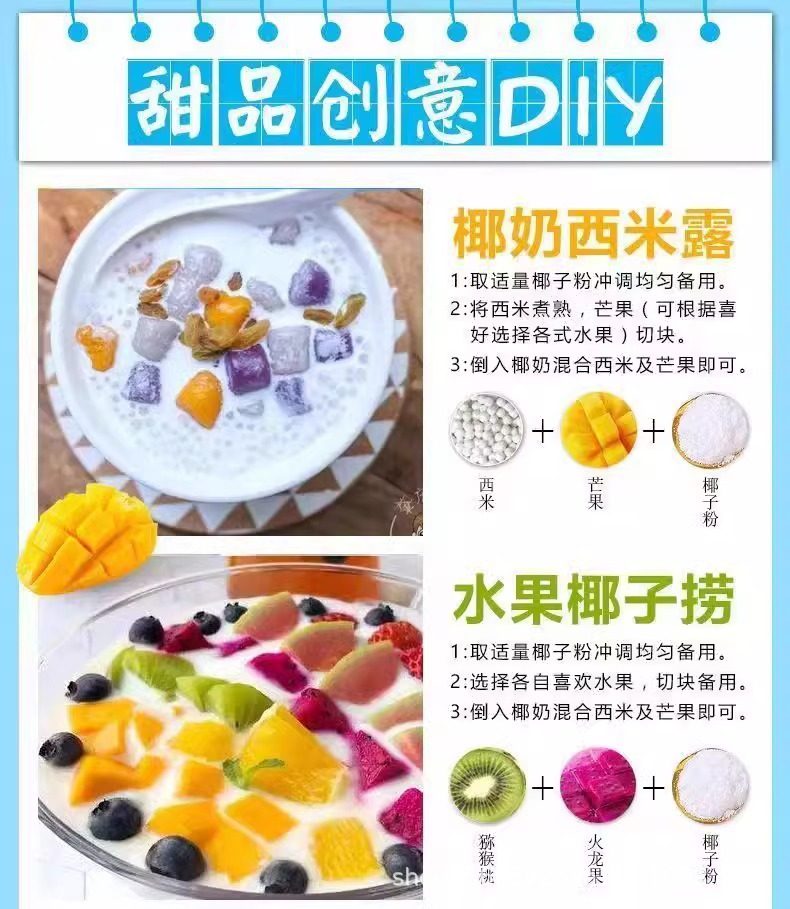 Packaging specifications Mellow coconut powder sample 30g,Mellow coconut powder 500g per pack,Mellow coconut powder 500g two packs,Mellow coconut powder 500g five packs,Mellow coconut powder 500g ten packs,Mellow coconut powder 500g twenty packs