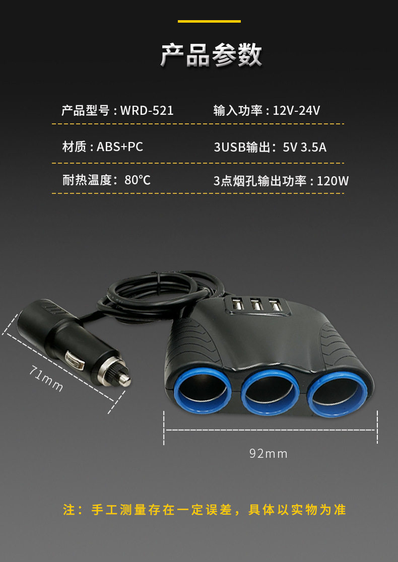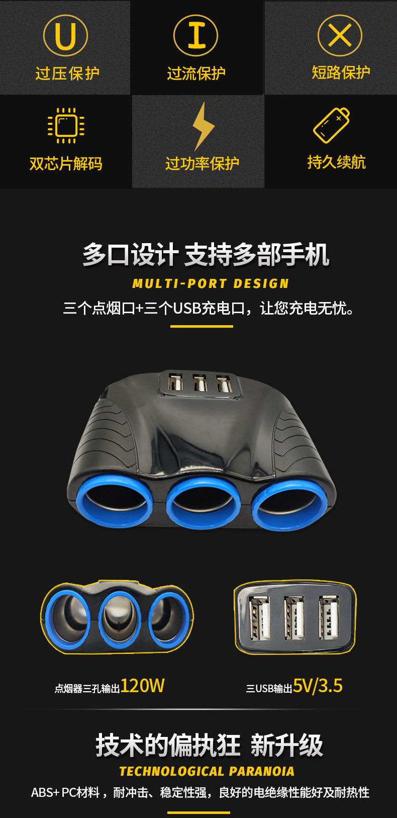 | Model | 3 cigarette smoke holes (120w) +3usb (5v/3.5a) |
