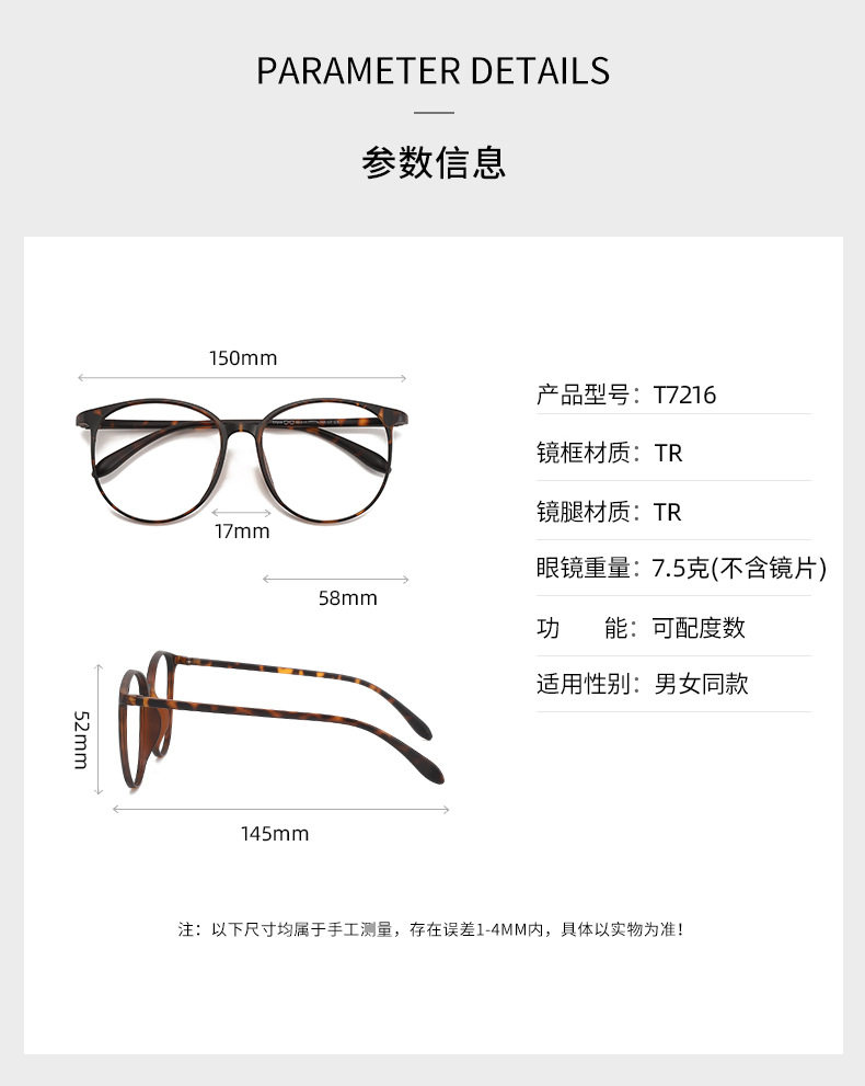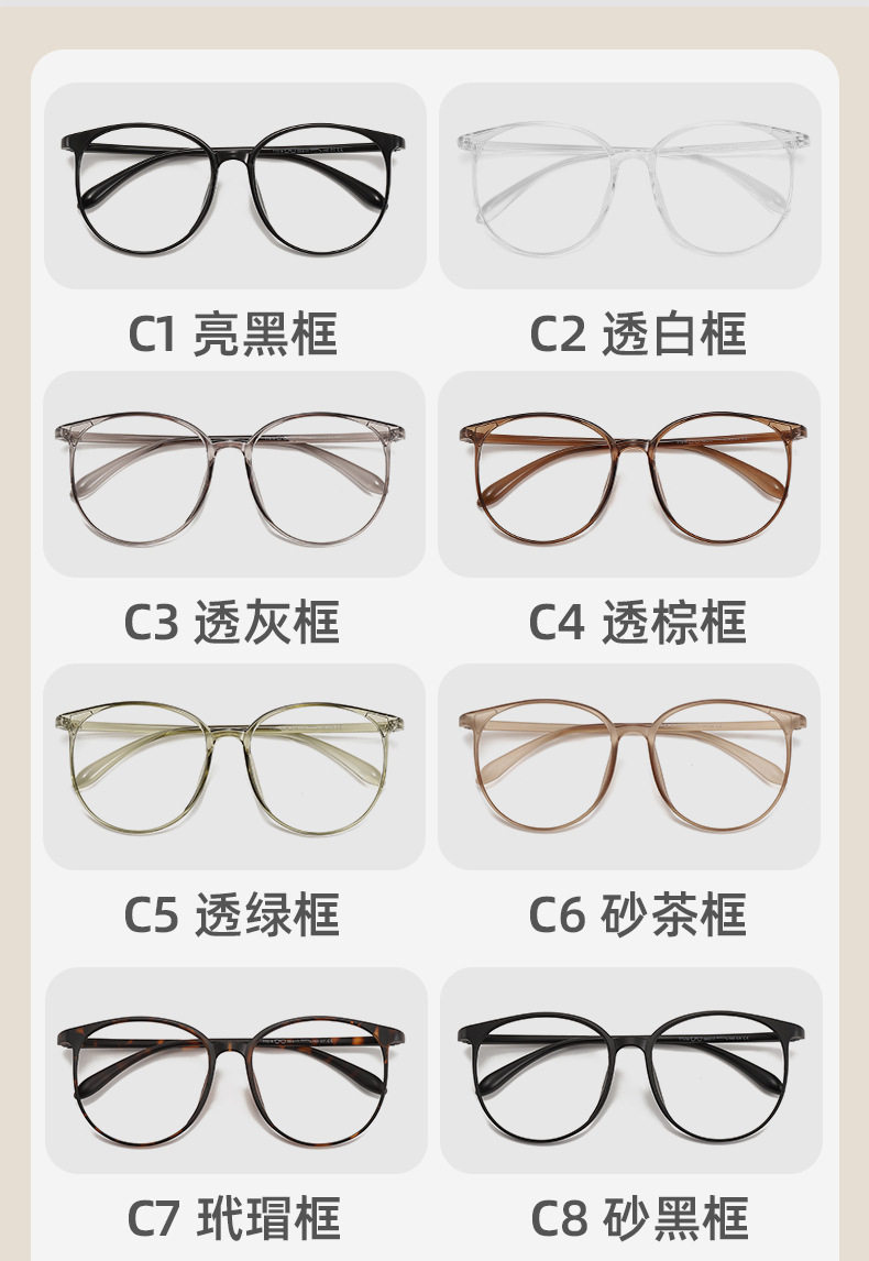 | Frame color | Bright black c1,Transparent white c2,Transparent gray c3,Transparent tea c4,Translucent green c5,Frosted coffee c6,Tortoiseshell c7,Matte black c8 |
