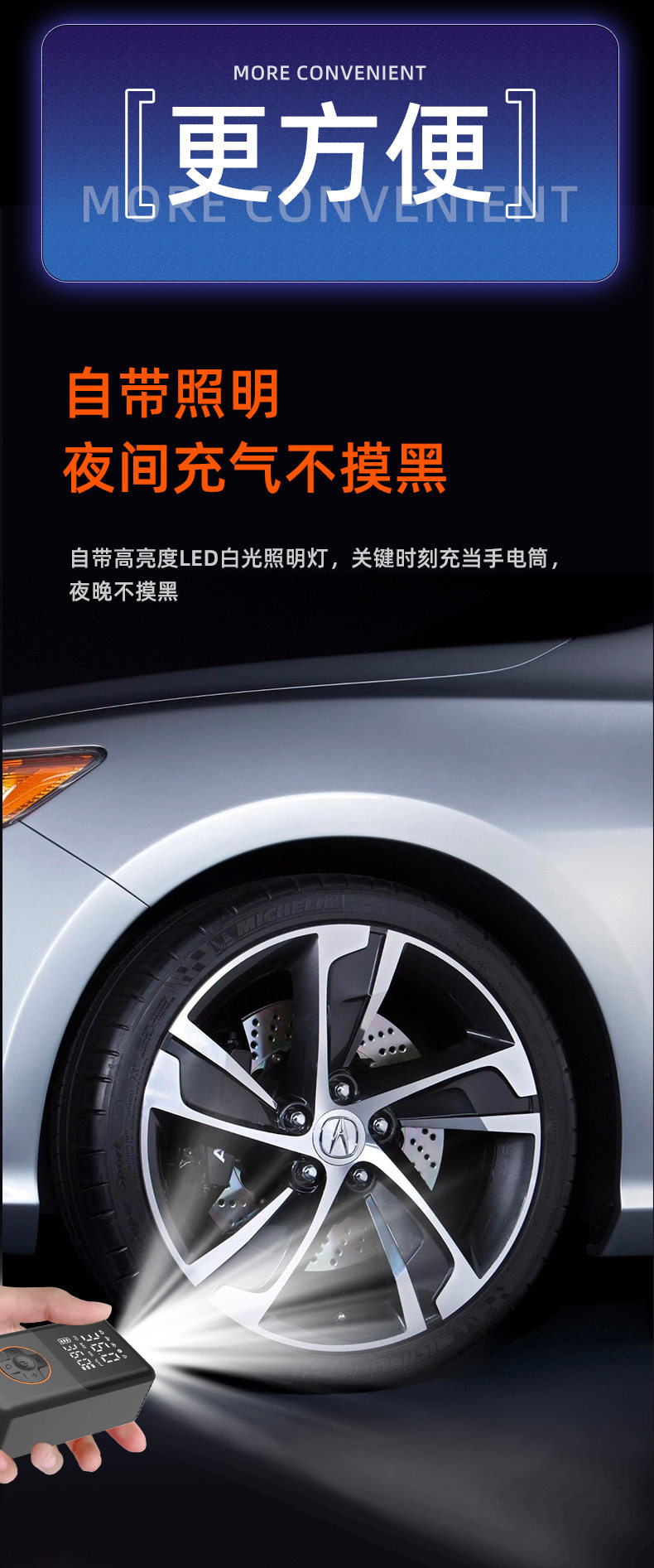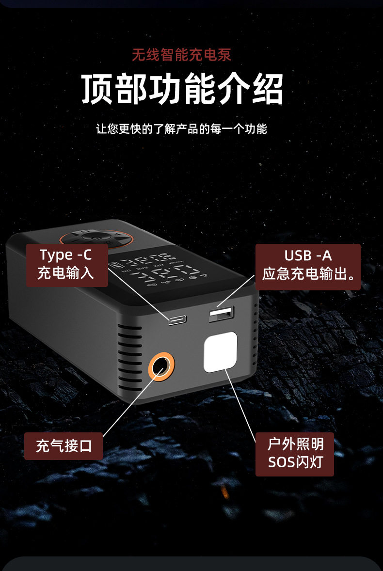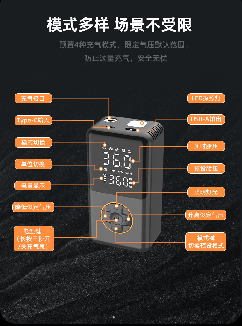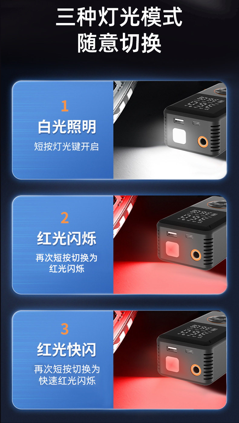 | Additional functions | Lighting,Tire pressure gauge,Warning light,Usb charging |