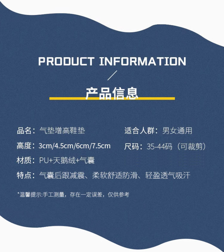 | Color | Black one layer full pad (heightened by 3cm),Black two-layer full pad (increased by 4.5cm),Black three-layer full pad (increased by 6cm),Black four-layer full pad (increased by 7.5cm),Heighten half pad with a layer (heightened by 3cm) |