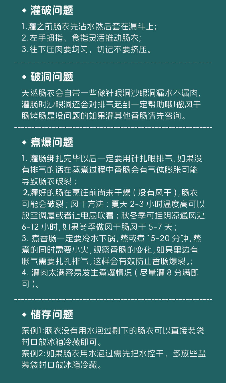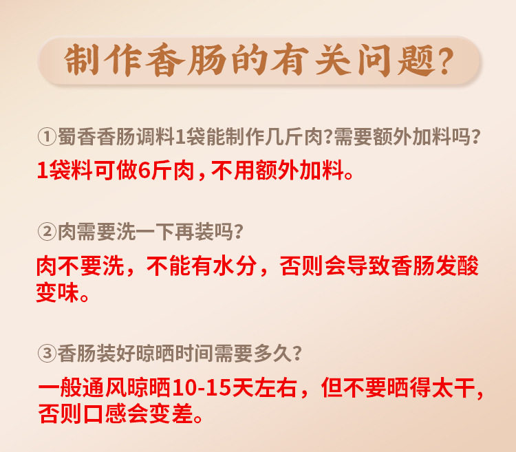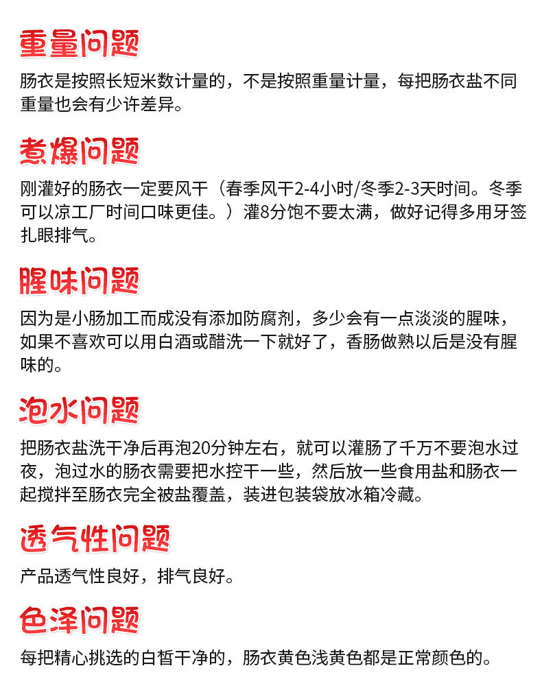 | Specifications | Spicy flavor 220gx1 bag (can make 3kg meat),Extra spicy flavor 220gx1 bag (can make 3kg meat),Sichuan flavor 220gx1 bag (can make 3kg meat),Five-flavor 220gx1 bag (can make 3kg meat),Not spicy] spiced 220gx1 bag,Guangwei 240gx1 bag (can make 3kg meat),1 bag only (can fill 5kg meat) without enema,Spicy flavor 1 bag + 1 bag of casings,1 bag of extra spicy + 1 bag of casings,Five scents 1 bag + 1 bag of casings,Not spicy] 1 bag of five spice + 1 bag of casings,Sichuan flavor 1 bag + 1 bag of casings,Guangwei 1 bag + 1 bag of casings,Spicy flavor 220gx2 bags,Extra spicy 220gx2 bags,Sichuan flavor 220gx2 bags,Five scents 220gx2 bags,Guangwei 240gx2 bags,Not spicy] spiced 220gx2 bags,Spicy three bags + 2 bags of casings [make 9kg fresh meat],Extra spicy three bags + 2 bags of casings [making 9kg fresh meat],Sichuan flavor three bags + 2 bags of casings [making 9kg fresh meat],Three bags of five scents + 2 bags of casings [making 9kg fresh meat],Not spicy] 3 bags of five spices + 2 bags of casings,Guangwei three bags + 2 bags of casings [making 9kg fresh meat],1 bag of extra spicy + 1 bag of five spices,1 bag of spicy + 1 bag of sichuan flavor,1 bag of spicy + 1 bag of five spices,1 bag of spicy + 1 bag of guangwei,1 bag of five incense + 1 bag of guangwei,1 bag of sichuan flavor + 1 bag of guangwei,Spicy flavor 220gx3 bags,Extra spicy 220gx3 bags,Sichuan flavor 220gx3 bags,Five scents 220gx3 bags,Not spicy] spiced 220gx3 bags,Guangwei 240gx3 bags,Spicy + [not spicy] five spices,Extra spicy + [not spicy] five spices,Guangwei + [not spicy] five spices,Cube cantonese flavor 280gx1 bag,Cube cantonese flavor 280gx2 bags,Cube cantonese flavor 280gx3 bags,1 bag of sesame candy + 1 bag of casings,3 bags of sesame candies + 2 bags of casings,Spicy pork ribs 220gx1 bag,Spicy pork ribs 220gx2 bags,Spicy pork ribs 220gx3 bags,20 s-shaped hooks,1 bag of casing + 20 s-shaped hooks,[fill about 30kg left] commercial casings (1 large bag) 9 ways about 40m,Sauce meat 300gx1 bag,Sauce meat 300gx2 bags,Sauce meat 300gx3 bags,Bacon 300gx1 bag,Bacon 300gx2 bags,Bacon 300gx3 bags,Old bacon 300gx1 bag,Old bacon 300gx2 bags,Old bacon 300gx3 bags,Tai bai braised pork, 300g x 1 bag,Tai bai braised pork, 300g x 2 bags,Tai bai braised pork, 300g x 3 bags,Rotating enema device [1 sausage tube],[thickened] hand-push enema device [3 sausage tubes] |