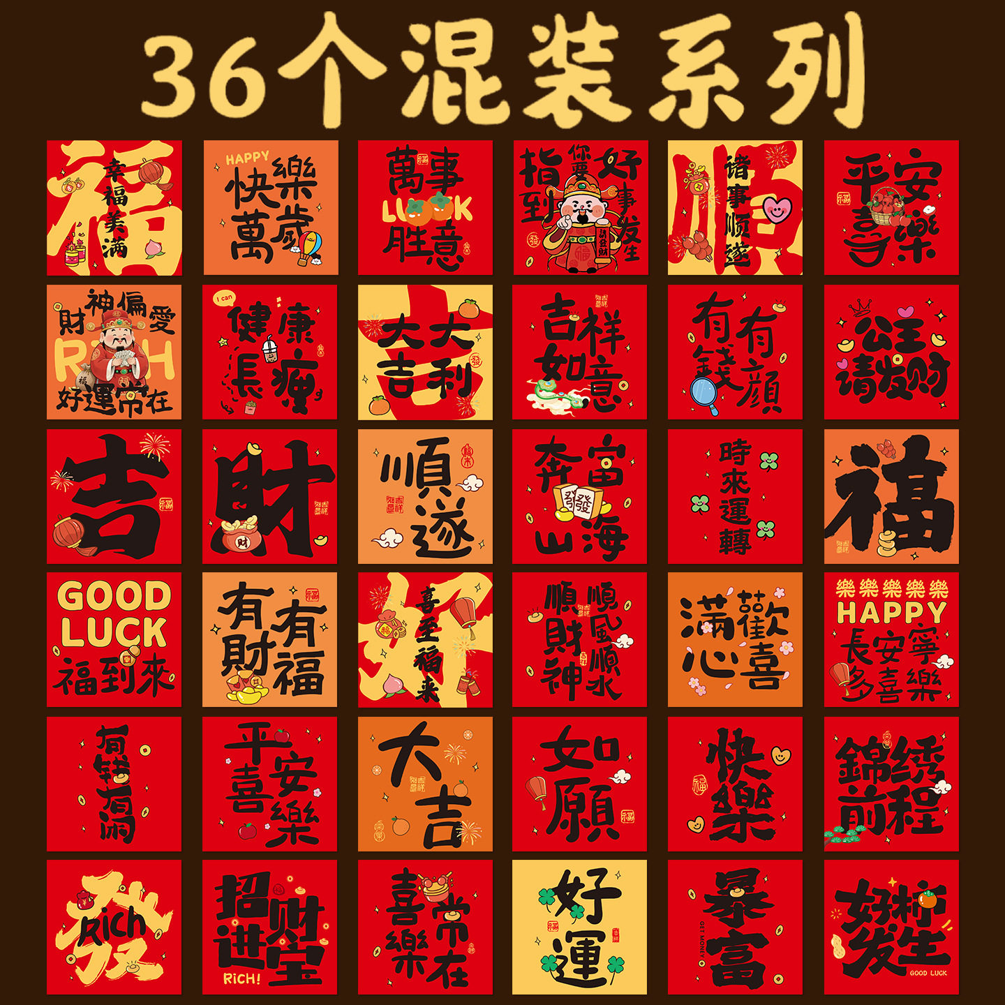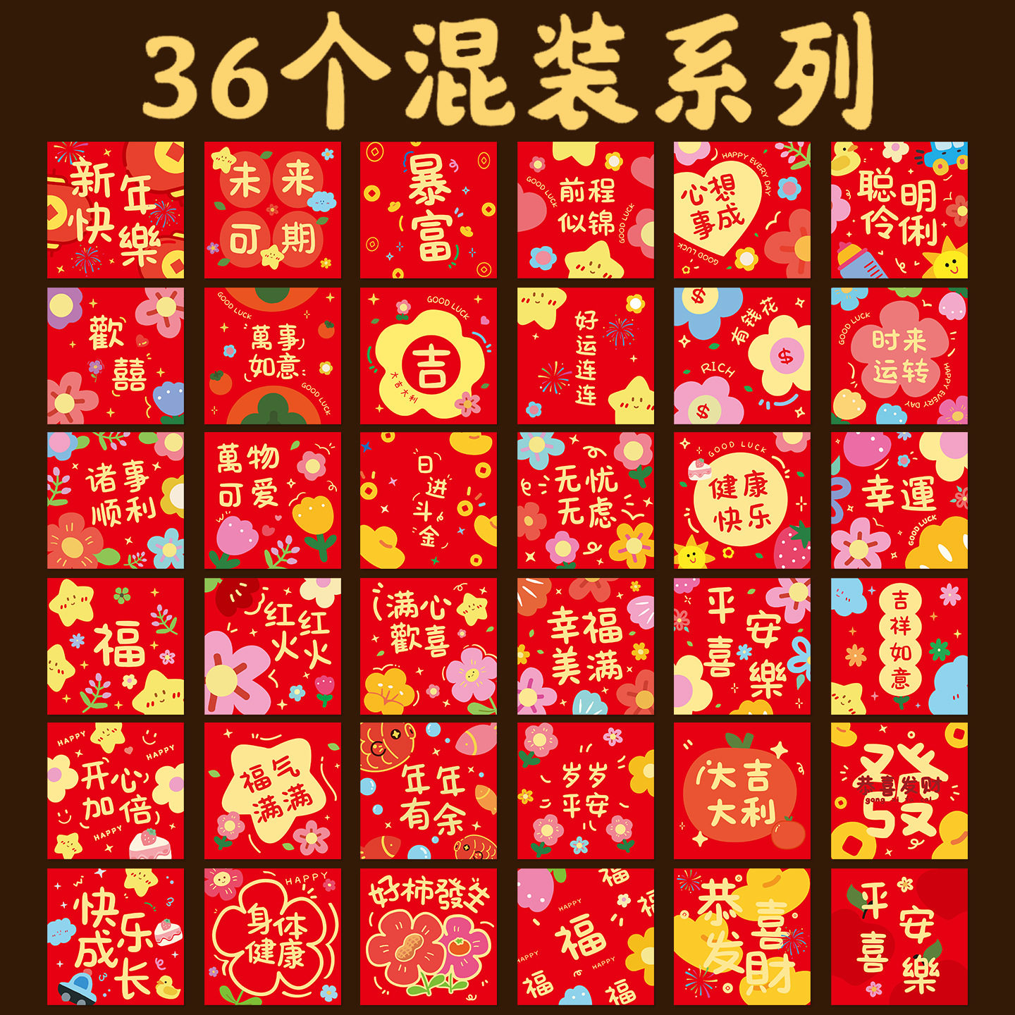 36 Mixed-Style Fresh and Cute 2026 New Year Red Envelopes with Floral and Plant Designs, Spring Festival Lucky Money Envelopes with the Character for Good Fortune