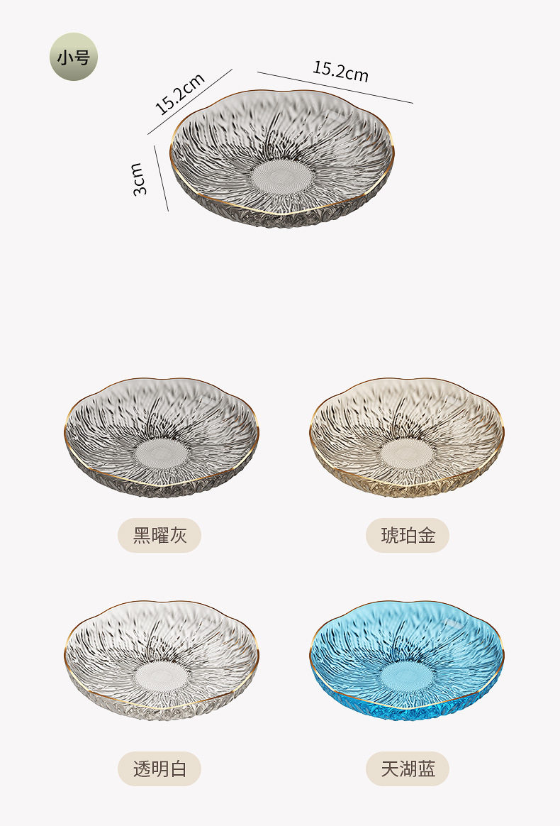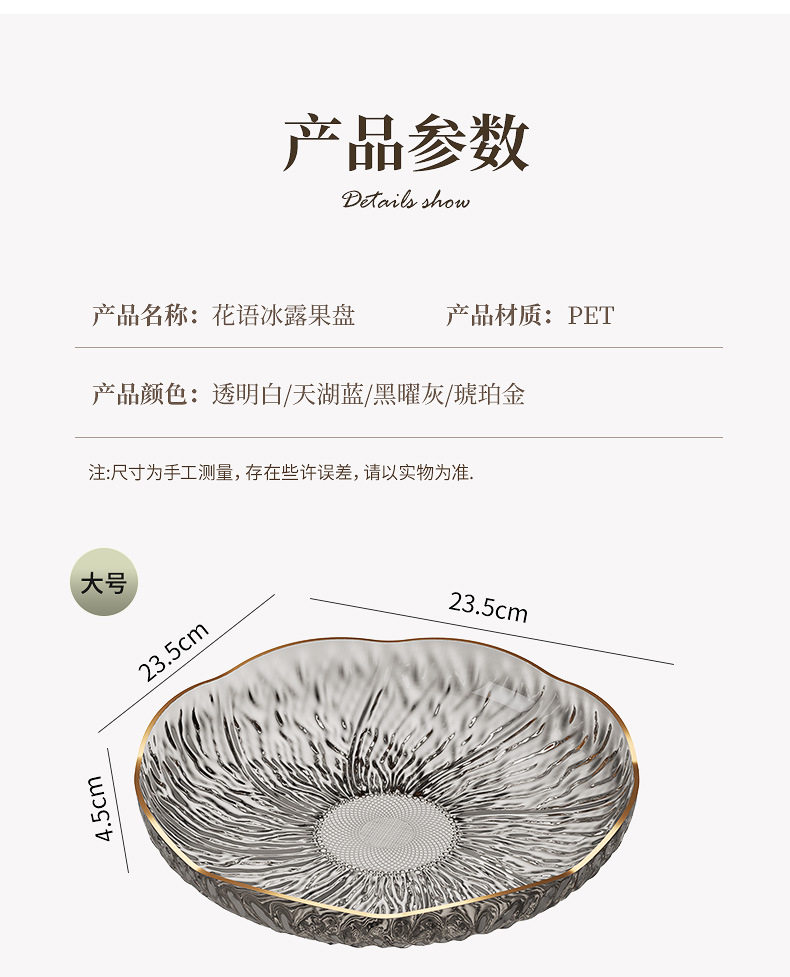 | Color | Ice dew flower plate trumpet (transparent white),Ice dew flower plate small (amber gold),Ice dew flower plate trumpet (tianhu blue),Ice dew flower plate small (obsidian gray),Ice dew flower plate trumpet (festive red),Ice dew flower plate medium (transparent white),Ice dew flower plate medium (amber gold),Ice dew flower plate medium (tianhu blue),Ice dew flower plate medium (obsidian gray),Ice dew flower plate medium (festive red),Ice dew flower plate large (transparent white),Ice dew flower plate large (amber gold),Ice dew flower plate large (tianhu blue),Ice dew flower plate large (obsidian gray),Ice dew flower plate large (festive red),Ice dew flower plate with tall legs (large transparent white),Ice dew flower plate tall legs (large amber gold),Ice dew flower plate with tall legs (large size tianhu blue),Ice dew flower plate with tall legs (large obsidian gray),Ice dew flower plate with tall legs (large festive red),Ice dew flower plate with tall legs (small size transparent white),Ice dew flower plate tall legs (small amber gold),Ice dew flower plate with high legs (small tianhu blue),Ice dew flower plate with high legs (small obsidian gray),Ice dew flower plate with tall legs (small festive red) |