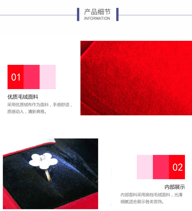 | Specification model | Red; 63*53*37mm single/small ring box,Red; 75*75*43mm double/large ring box,Red; 75*75*43mm pendant box,Red; 93*93*43mm bracelet box,Red; 225*55*30mm long chain box,Gray; 63*53*37mm single/small ring box,Gray; 75*75*43mm double/large ring box,Gray; 75*75*43mm pendant box,Gray; 93*93*43mm bracelet box,Gray; 225*55*30mm long chain box,Blue; 63*53*37mm single/small ring box,Blue; 75*75*43mm double/large ring box,Blue; 75*75*43mm pendant box,Blue; 93*93*43mm bracelet box,Blue; 225*55*30mm long chain box,Black; 63*53*37mm single/small ring box,Black; 75*75*43mm double/large ring box,Black; 75*75*43mm pendant box,Black; 93*93*43mm bracelet box,Black; 225*55*30mm long chain box,Green; 63*53*37mm single/small ring box,Green; 75*75*43mm double/large ring box,Green; 75*75*43mm pendant box,Green; 93*93*43mm bracelet box,Green; 225*55*30mm long chain box,Brown]; 63*53*37mm single/small ring box,Brown]; 75*75*43mm double/large ring box,Brown]; 75*75*43mm pendant box,Brown]; 93*93*43mm bracelet box,Brown]; 225*55*30mm long chain box |
