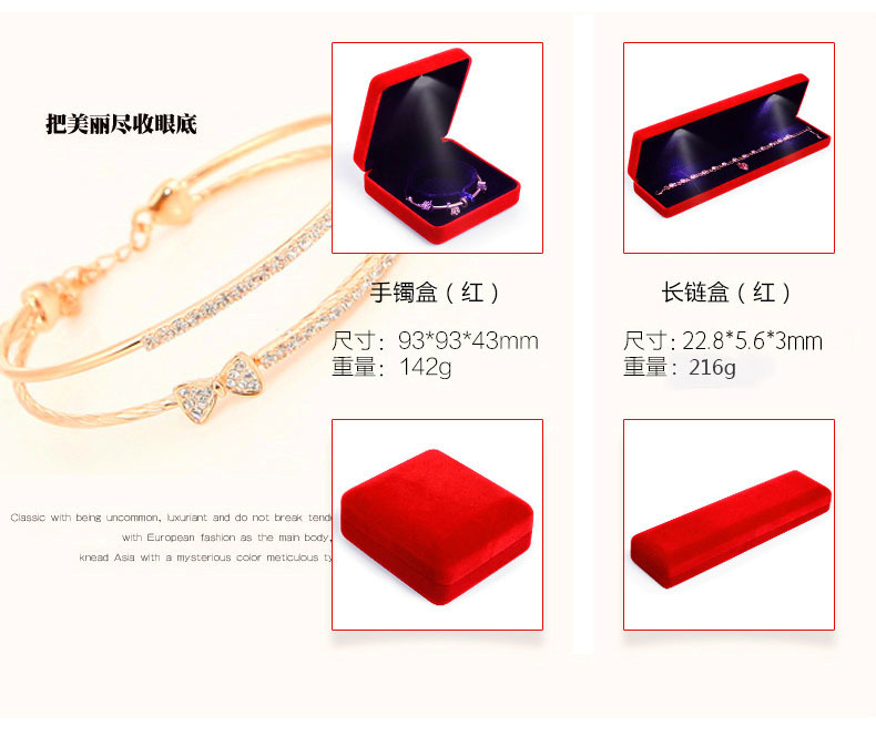 | Specifications | 225*55*30mm long chain box,93*93*43mm bracelet box,75*75*43mm double/large ring box,63*53*37mm single/small ring box,75*75*43mm pendant box |