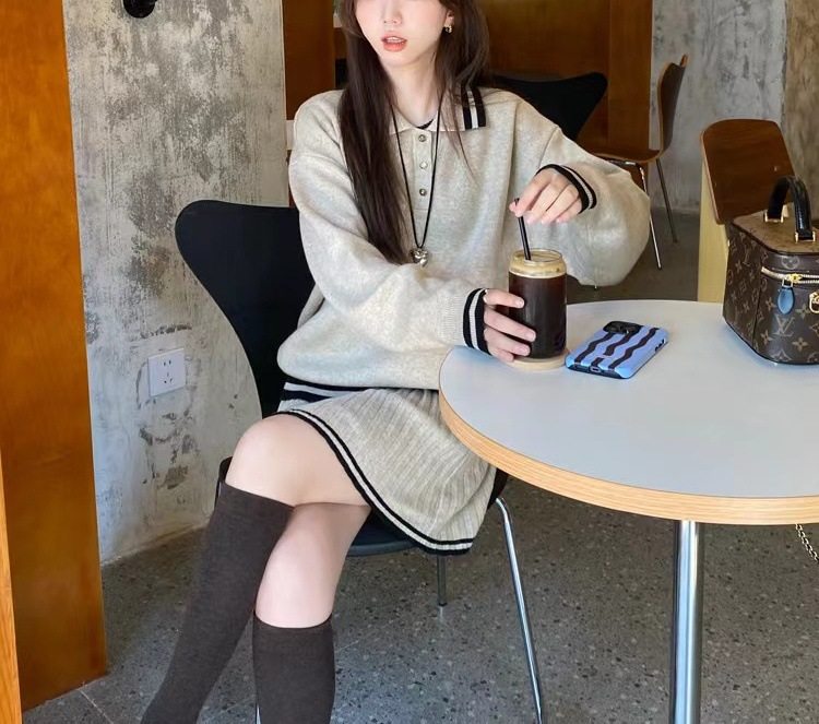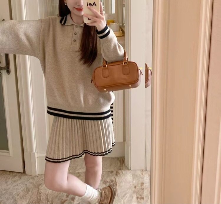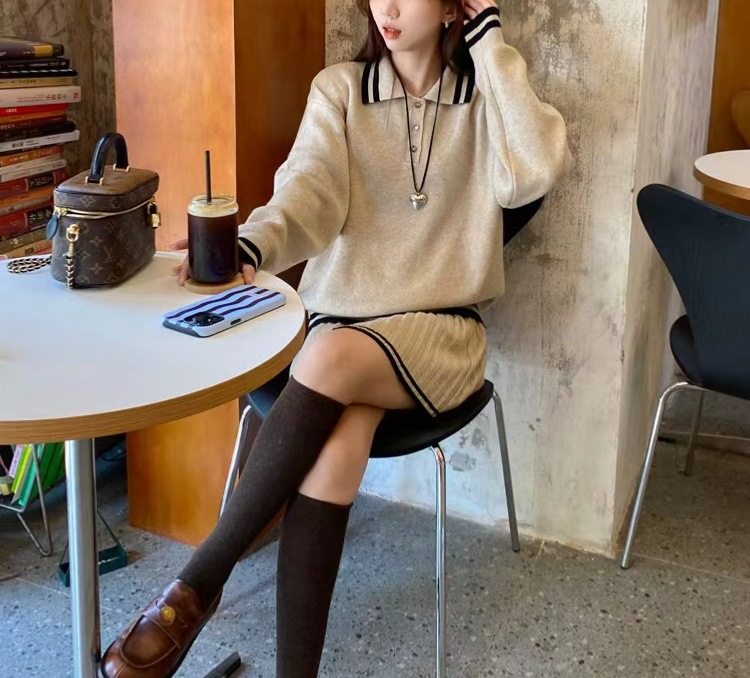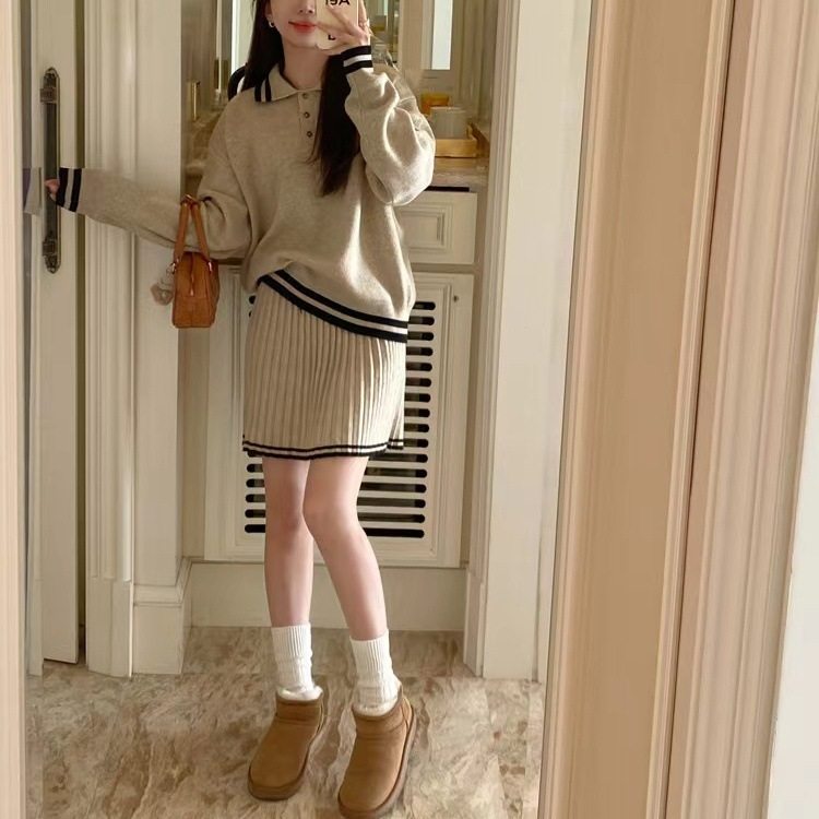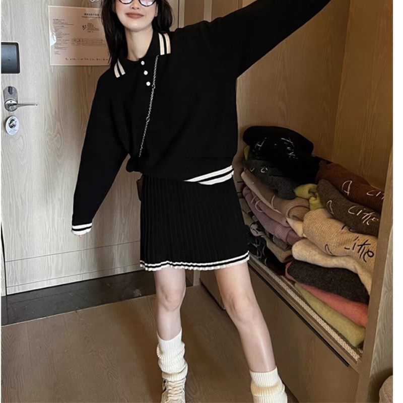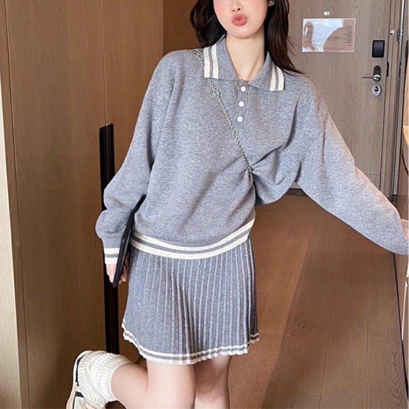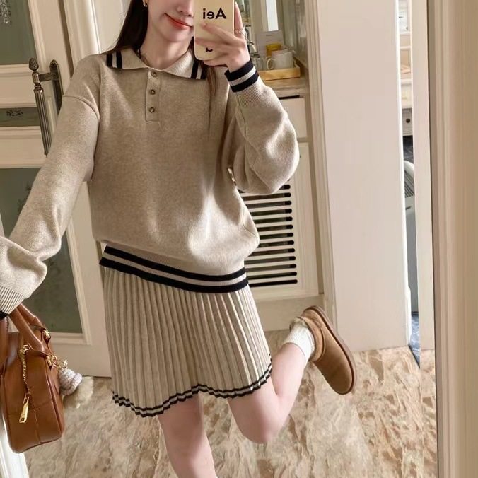 Sweet Elegant Polo Collar Loose Slim Knitted Sweater Women's College Style Autumn New Pleated Skirt Two-Piece Set