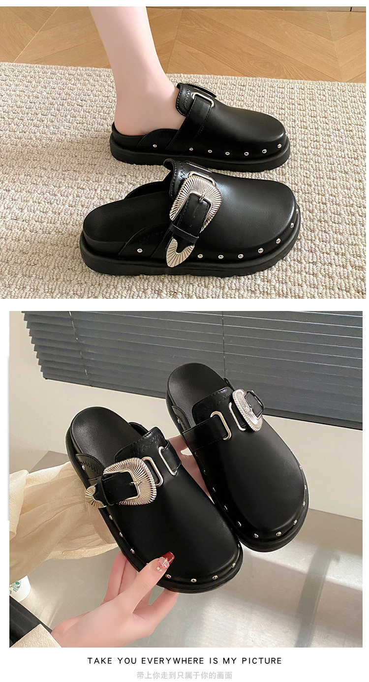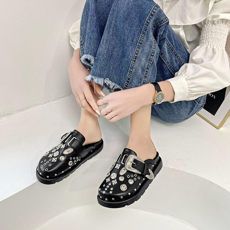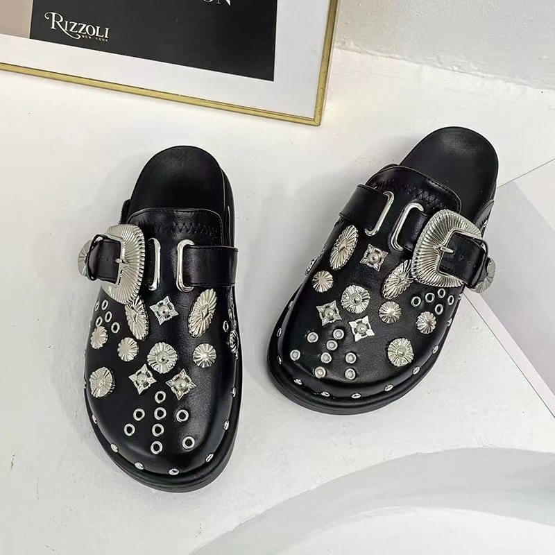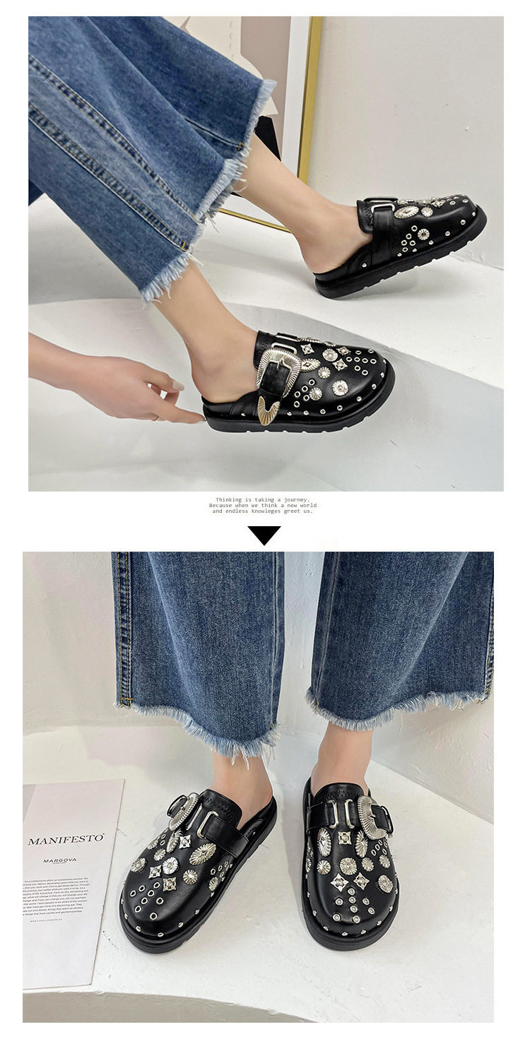 Internet Celebrous Same Shoes with Toe Half-tow Women's 2024 New British Retro Thick Bottom Rivet Flat Mule Shoes